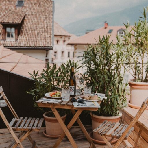 - The newly built roof terrace with a view over the roofs of Lana