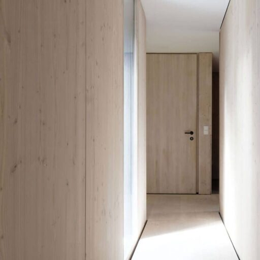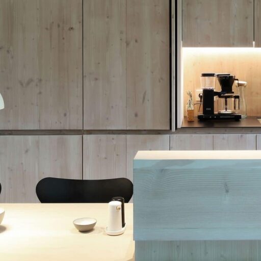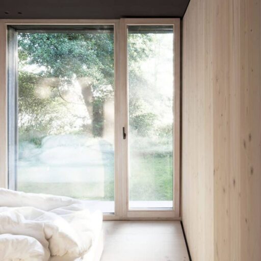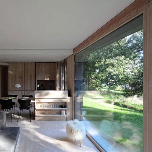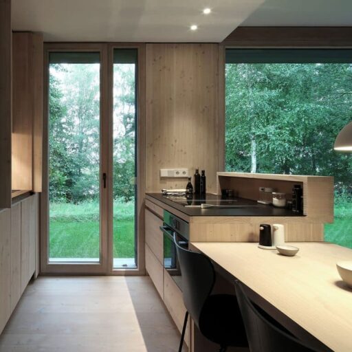 Here you have a front row seat to watch the leaves dancing in the breeze, cranes and herons hunting along the riverbank and the Aller flowing by—no binoculars needed, just settle into the comfortable designer sofa. In every room of the modern, open-plan, wooden house, only the floor-to-ceiling windows separate you from the landscape outside. You could almost forget about the interior if it wasn’t just as great as the view. Here on this enchanted property with mature trees, architect Dirk Michel and his wife Birte Goldberg have deliberately planned a restrained house that doesn’t compete for attention with the star of the show—mother nature. Nevertheless, the simple architecture inspires with its pared back forms, an ecological wooden construction, panoramic windows, and rooms that open up to the garden and the river. In keeping, the furnishings are minimalist and perfectly staged, consisting of custom-made built-in furniture made of Douglas fir wood, combined with some designer pieces. Comfort is provided by the light, warm wood on the floors and walls and, of course, the large sofa corner with fireplace, which can be difficult to leave. The kitchen is not only beautiful, but also very well equipped. Every comfort is provided, nothing is lacking, except perhaps more time by the Aller to experience the passing seasons. The only thing to do is to return for more.