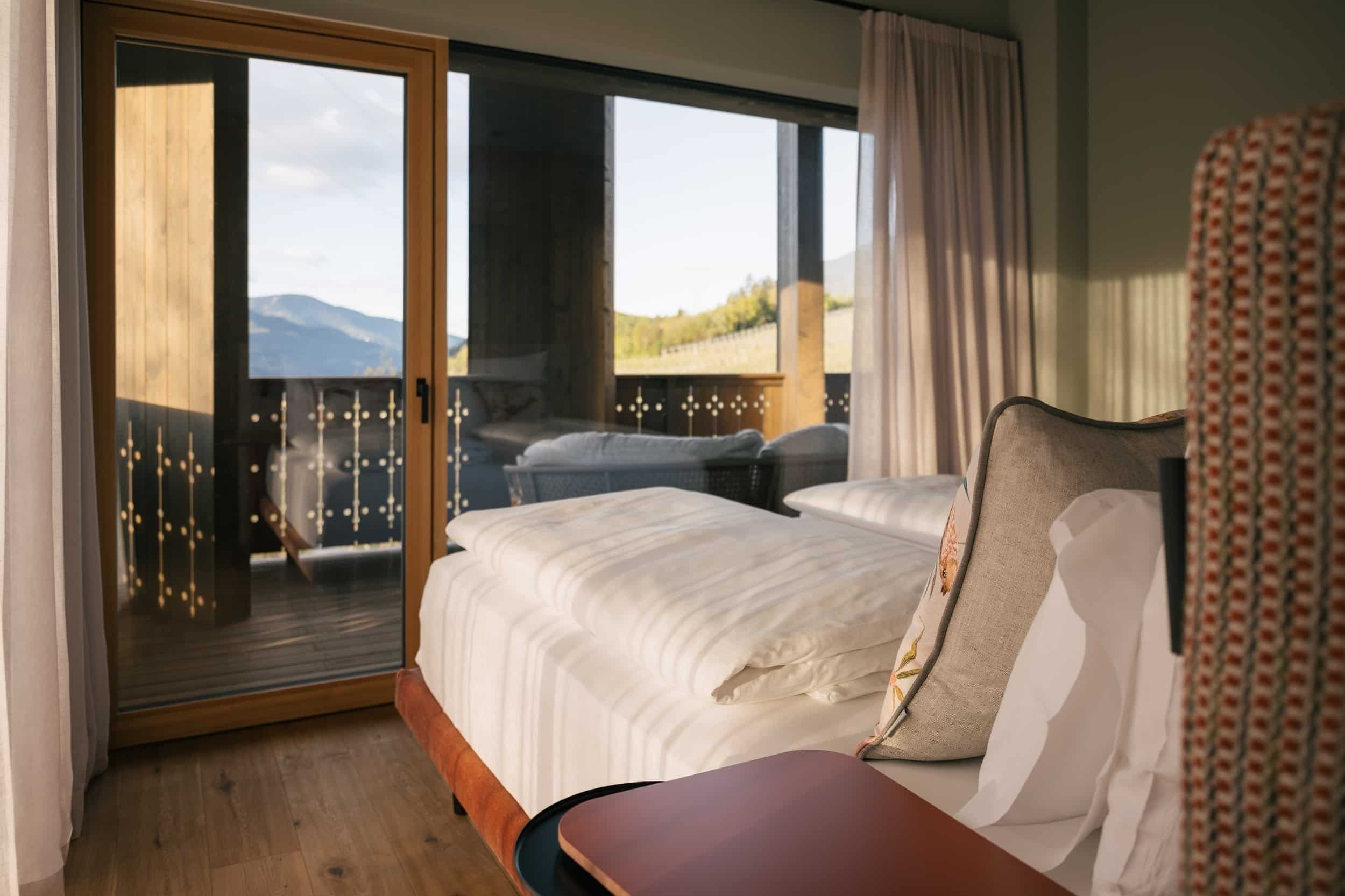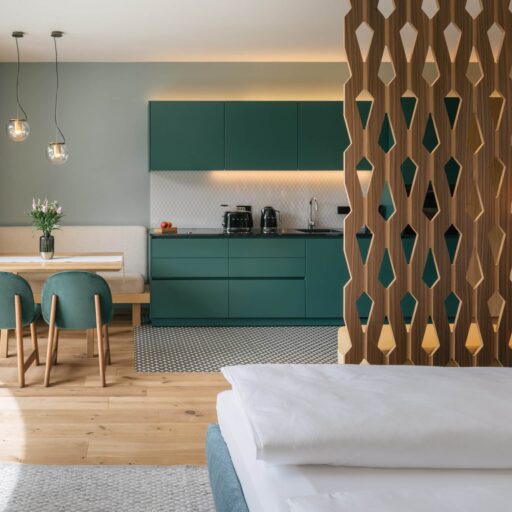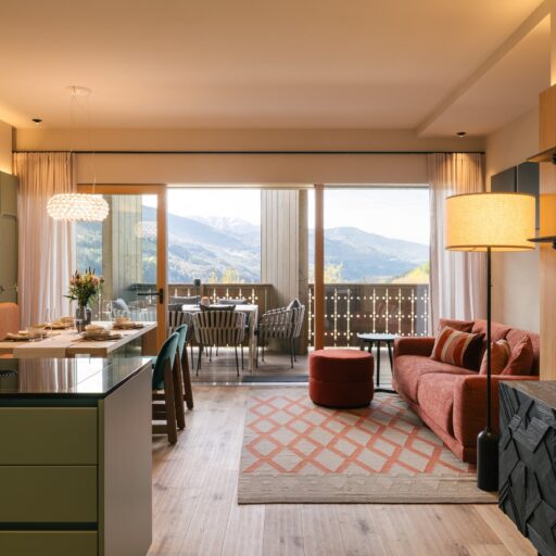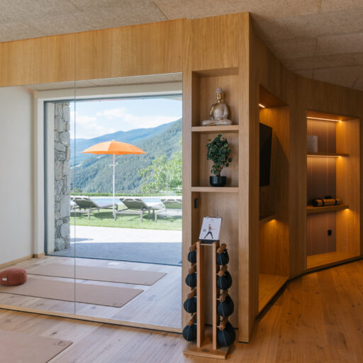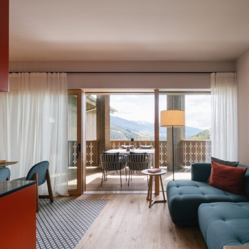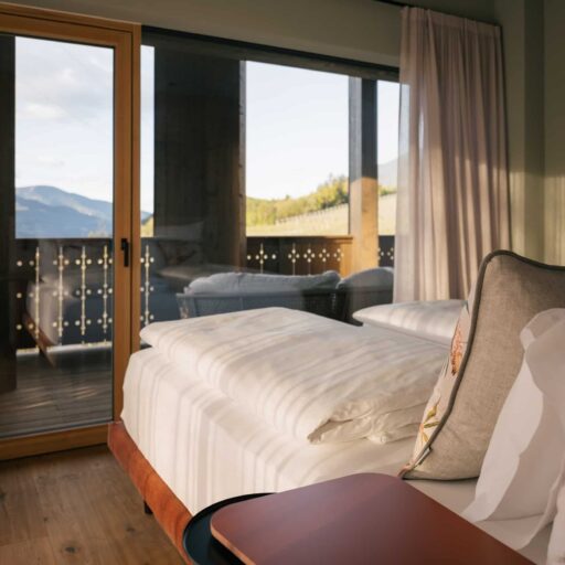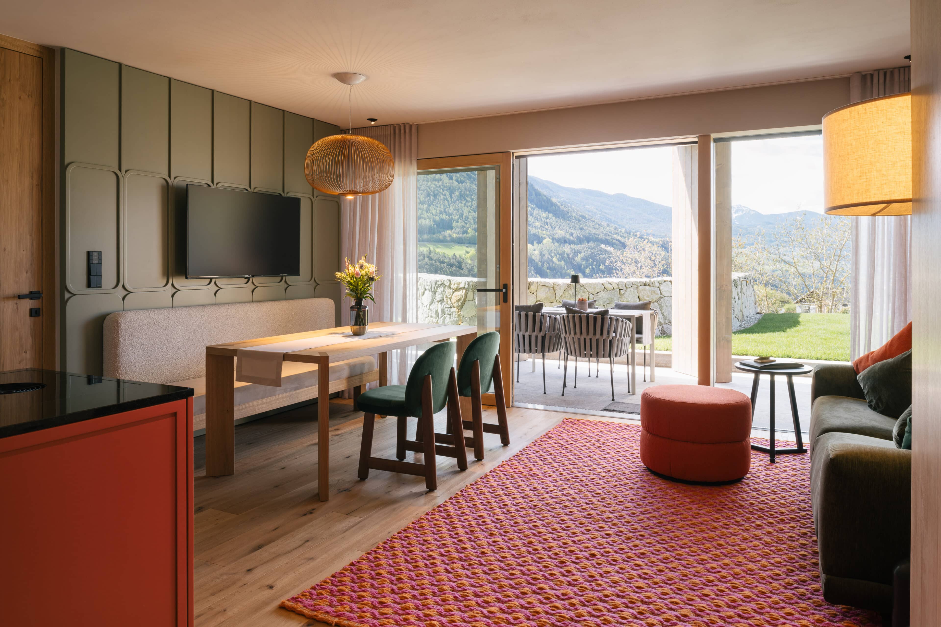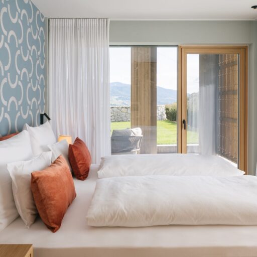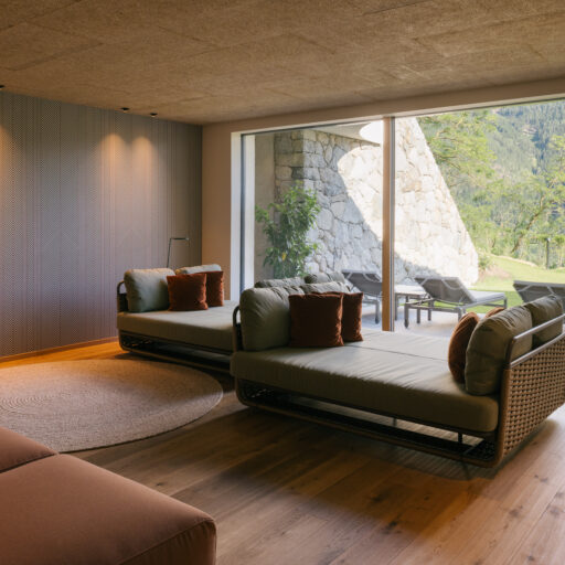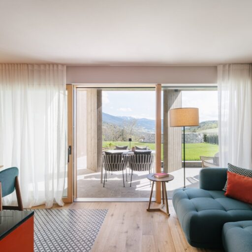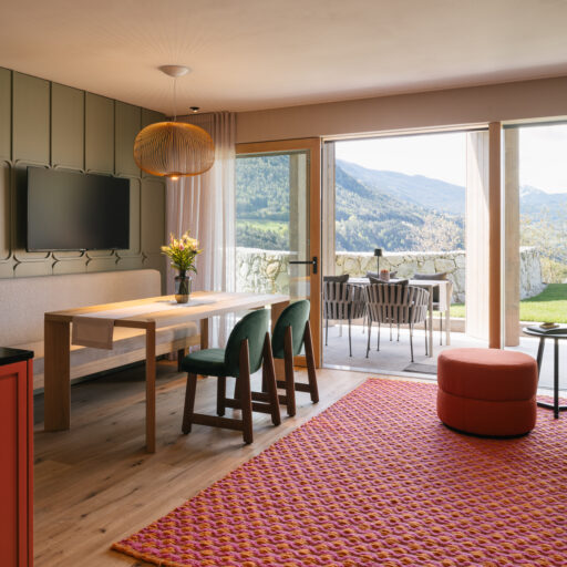 With a view like this, you don’t really need any wall decorations! The large panoramic windows frame the Isarco Valley landscape, easily competing with many a classic painting. The architecture of the luxury apartment building sets the scene for nature. Guests can enjoy the view of orchards, forests and vineyards from any number of perspectives: Waking up in the bedroom, relaxing on the private loggias and terraces that are part of the accommodation or while dining together in the open-plan living rooms. The Nature Hideaway in the village of Natz, situated on a sunny high plateau, was designed in the style of a traditional South Tyrolean farmstead and consists of two units. Local materials such as stone and wood combined with lime-plastered brickwork give the five apartments a traditional and cozy look, complemented by a lively color concept with contemporary design elements in petrol, rust red, emerald green or mustard yellow. The two hosts, brothers Otmar and Thomas Michaeler, grew up in the nearby Hotel Ploseblick. So they’re accustomed to welcoming guests from all over the world, while being deeply rooted in the region. In mild temperatures, you can go on leisurely hikes through the apple orchards, ride a mountain bike up to the alpine pasture or cycle along the valley. In the winter, you can whizz down the slopes of the nearby ski resorts. And Brixen with its arcades, alleyways, museums, cafés and good restaurants is worth a visit all year round. Feeling pleasantly tired from all the excursions, let yourself really unwind in the hotel’s spa. Did we mention the fantastic view? Thanks to the floor-to-ceiling panoramic window, the view from the relaxation room is sensational, leaving you looking forward to spending the next day of your vacation in this fantastic setting.