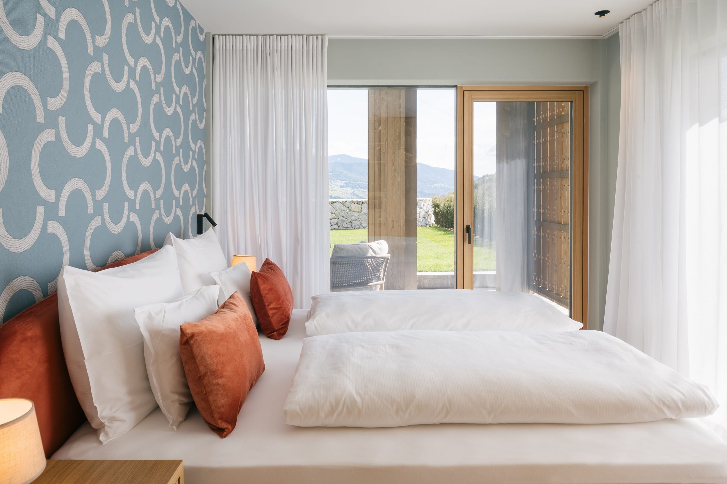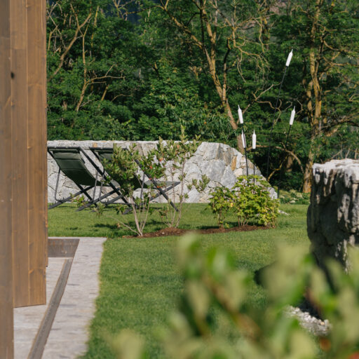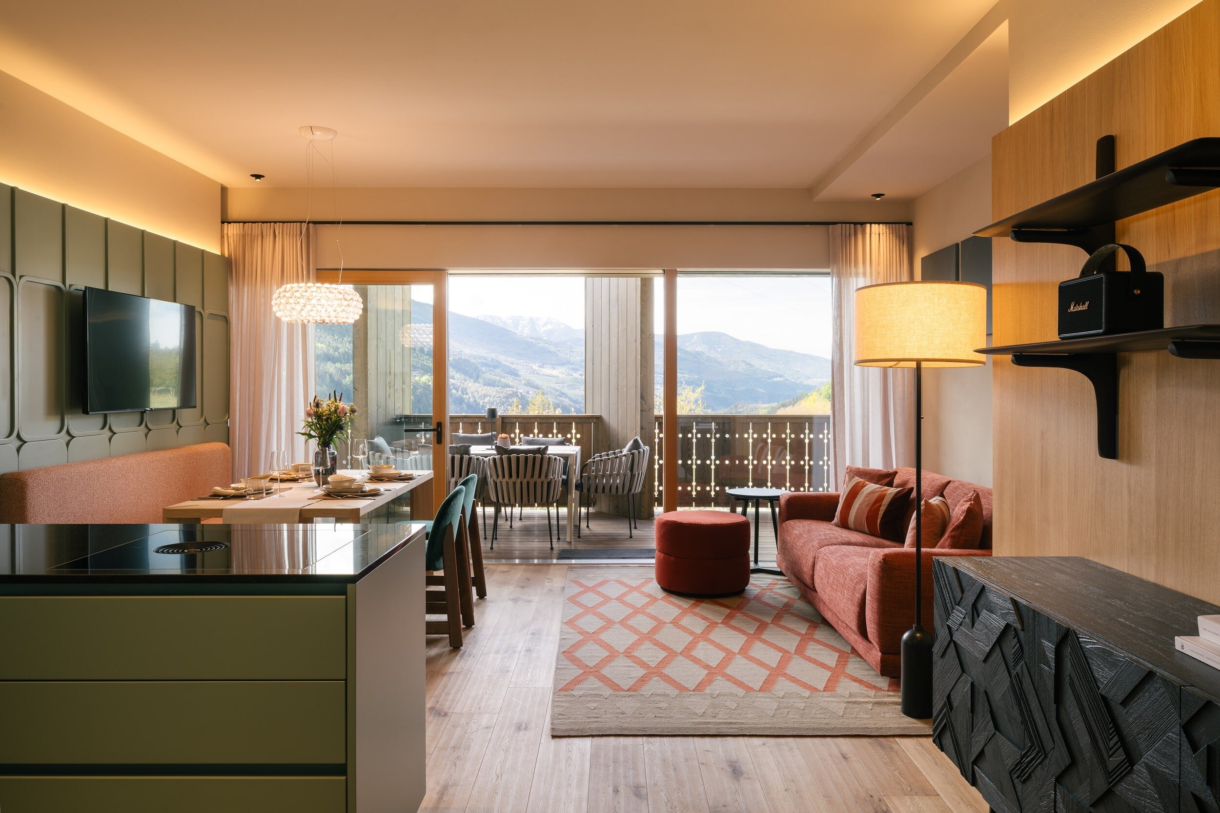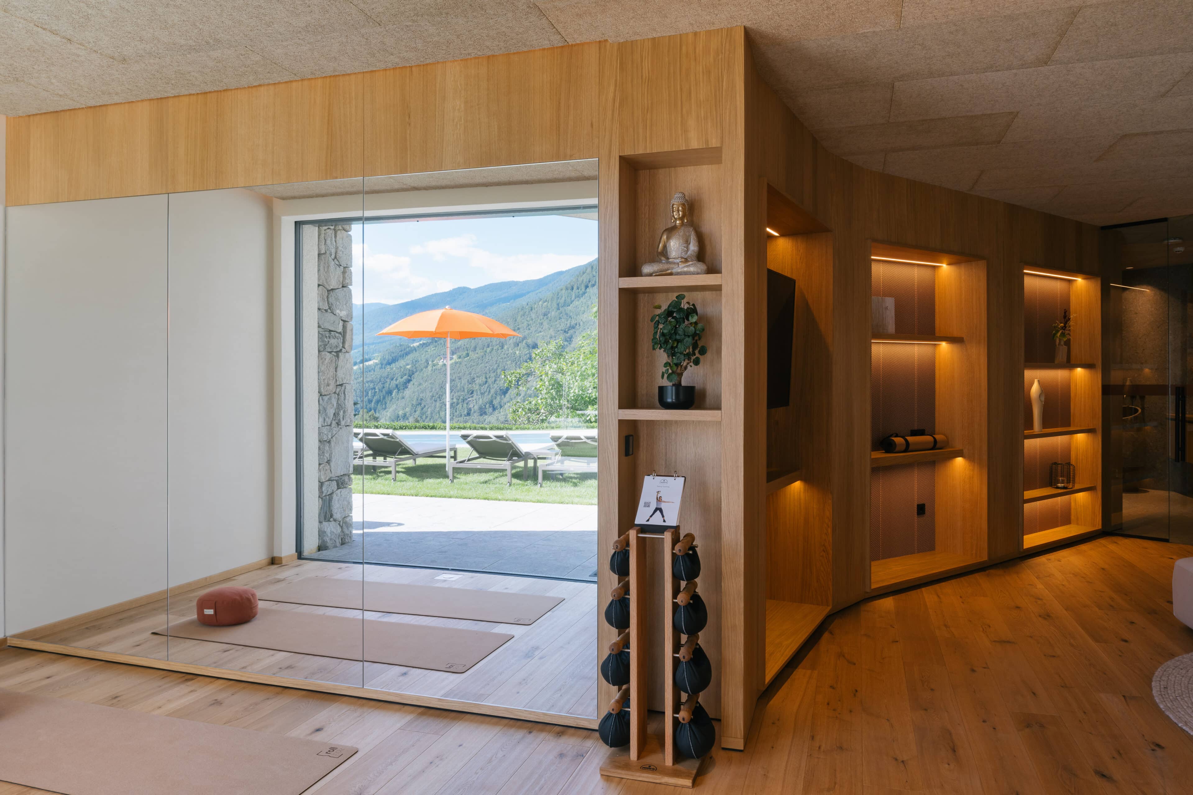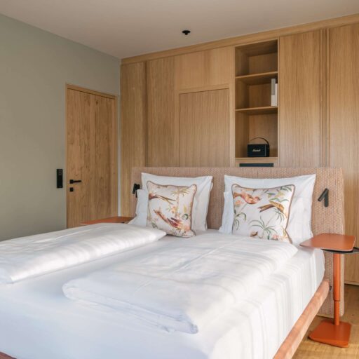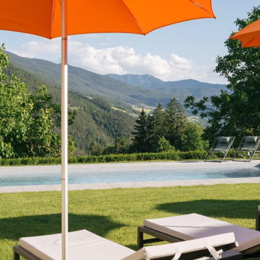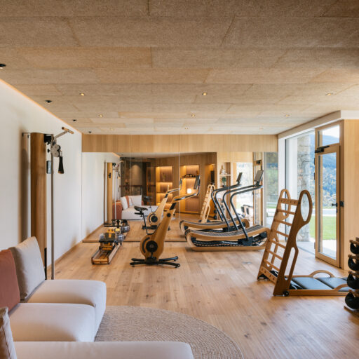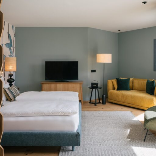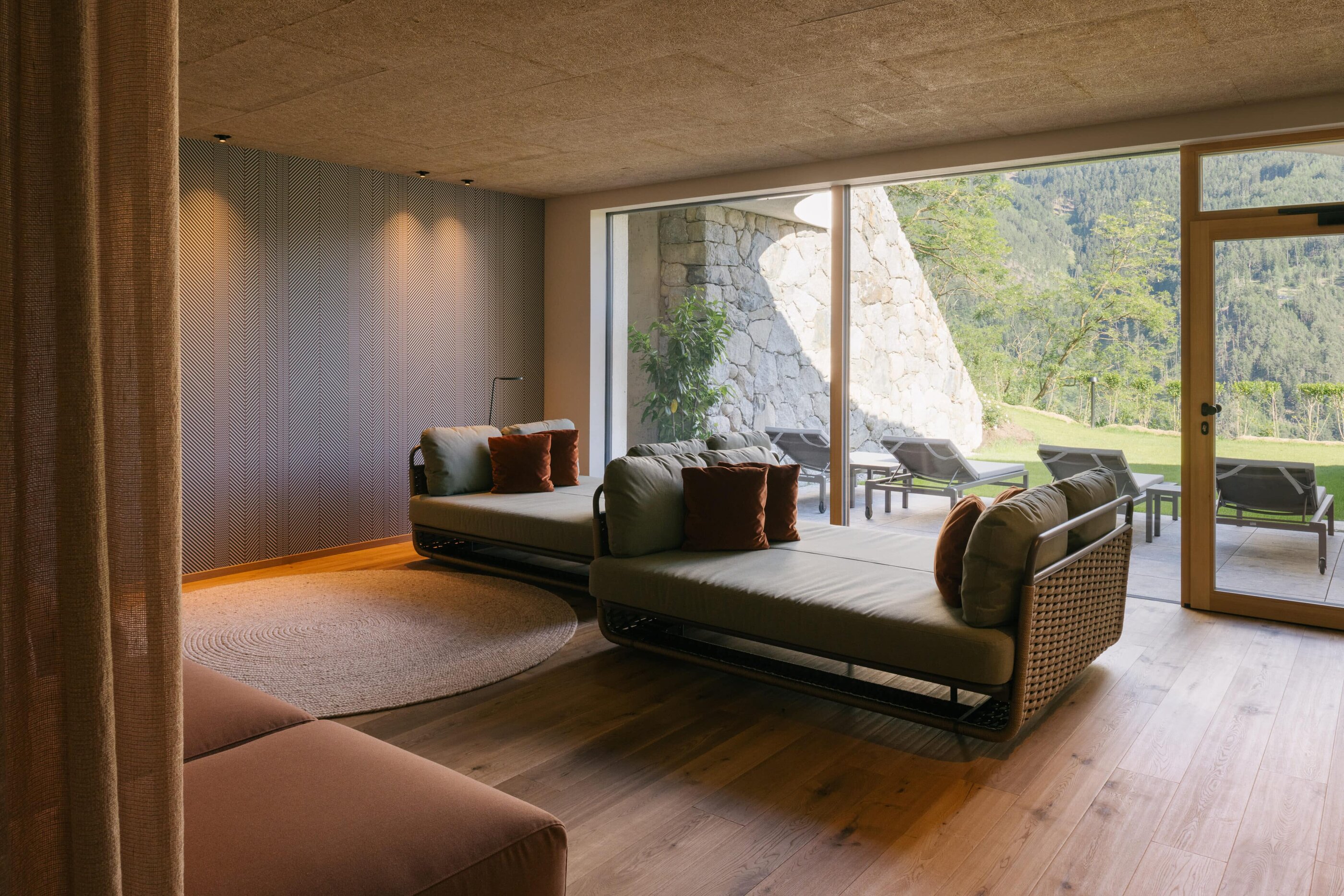 With a view like this, you don’t really need any wall decorations! The large panoramic windows frame the Isarco Valley landscape, easily competing with many a classic painting. The architecture of the luxury apartment building sets the scene for nature. Guests can enjoy the view of orchards, forests and vineyards from any number of perspectives: Waking up in the bedroom, relaxing on the private loggias and terraces that are part of the accommodation or while dining together in the open-plan living rooms. The Nature Hideaway in the village of Natz, situated on a sunny high plateau, was designed in the style of a traditional South Tyrolean farmstead and consists of two units. Local materials such as stone and wood combined with lime-plastered brickwork give the five apartments a traditional and cozy look, complemented by a lively color concept with contemporary design elements in petrol, rust red, emerald green or mustard yellow. The two hosts, brothers Otmar and Thomas Michaeler, grew up in the nearby Hotel Ploseblick. So they’re accustomed to welcoming guests from all over the world, while being deeply rooted in the region. In mild temperatures, you can go on leisurely hikes through the apple orchards, ride a mountain bike up to the alpine pasture or cycle along the valley. In the winter, you can whizz down the slopes of the nearby ski resorts. And Brixen with its arcades, alleyways, museums, cafés and good restaurants is worth a visit all year round. Feeling pleasantly tired from all the excursions, let yourself really unwind in the hotel’s spa. Did we mention the fantastic view? Thanks to the floor-to-ceiling panoramic window, the view from the relaxation room is sensational, leaving you looking forward to spending the next day of your vacation in this fantastic setting.