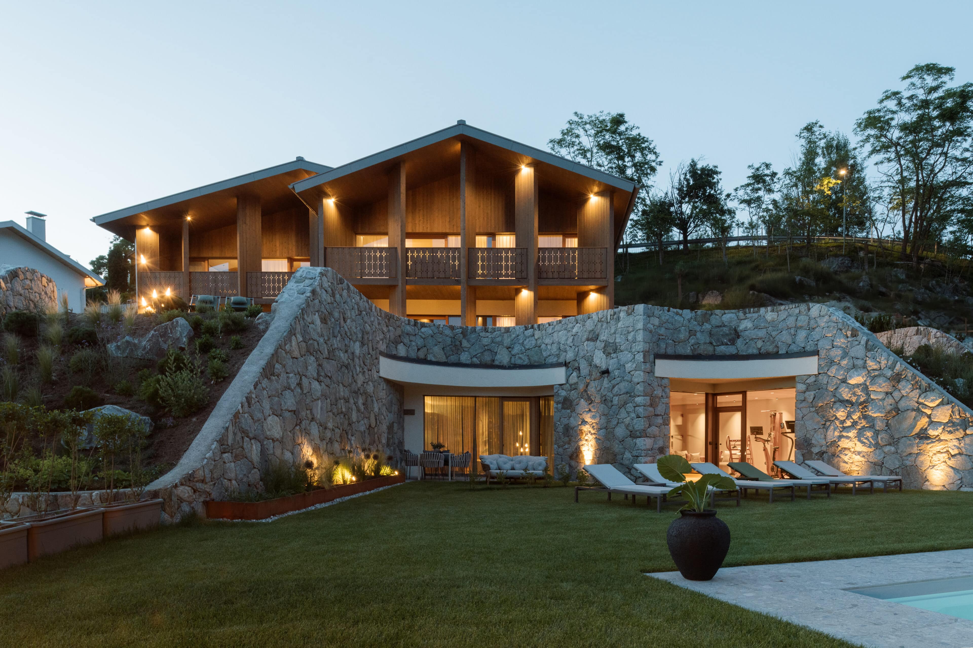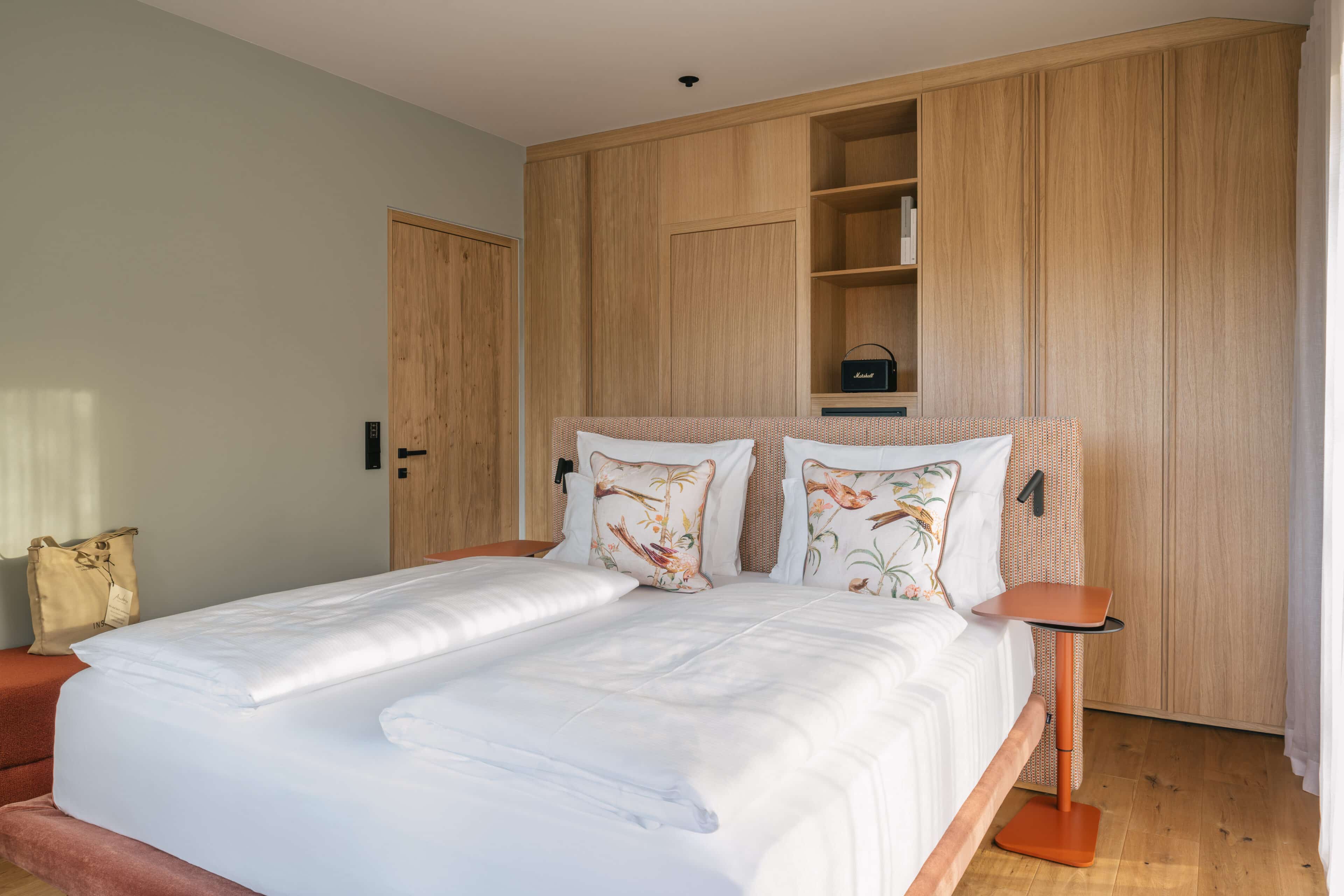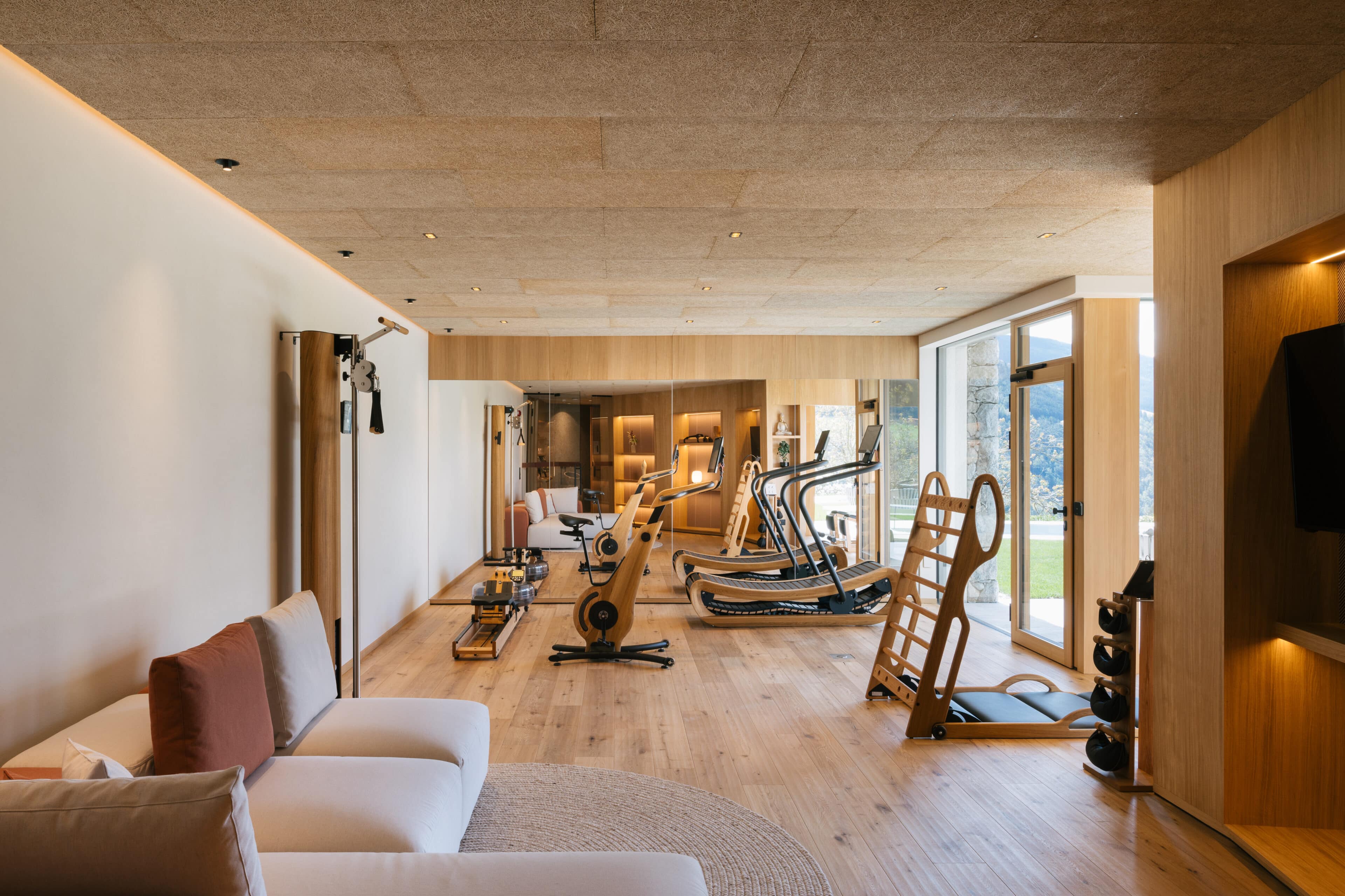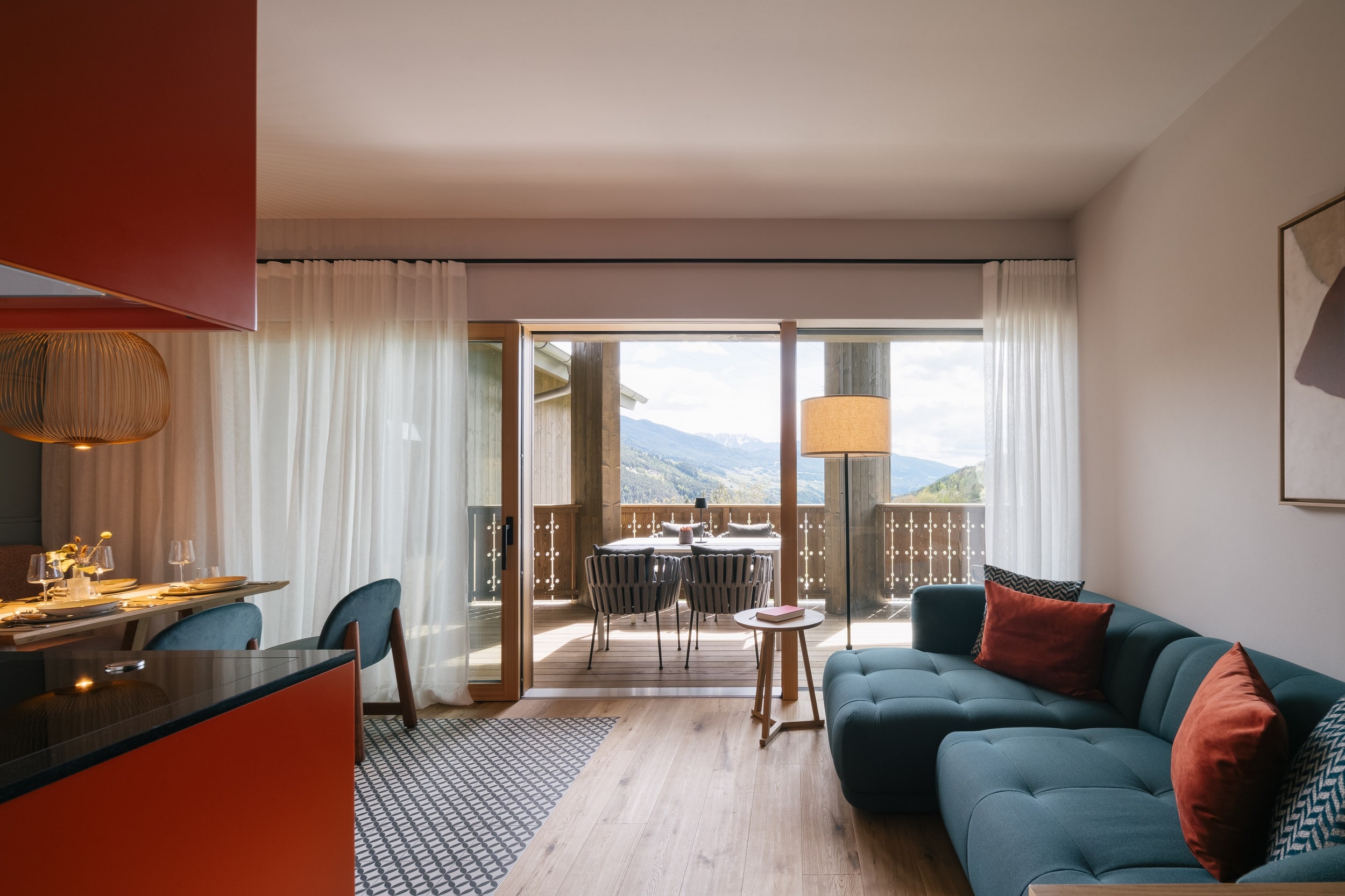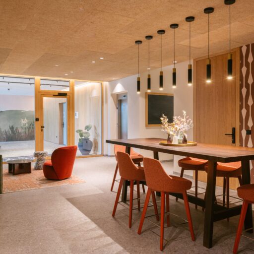 With a view like this, you don’t really need any wall decorations! The large panoramic windows frame the Isarco Valley landscape, easily competing with many a classic painting. The architecture of the luxury apartment building sets the scene for nature. Guests can enjoy the view of orchards, forests and vineyards from any number of perspectives: Waking up in the bedroom, relaxing on the private loggias and terraces that are part of the accommodation or while dining together in the open-plan living rooms. The Nature Hideaway in the village of Natz, situated on a sunny high plateau, was designed in the style of a traditional South Tyrolean farmstead and consists of two units. Local materials such as stone and wood combined with lime-plastered brickwork give the five apartments a traditional and cozy look, complemented by a lively color concept with contemporary design elements in petrol, rust red, emerald green or mustard yellow. The two hosts, brothers Otmar and Thomas Michaeler, grew up in the nearby Hotel Ploseblick. So they’re accustomed to welcoming guests from all over the world, while being deeply rooted in the region. In mild temperatures, you can go on leisurely hikes through the apple orchards, ride a mountain bike up to the alpine pasture or cycle along the valley. In the winter, you can whizz down the slopes of the nearby ski resorts. And Brixen with its arcades, alleyways, museums, cafés and good restaurants is worth a visit all year round. Feeling pleasantly tired from all the excursions, let yourself really unwind in the hotel’s spa. Did we mention the fantastic view? Thanks to the floor-to-ceiling panoramic window, the view from the relaxation room is sensational, leaving you looking forward to spending the next day of your vacation in this fantastic setting.