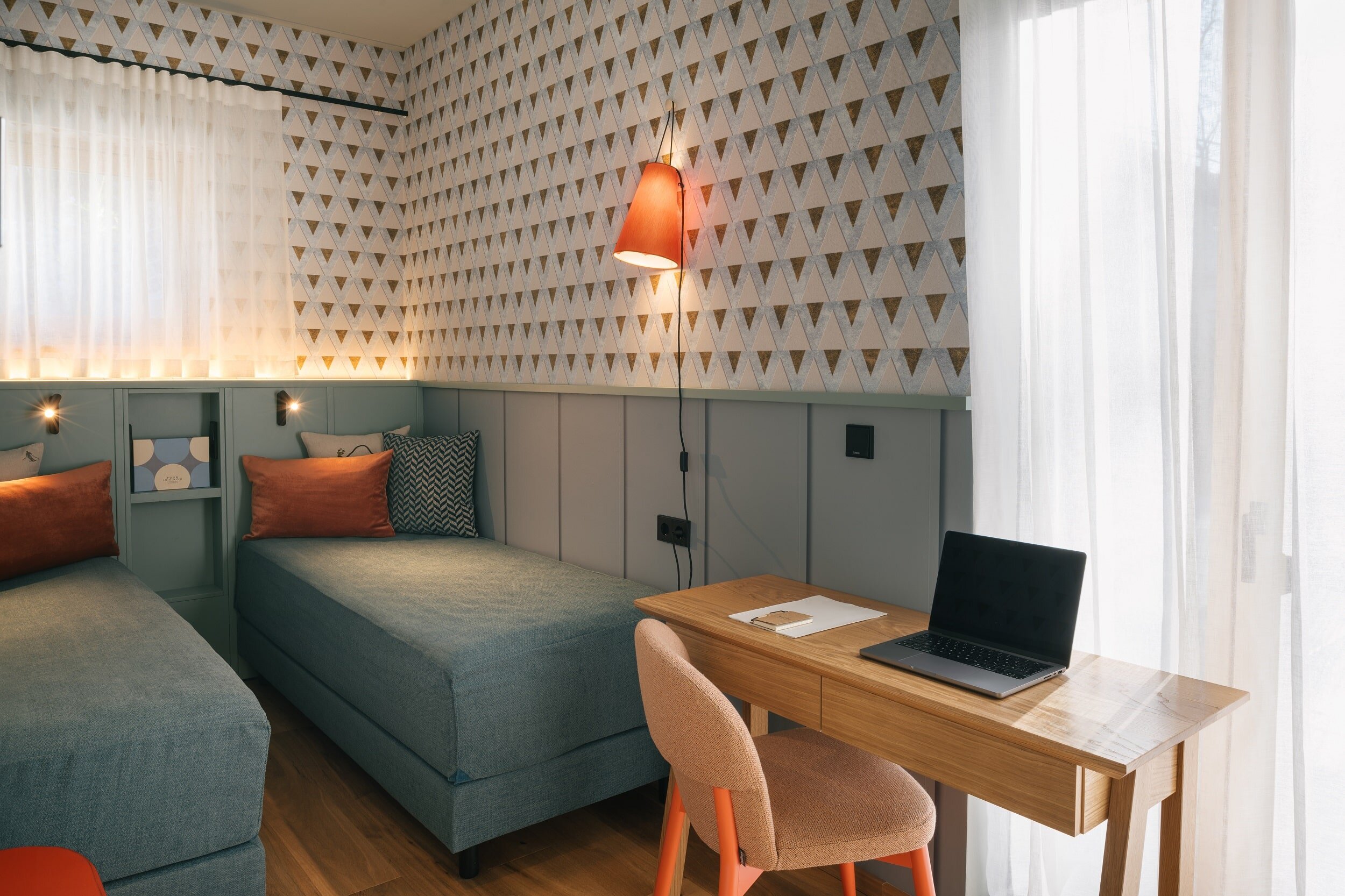 - Designer wallpaper and colorful wood paneling create exciting accents.