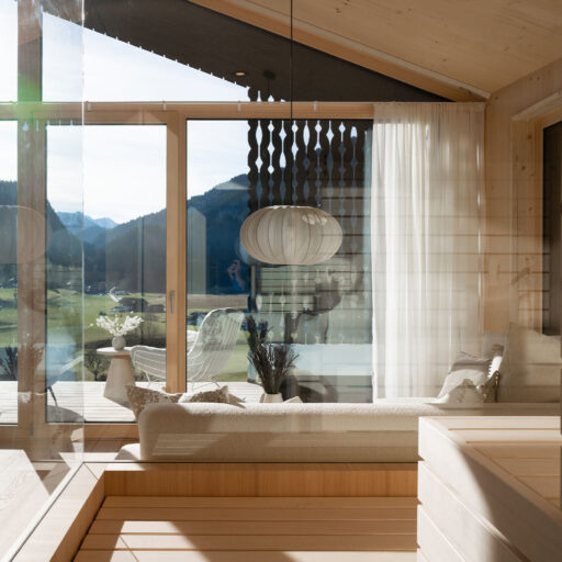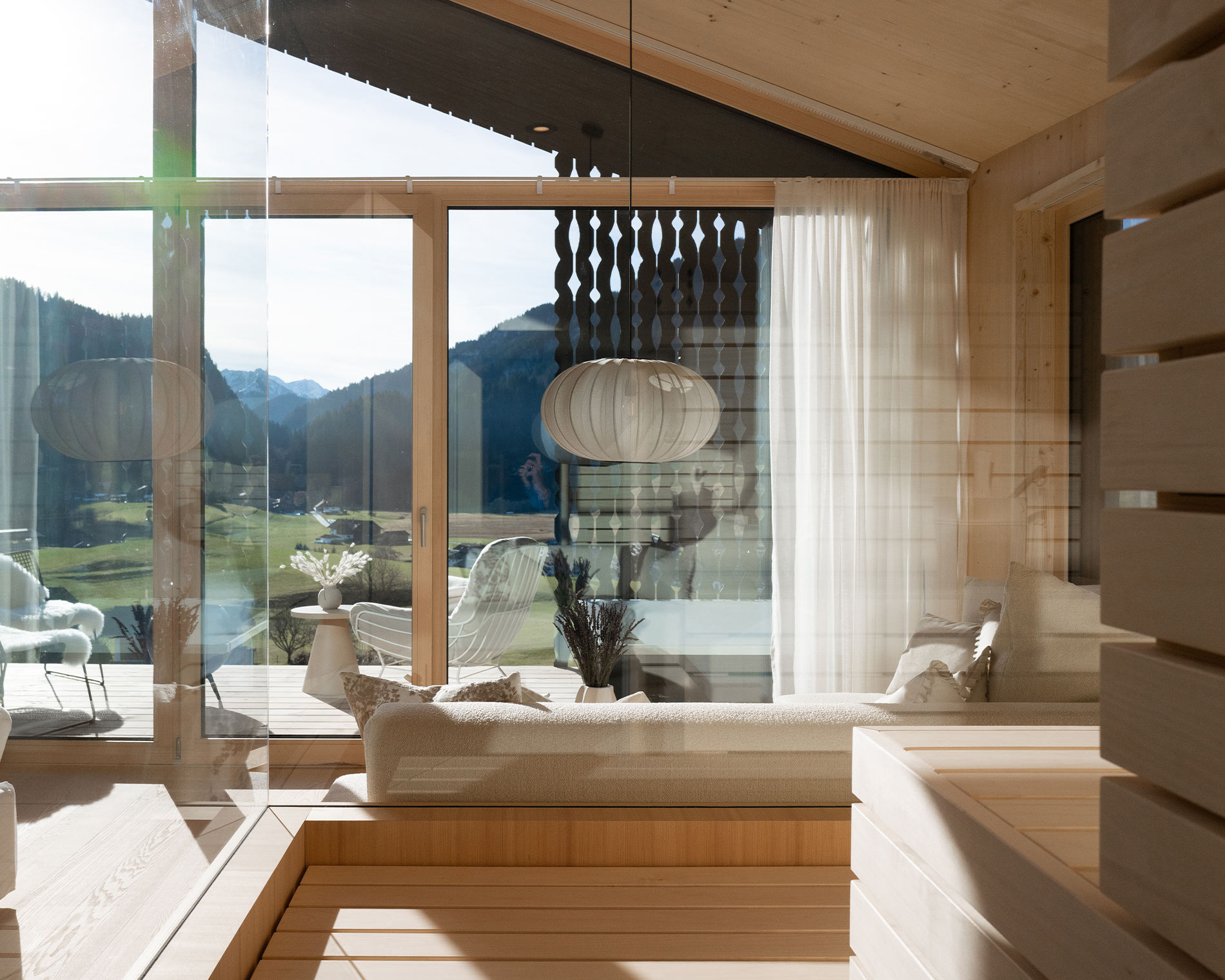 • Each lodge has its own sauna. Oils from the region fill the room with natural scents and the large panoramic windows offer a view of the mountains.