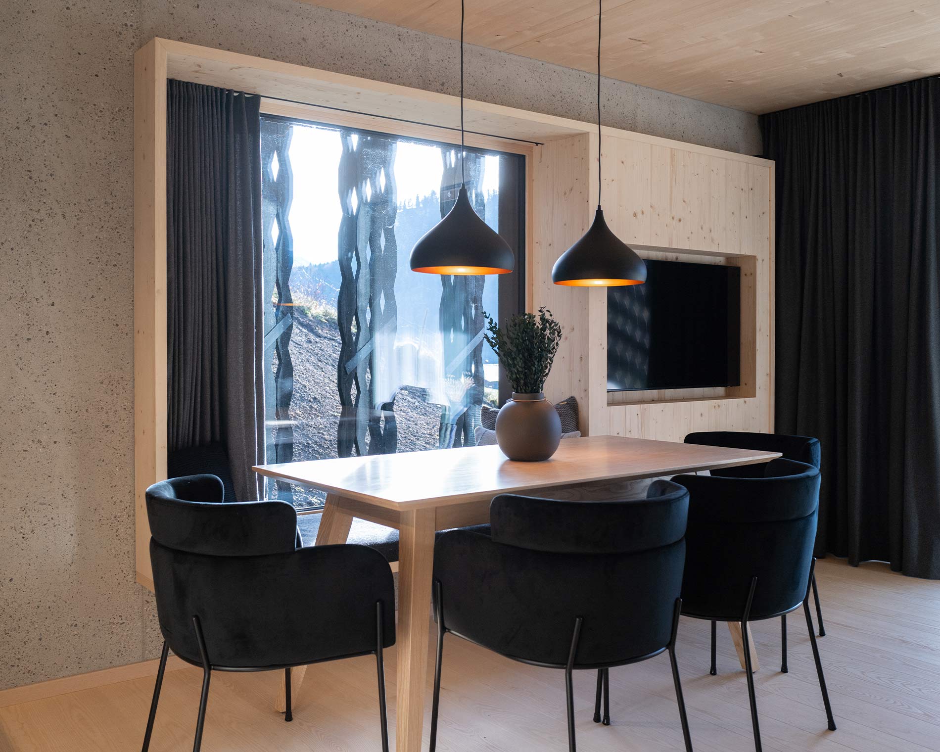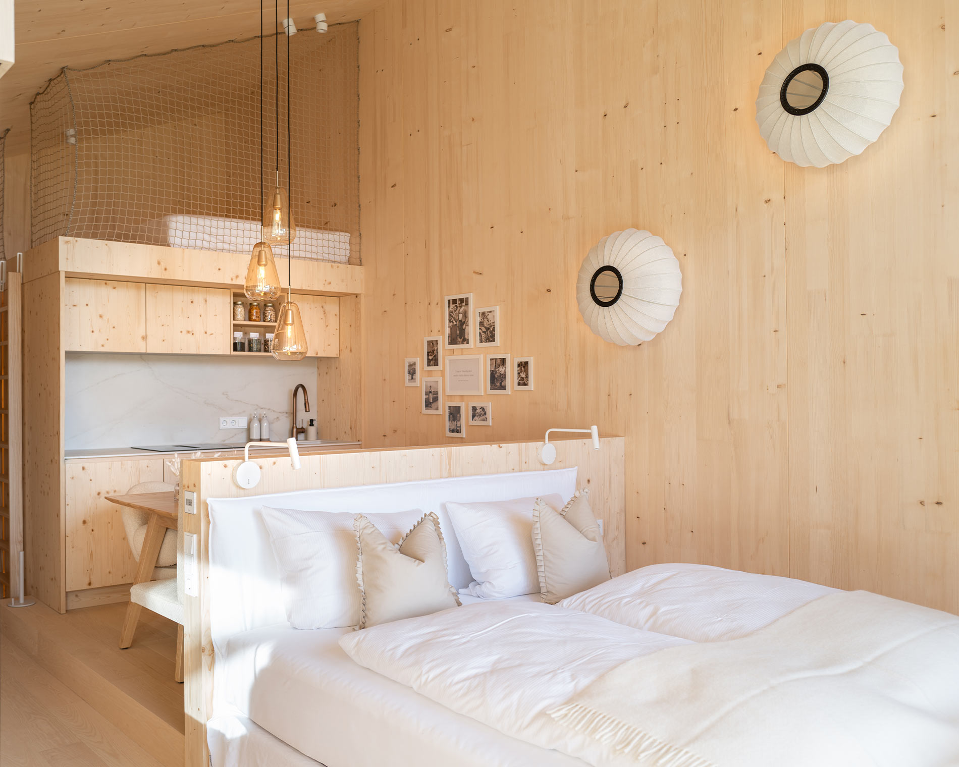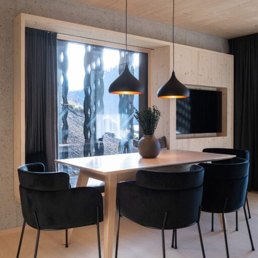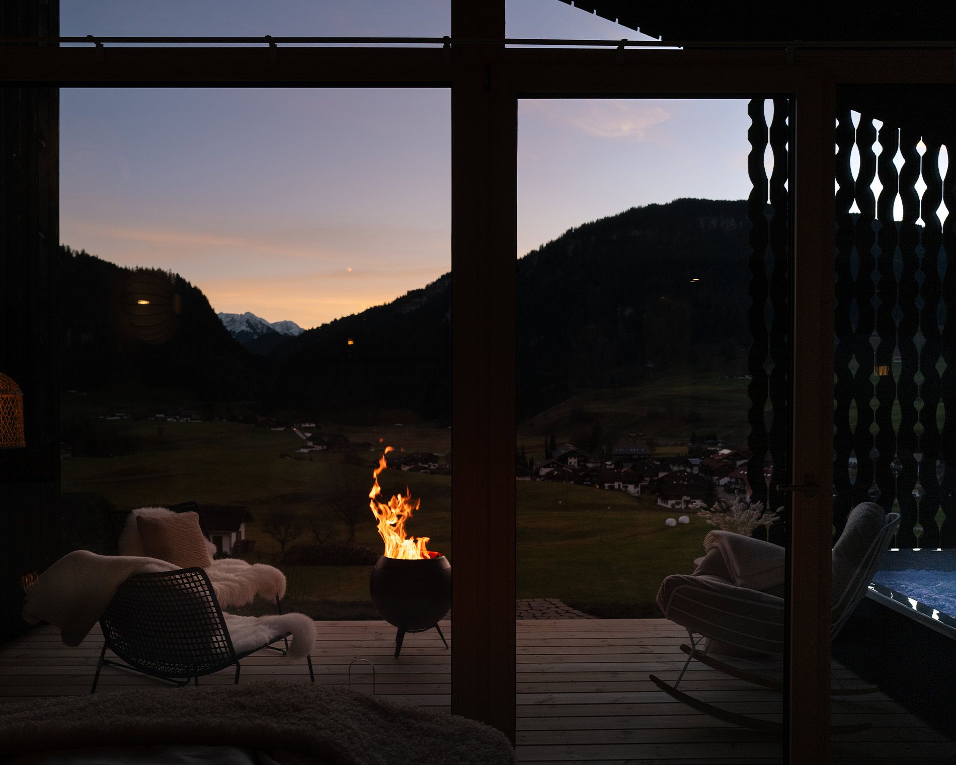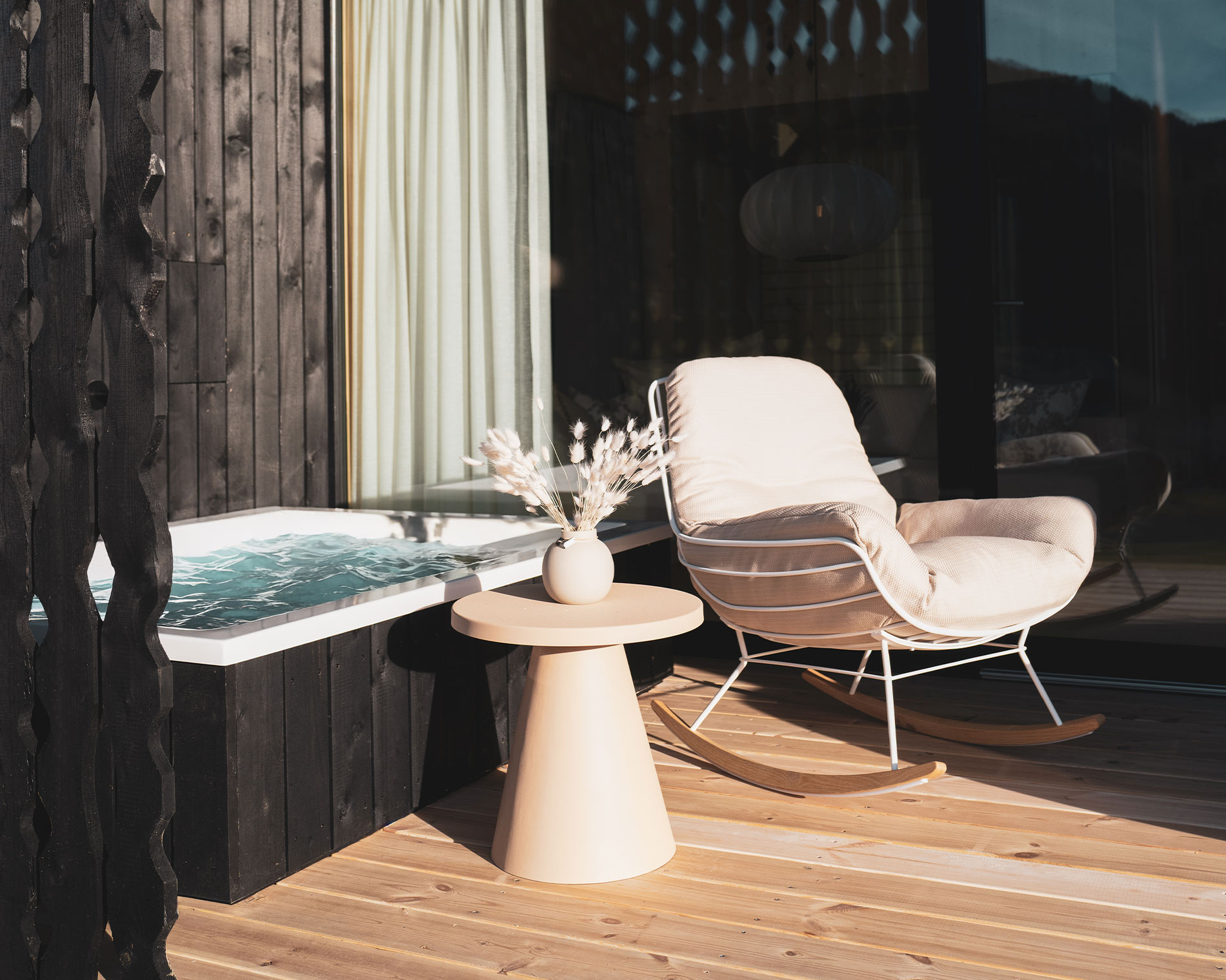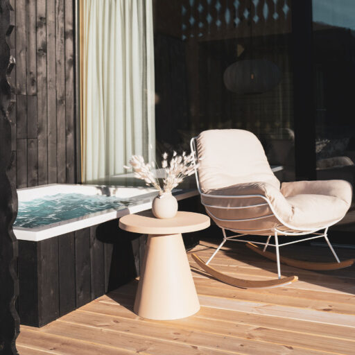 • Lodge Cilli is 44 square meters in size and can accommodate two to four people (including two children, who can sleep in a sleeping alcove on the gallery). It’s on the ground floor, is slightly more compact, and also has a sauna. The loggia features an outdoor whirlpool tub, a fire pit, and comfortable seating.