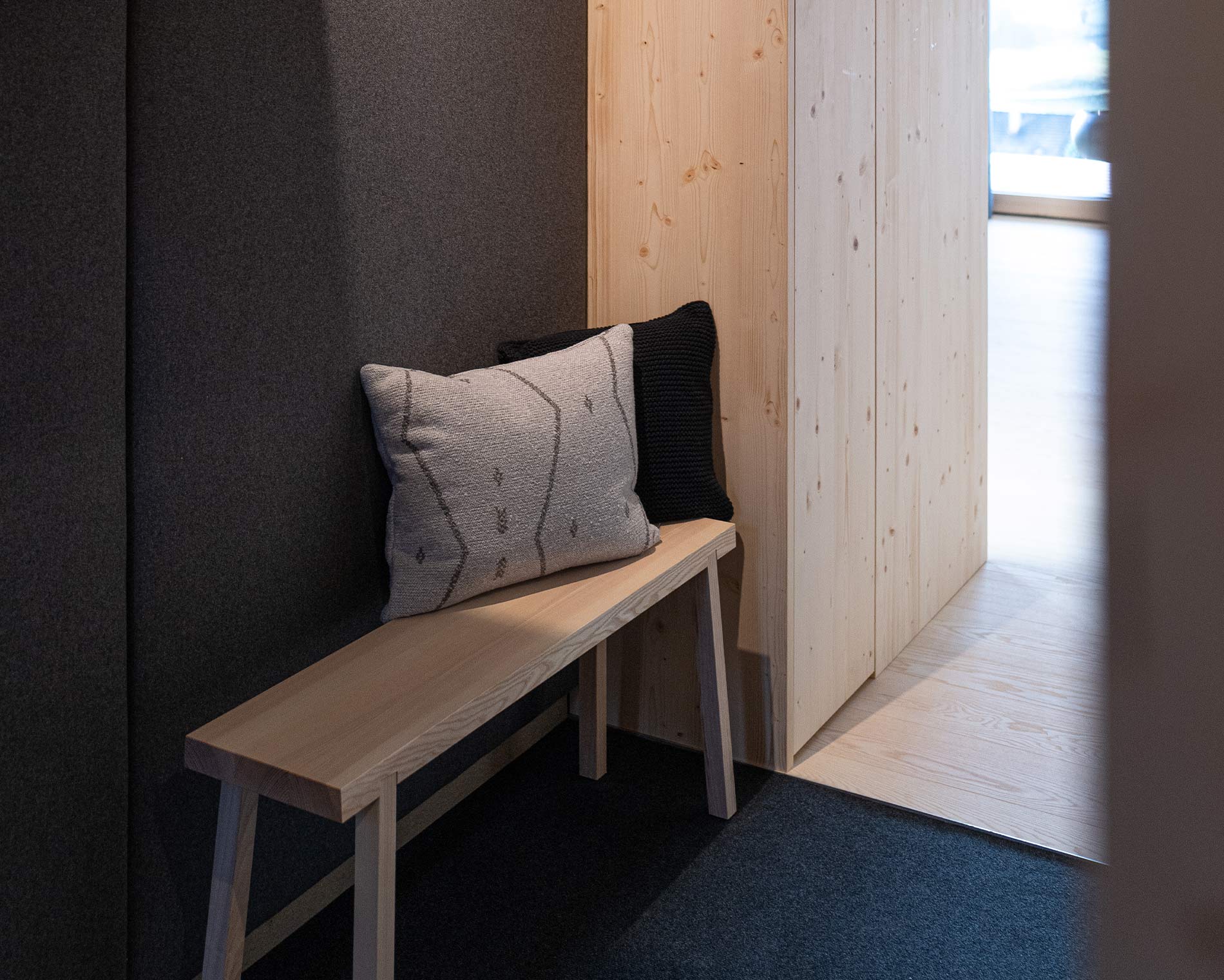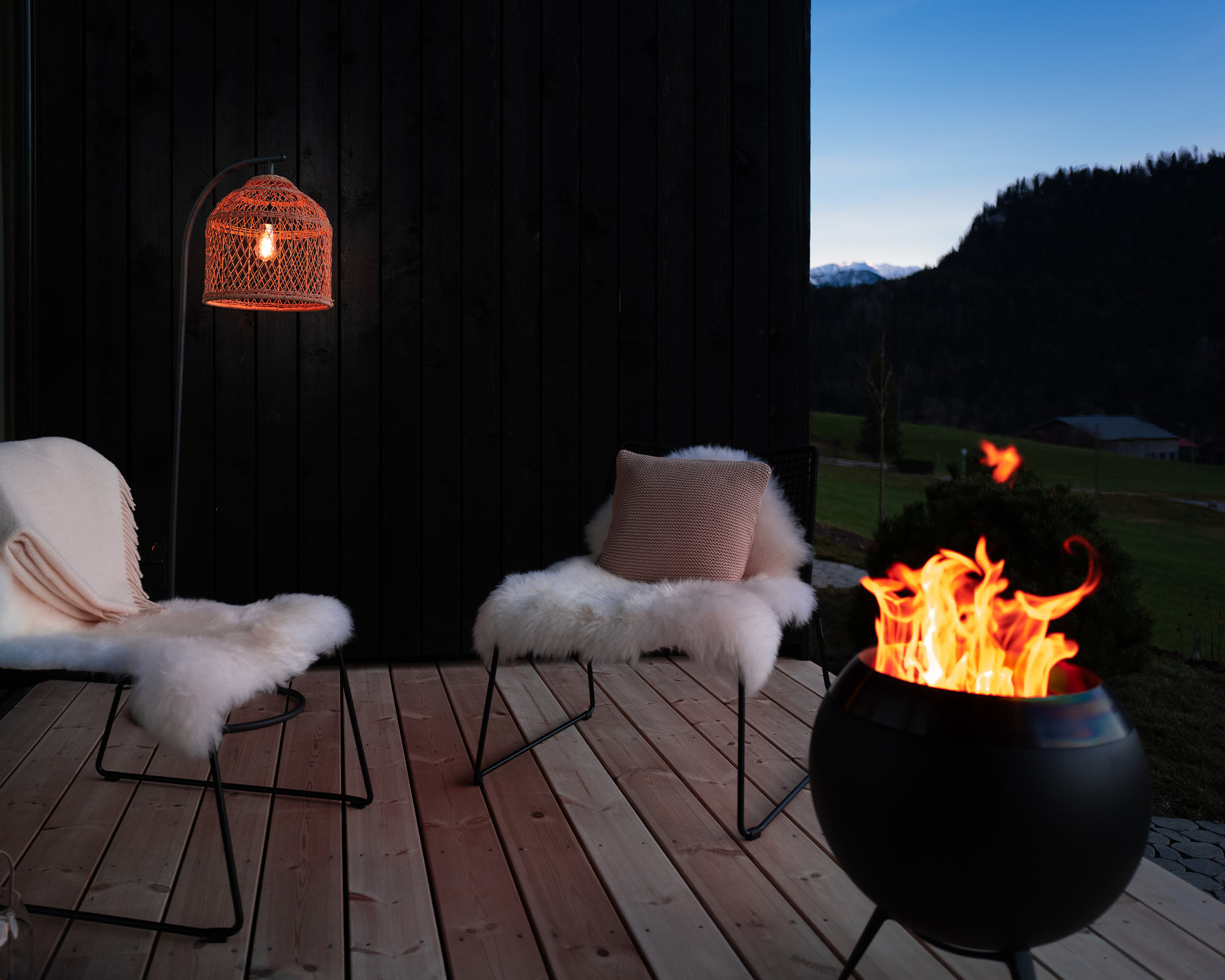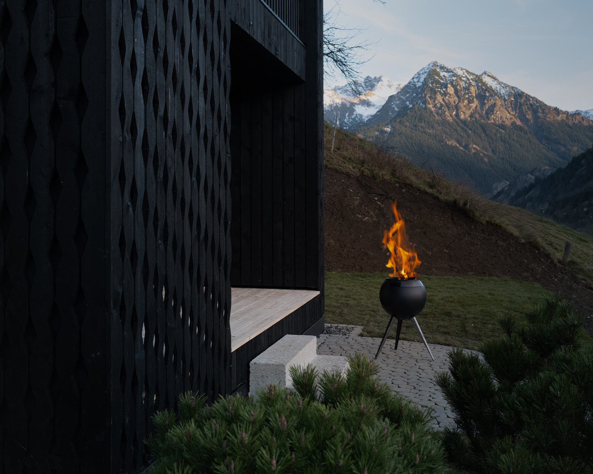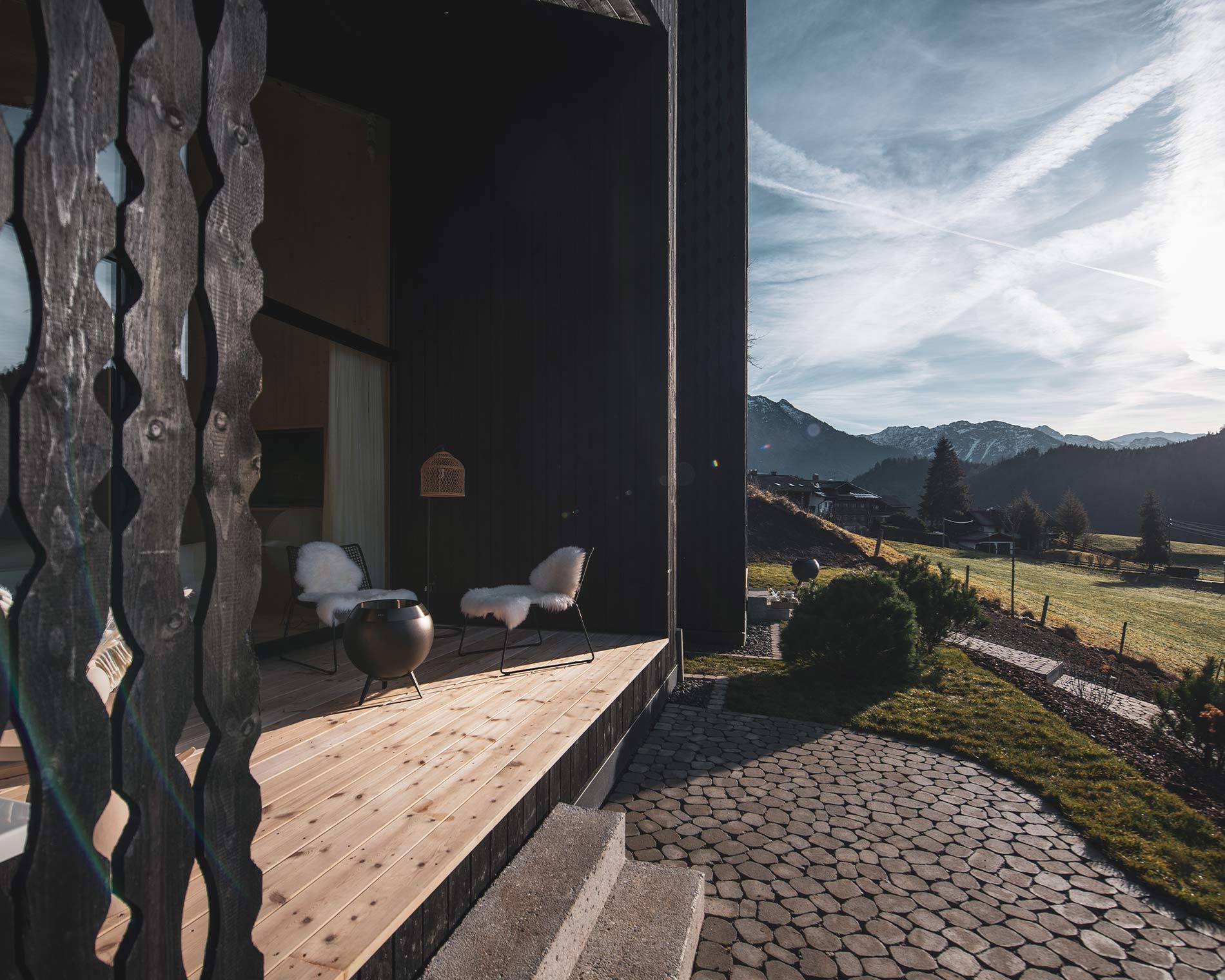 • Lodge Cilli is 44 square meters in size and can accommodate two to four people (including two children, who can sleep in a sleeping alcove on the gallery). It’s on the ground floor, is slightly more compact, and also has a sauna. The loggia features an outdoor whirlpool tub, a fire pit, and comfortable seating.