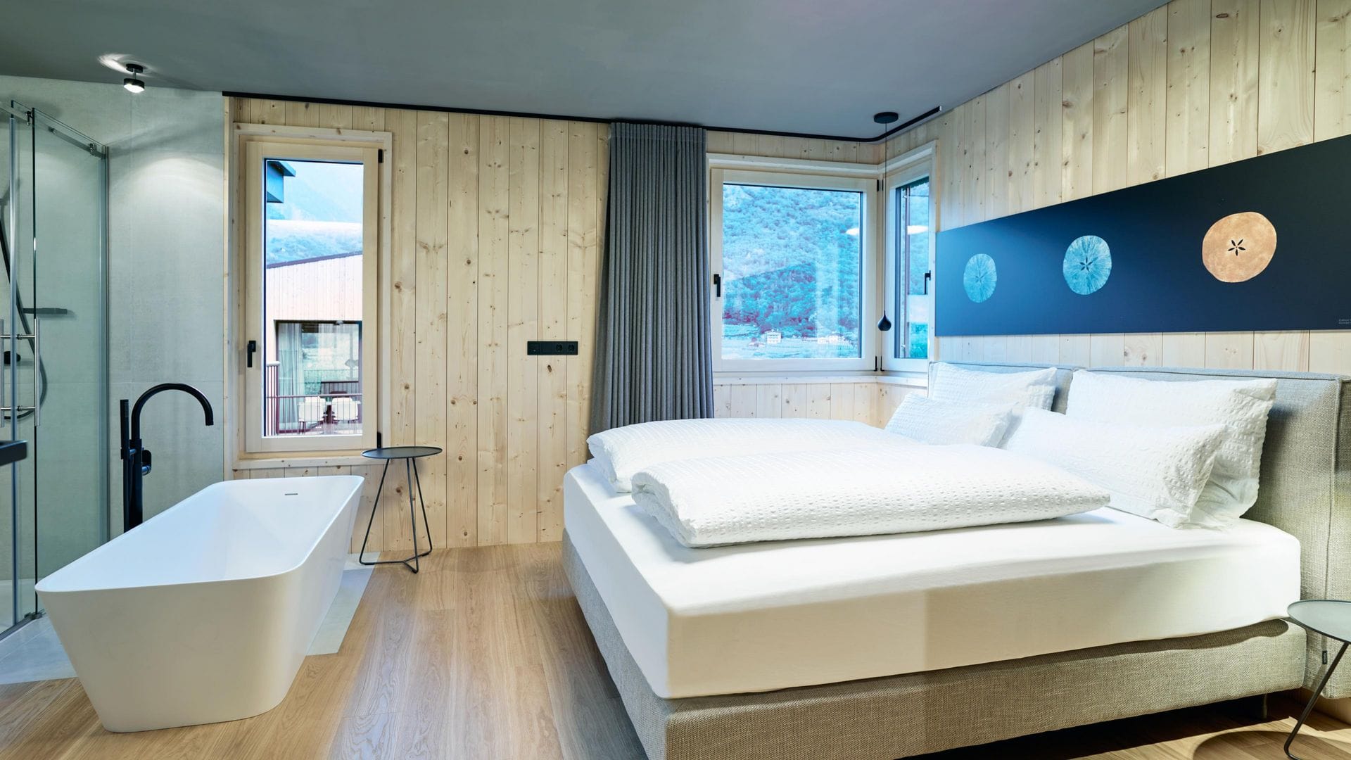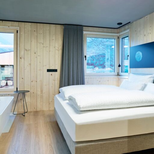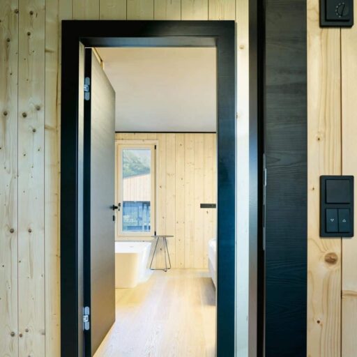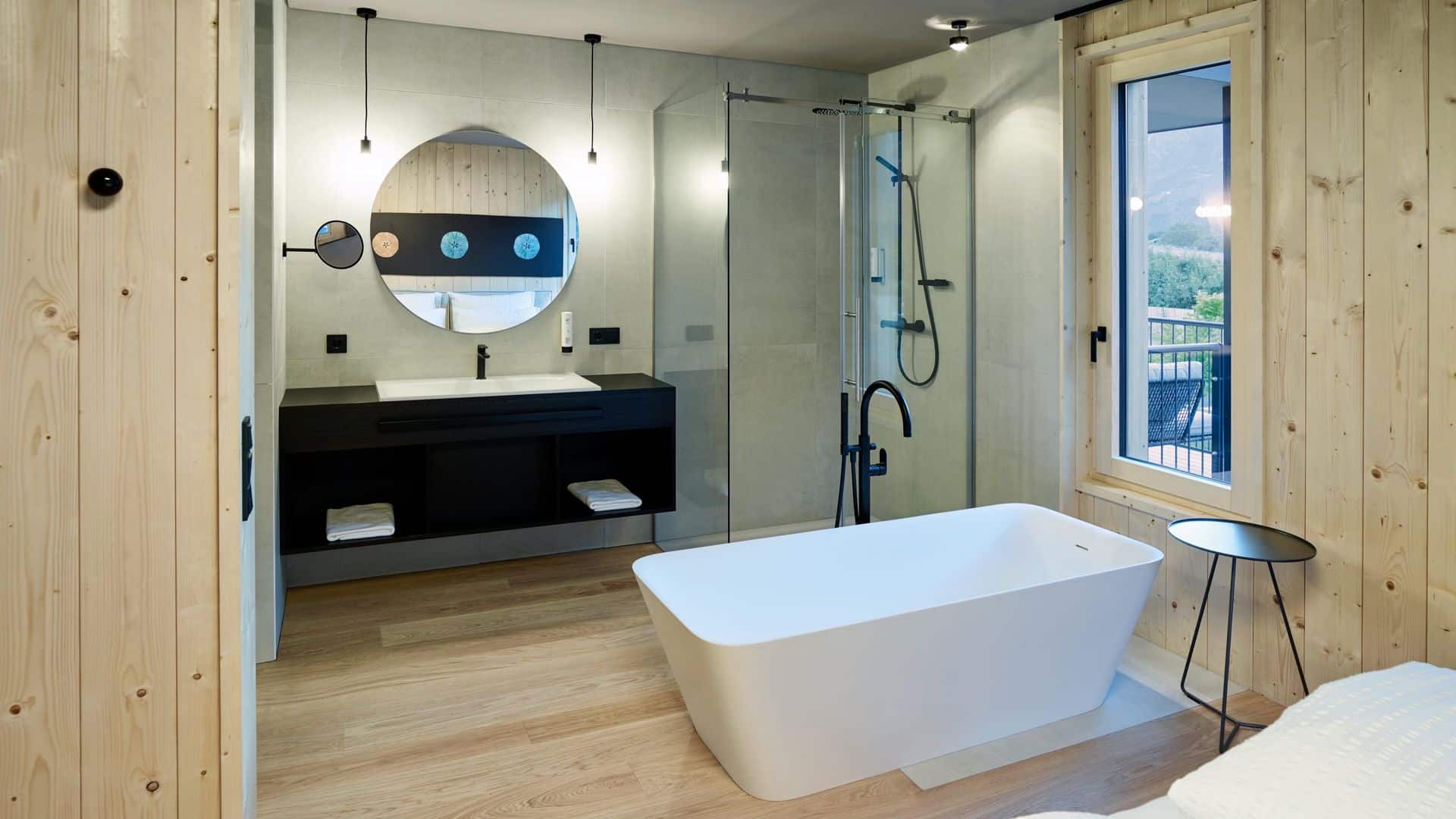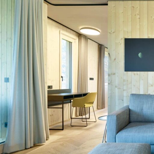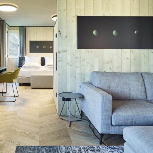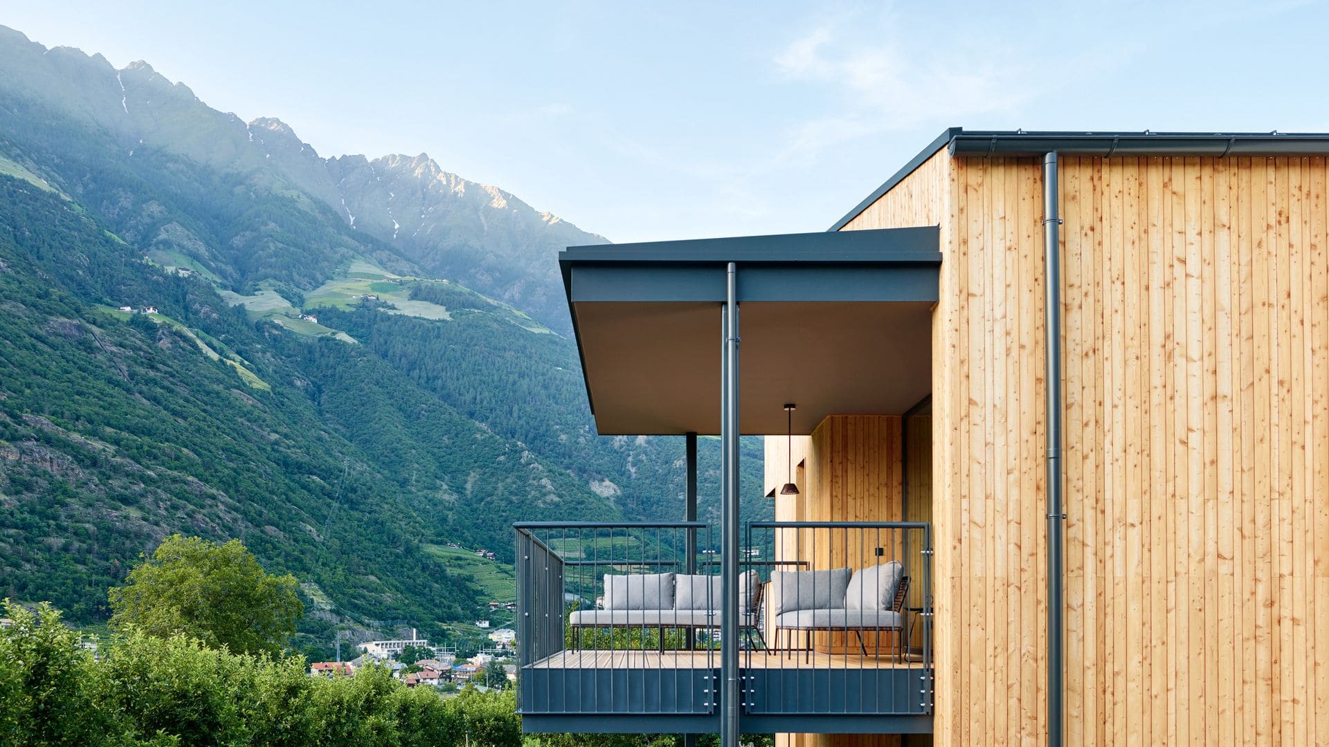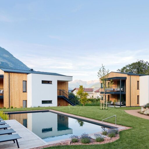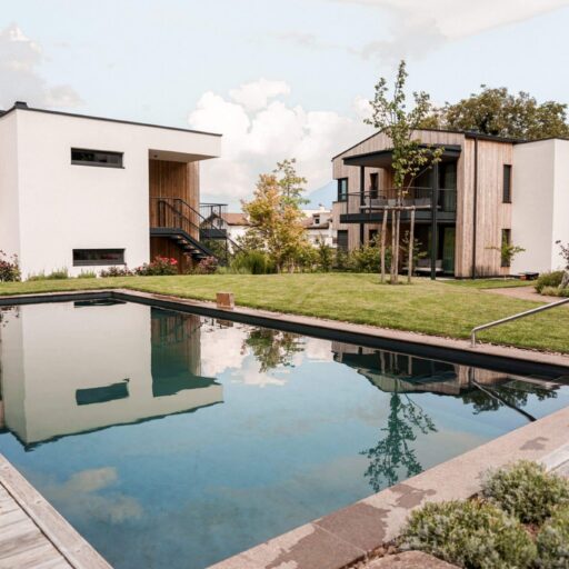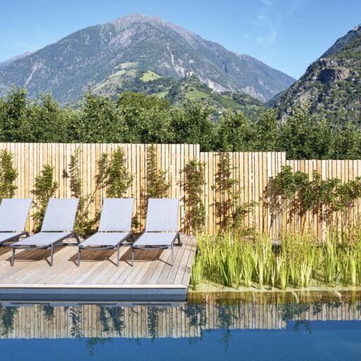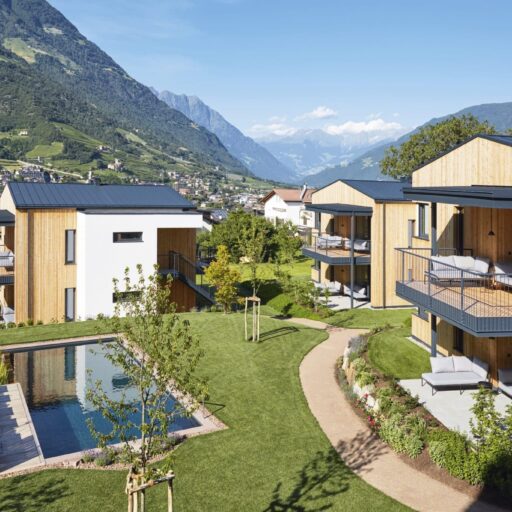 The Linter family had a vision: Before reaching the gates of Merano, on the edge of the market town of Naturno in the Vinschgau Valley, a very special place was to be created for vacation guests. It should be close to nature, clear, simple, unobtrusive—yet elegant, high-quality and comfortable, so only the best of everything. The result is the Cirna Gentle Luxury Lodges, which were completed in April 2019. People seeking peace and relaxation will be just as happy here as active vacationers. Some guests are content to enjoy the amenities of the small and exquisite location; the on-site biopool, for example, or the fragrant herb garden and, of course, the apartments themselves with their fantastic views and first-class facilities. The interior style is modern, minimalist and extremely cozy; select pieces of furniture and decoration in black skilfully contrast with the light, warm wood. More active guests are drawn outside into nature—on foot, by bike, or climbing up into the mountains. Nature has centre stage here anyway, not only in the landscape, but also in the architecture, construction and furnishings of the Cirna Lodges. Sustainable materials were carefully selected and used. The clean architectural lines, which continue into the garden design, allow the eye and mind to rest. Indoors and outdoors, you’ll find a place to recharge and return home energized—just as the Linter family planned.