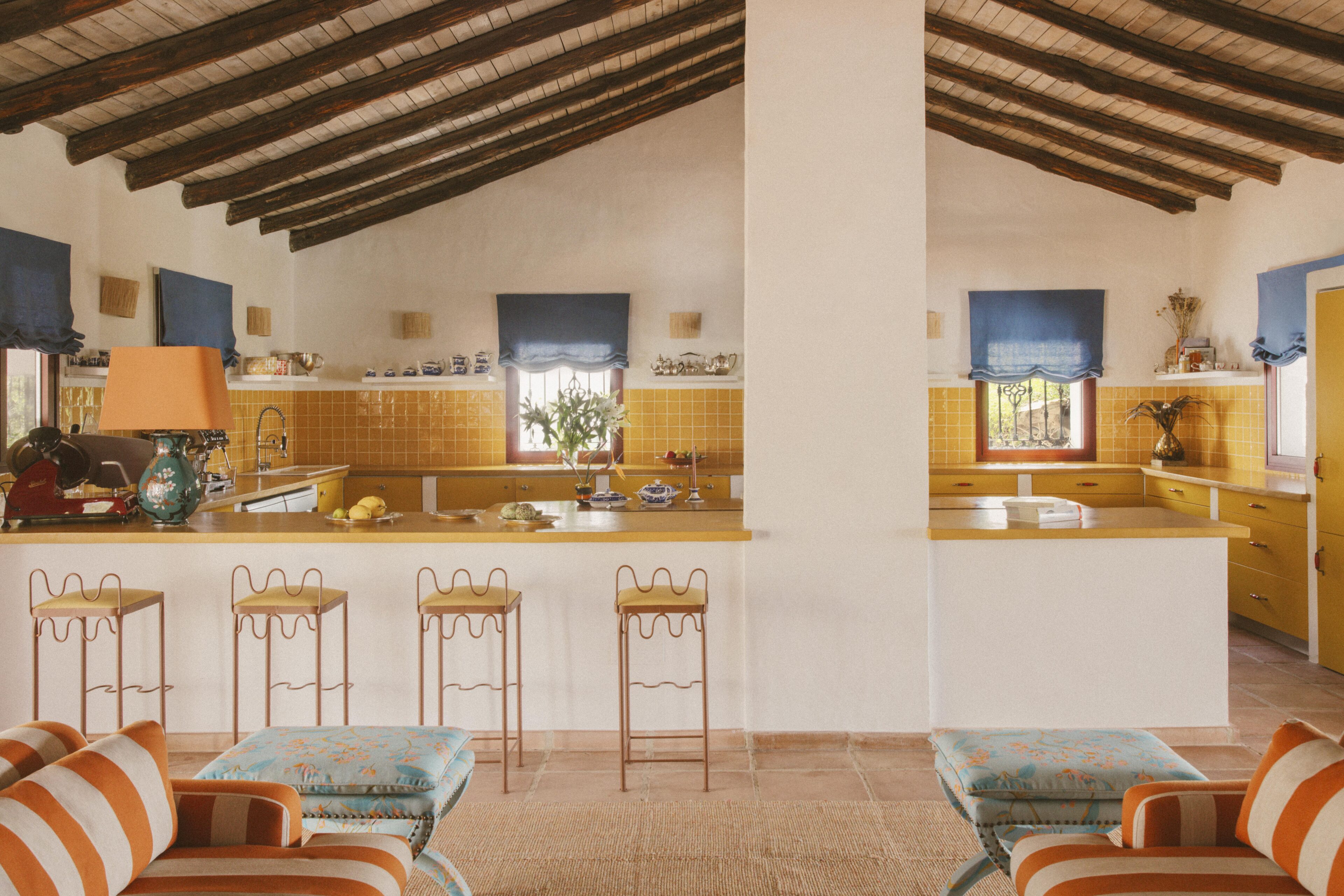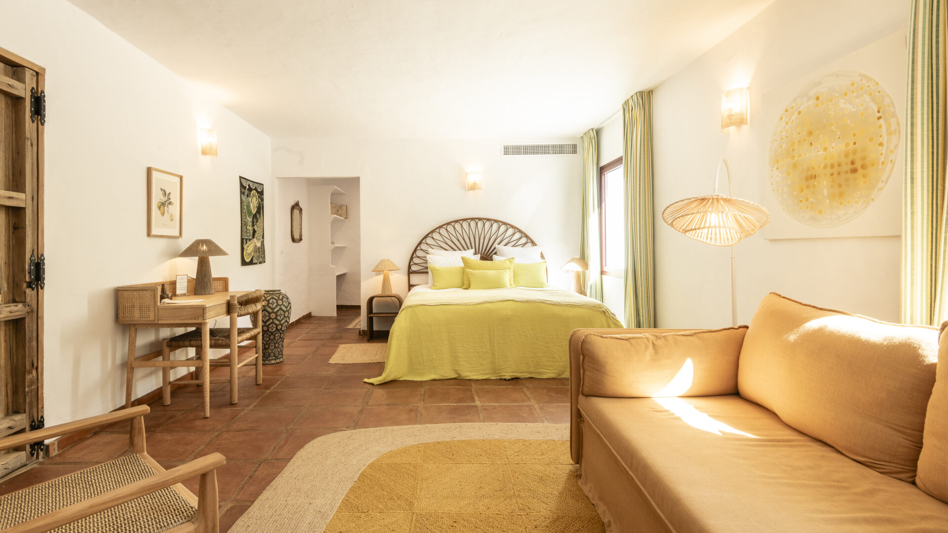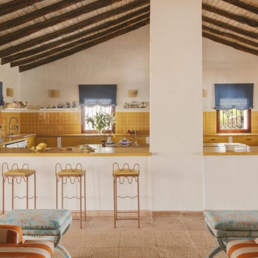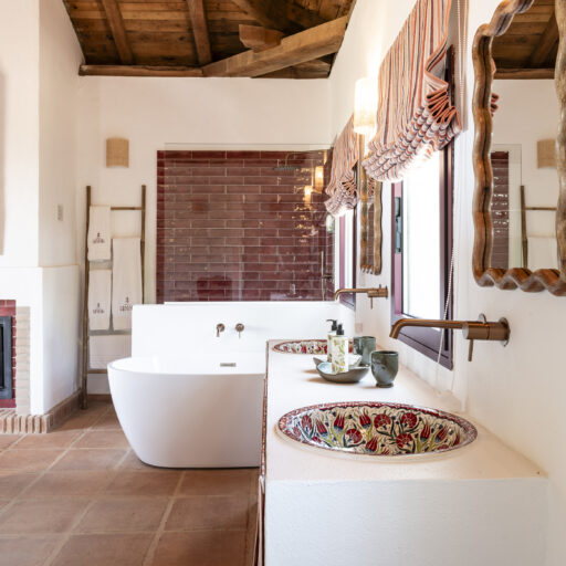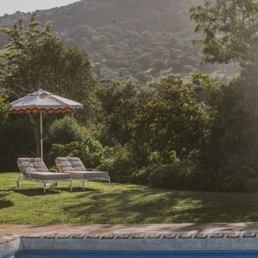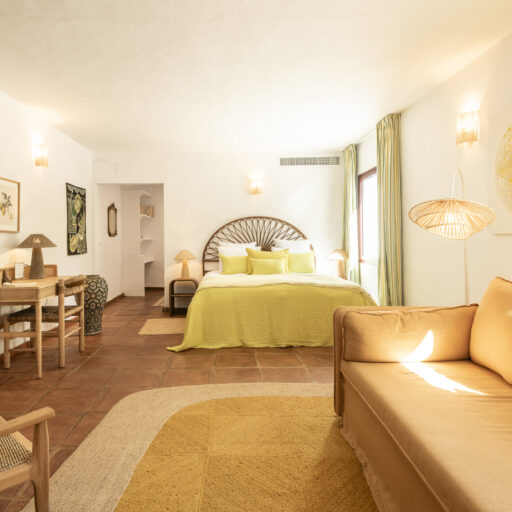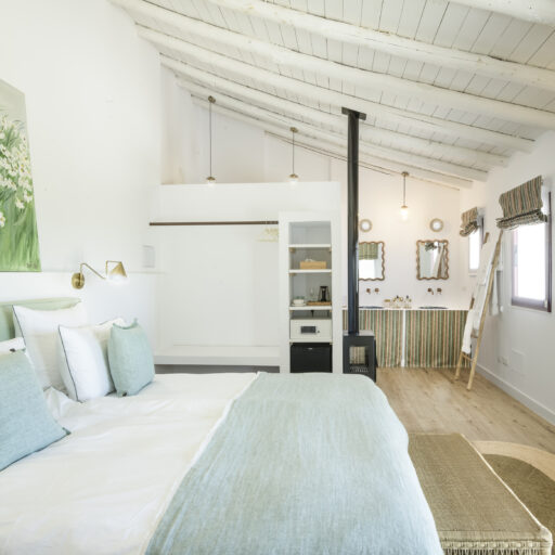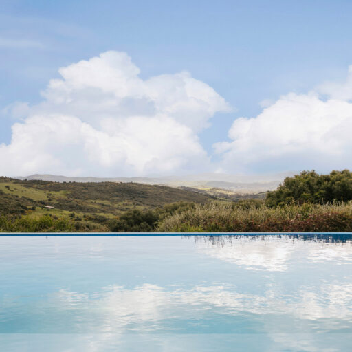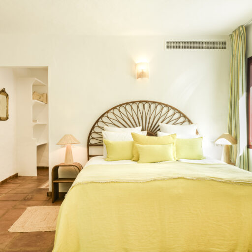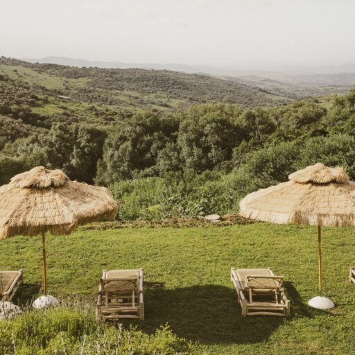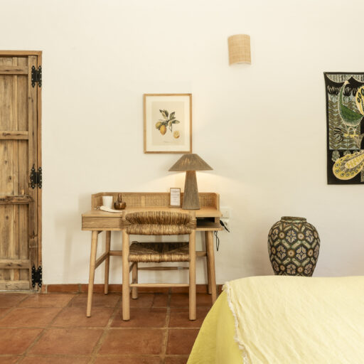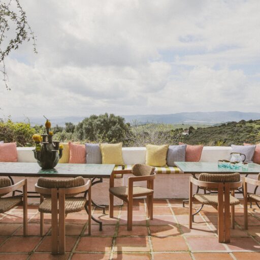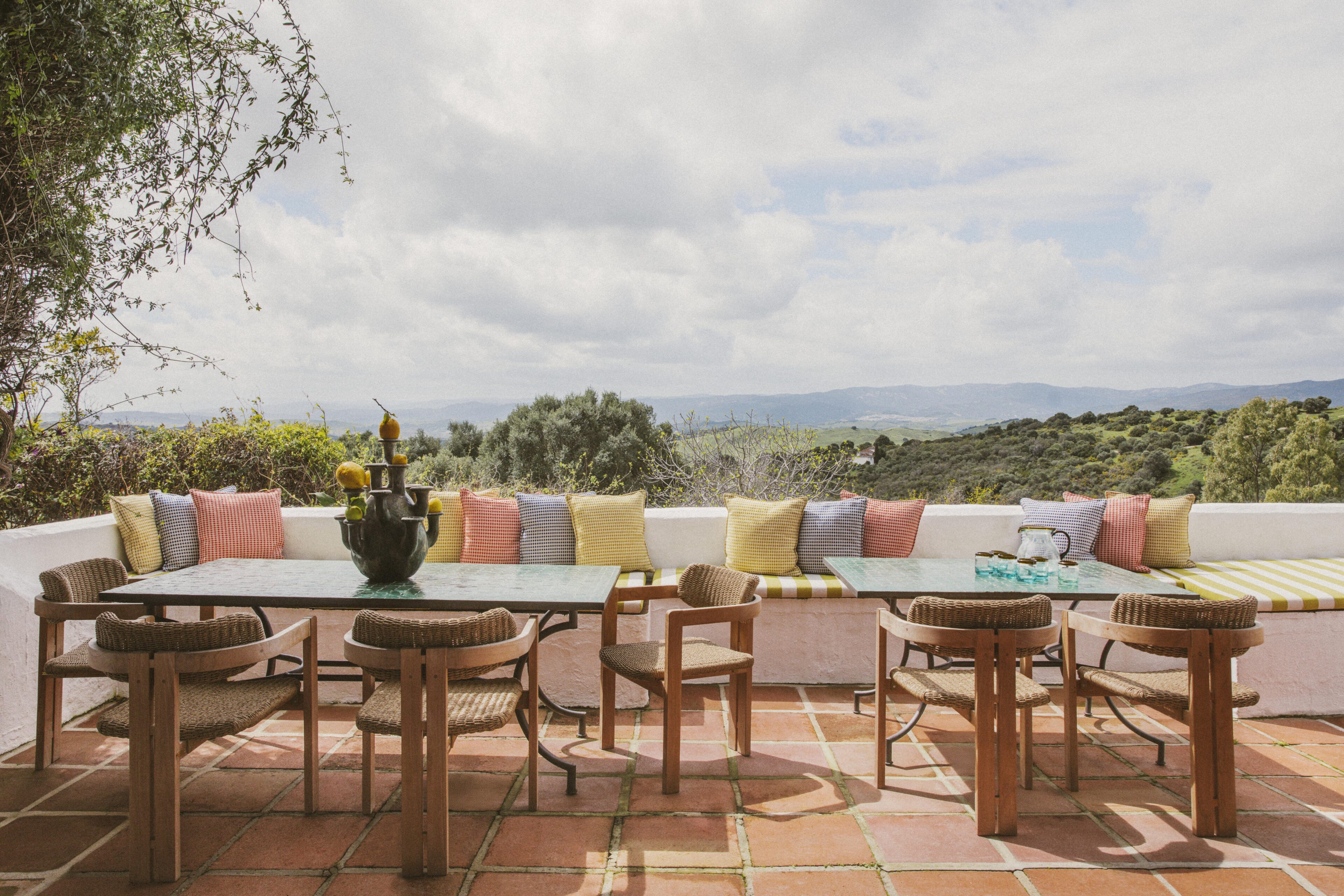 Even before you arrive at Cortijo Genesis, the whitewashed walls among the green landscape envelop you in the special atmosphere of the Andalusian hills. The boutique hotel and agritourism retreat, with its courtyard reminiscent of a Spanish hacienda, has five guest rooms, each with a color scheme inspired by a different semi-precious stone: aventurine green, citrine yellow, lapis lazuli blue, carnelian red, and morganite pink. the tranquil, neutral walls are the perfect backdrop for the jewel-toned highlights of the fabrics, furniture, and decorative elements. Once a forgotten ruin, Cortijo Genesis has been completely reinterpreted by interior designer Victoria-Maria Geyer. Just outside the beautiful mountain village of Gaucín, halfway between Marbella and Gibraltar, she has transformed the old walls into an eclectic country hotel with a touch of Palm Springs and mid-century style. Today, the white façade shines brightly among lush plants, the wrought-iron sun loungers and retro umbrellas around the curved pool exude nostalgic flair, and a tiled fountain splashes in the courtyard. In keeping with the slow travel philosophy, Belgian hosts Valentina and Nicolas Brusselmans have created a retreat that is all about a conscious experience and an escape from the hustle and bustle of modern life. They invite their guests to take in this place with all their senses: on walks in the hills, reading under old trees, a session on the yoga platform, or with reiki. Let the delicious breakfast, with homemade bread, jams made from fruit from the garden, pancakes, and eggs from the hotel’s own chickens, be the first mindfulness exercise of the day—you'll find that it tastes even better when you enjoy it in complete peace and quiet.
