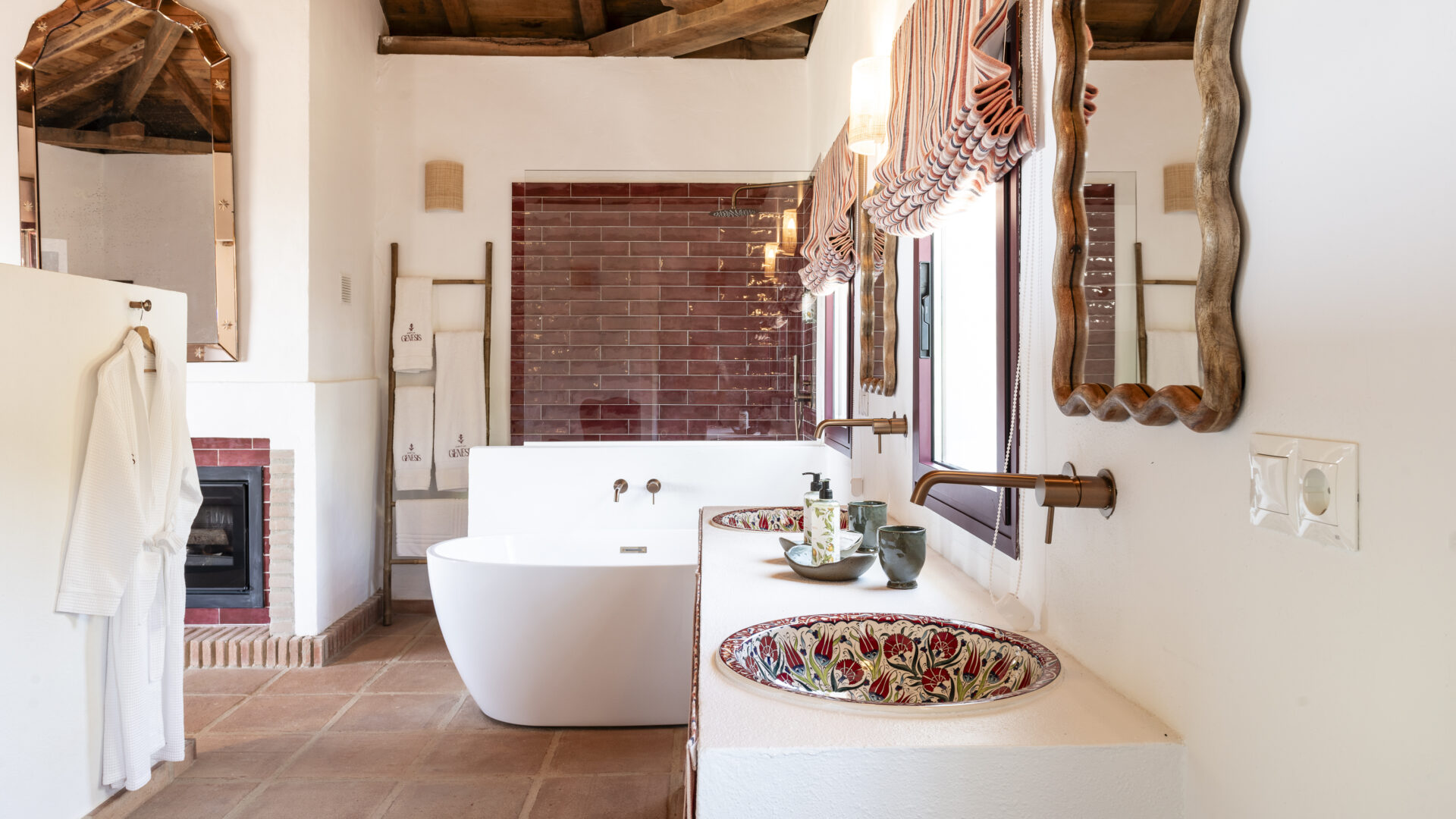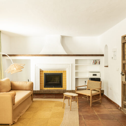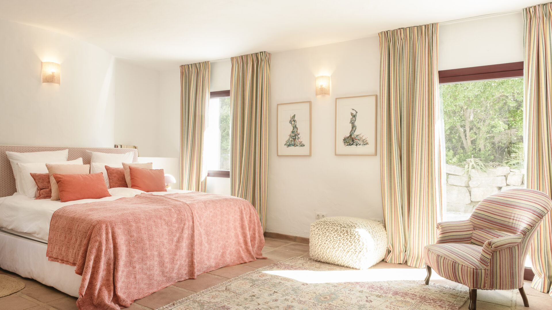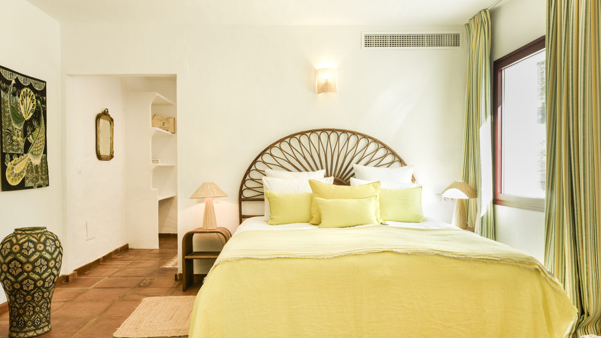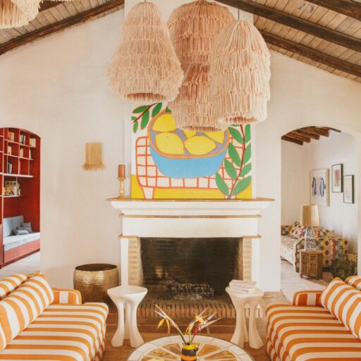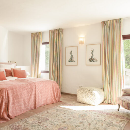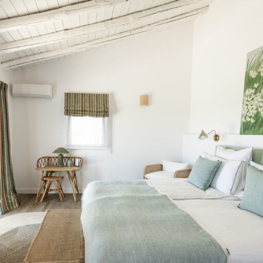 Even before you arrive at Cortijo Genesis, the whitewashed walls among the green landscape envelop you in the special atmosphere of the Andalusian hills. The boutique hotel and agritourism retreat, with its courtyard reminiscent of a Spanish hacienda, has five guest rooms, each with a color scheme inspired by a different semi-precious stone: aventurine green, citrine yellow, lapis lazuli blue, carnelian red, and morganite pink. the tranquil, neutral walls are the perfect backdrop for the jewel-toned highlights of the fabrics, furniture, and decorative elements. Once a forgotten ruin, Cortijo Genesis has been completely reinterpreted by interior designer Victoria-Maria Geyer. Just outside the beautiful mountain village of Gaucín, halfway between Marbella and Gibraltar, she has transformed the old walls into an eclectic country hotel with a touch of Palm Springs and mid-century style. Today, the white façade shines brightly among lush plants, the wrought-iron sun loungers and retro umbrellas around the curved pool exude nostalgic flair, and a tiled fountain splashes in the courtyard. In keeping with the slow travel philosophy, Belgian hosts Valentina and Nicolas Brusselmans have created a retreat that is all about a conscious experience and an escape from the hustle and bustle of modern life. They invite their guests to take in this place with all their senses: on walks in the hills, reading under old trees, a session on the yoga platform, or with reiki. Let the delicious breakfast, with homemade bread, jams made from fruit from the garden, pancakes, and eggs from the hotel’s own chickens, be the first mindfulness exercise of the day—you'll find that it tastes even better when you enjoy it in complete peace and quiet.