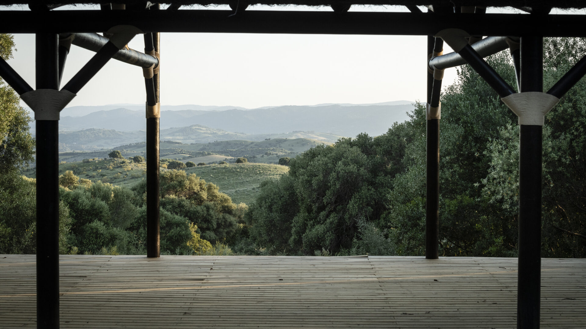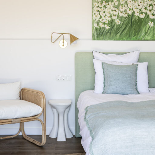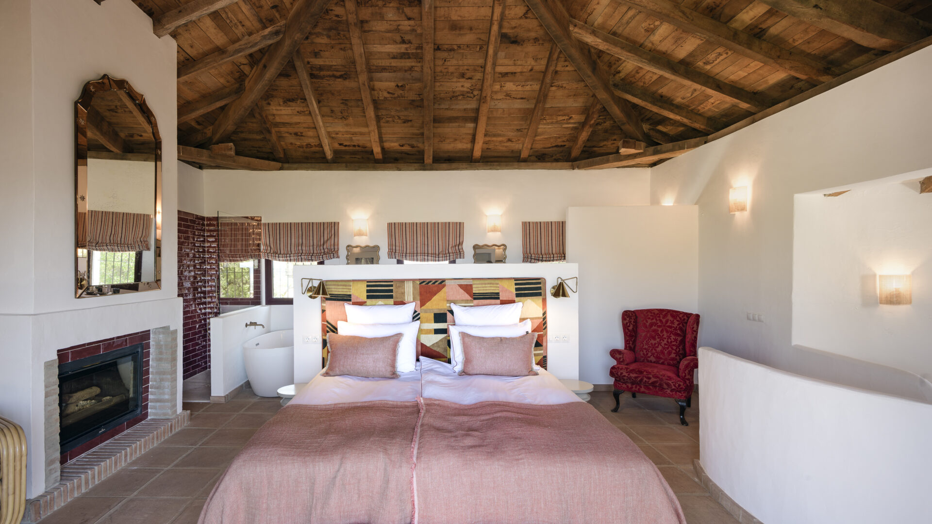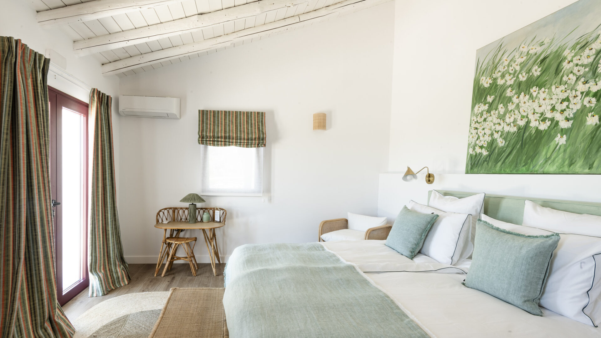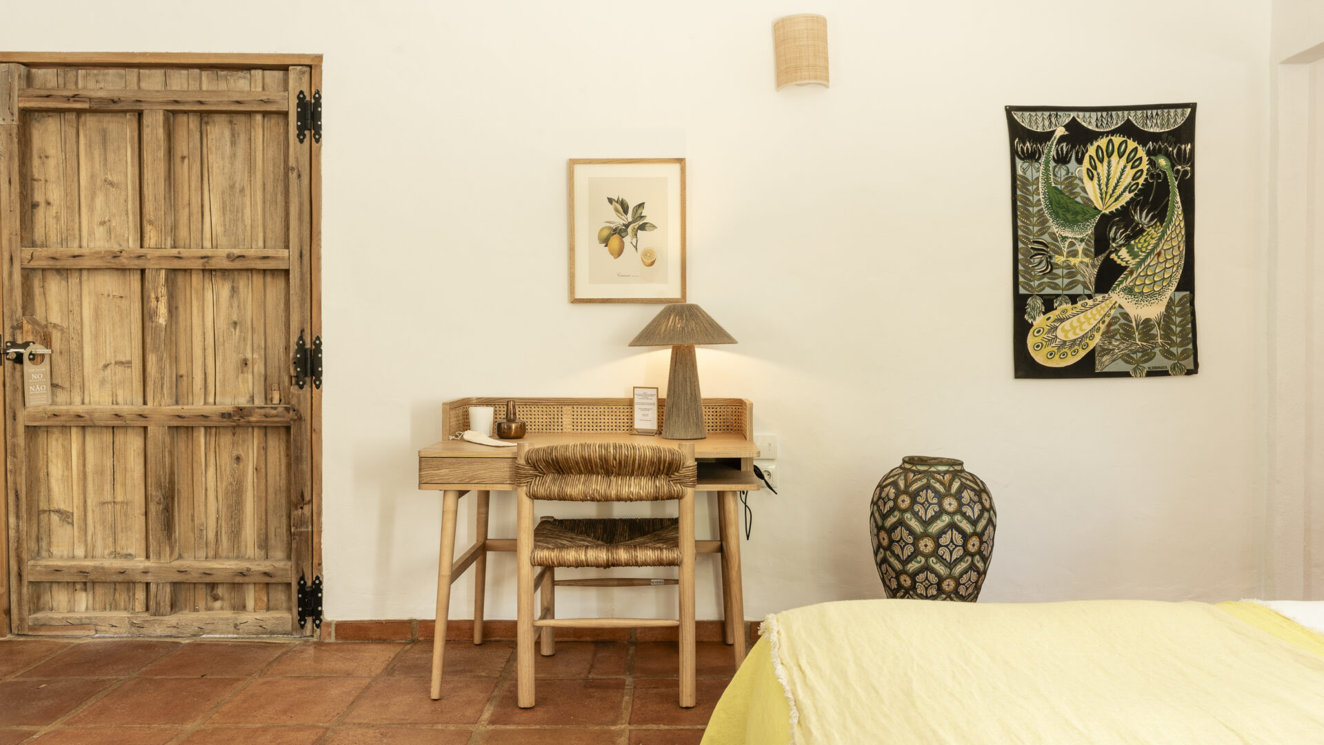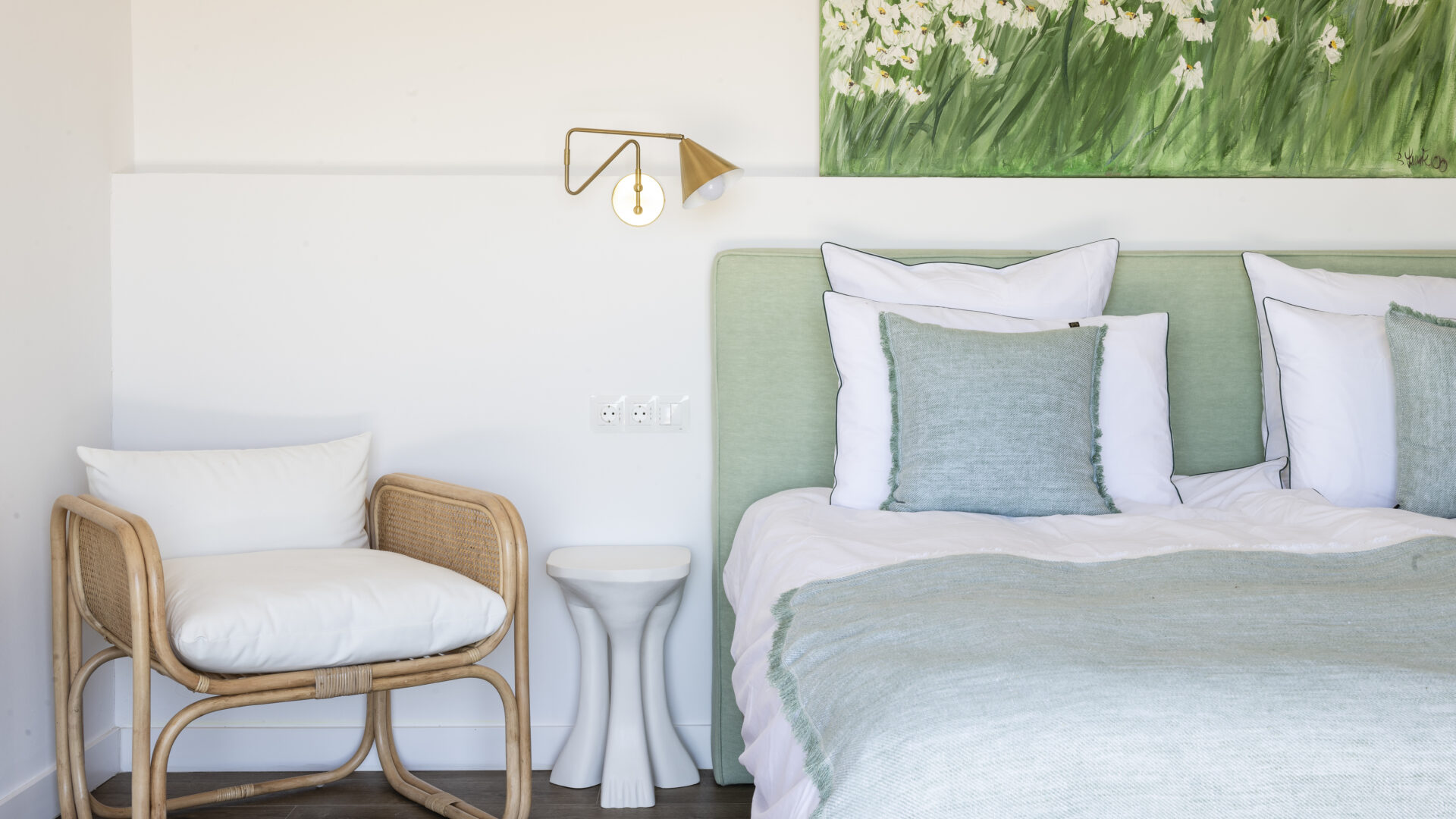 Even before you arrive at Cortijo Genesis, the whitewashed walls among the green landscape envelop you in the special atmosphere of the Andalusian hills. The boutique hotel and agritourism retreat, with its courtyard reminiscent of a Spanish hacienda, has five guest rooms, each with a color scheme inspired by a different semi-precious stone: aventurine green, citrine yellow, lapis lazuli blue, carnelian red, and morganite pink. the tranquil, neutral walls are the perfect backdrop for the jewel-toned highlights of the fabrics, furniture, and decorative elements. Once a forgotten ruin, Cortijo Genesis has been completely reinterpreted by interior designer Victoria-Maria Geyer. Just outside the beautiful mountain village of Gaucín, halfway between Marbella and Gibraltar, she has transformed the old walls into an eclectic country hotel with a touch of Palm Springs and mid-century style. Today, the white façade shines brightly among lush plants, the wrought-iron sun loungers and retro umbrellas around the curved pool exude nostalgic flair, and a tiled fountain splashes in the courtyard. In keeping with the slow travel philosophy, Belgian hosts Valentina and Nicolas Brusselmans have created a retreat that is all about a conscious experience and an escape from the hustle and bustle of modern life. They invite their guests to take in this place with all their senses: on walks in the hills, reading under old trees, a session on the yoga platform, or with reiki. Let the delicious breakfast, with homemade bread, jams made from fruit from the garden, pancakes, and eggs from the hotel’s own chickens, be the first mindfulness exercise of the day—you'll find that it tastes even better when you enjoy it in complete peace and quiet.