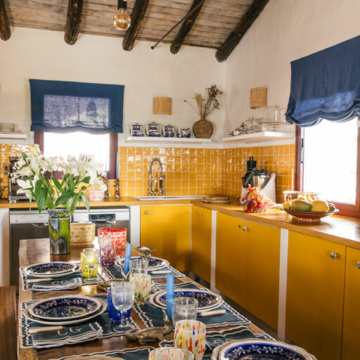 • The beautiful kitchen, where the most delicious meals are prepared. Everything fits together perfectly here: the saffron-yellow tiles with the retro table and the linen painting above the fireplace, which picks up on the color scheme.