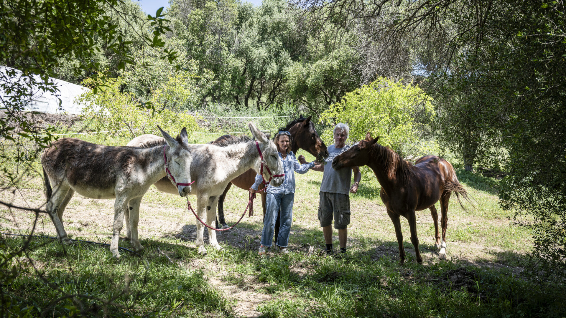 • The many four-legged friends who belong to the family: the adopted dogs, a rescued donkey, horses, and a black cat.