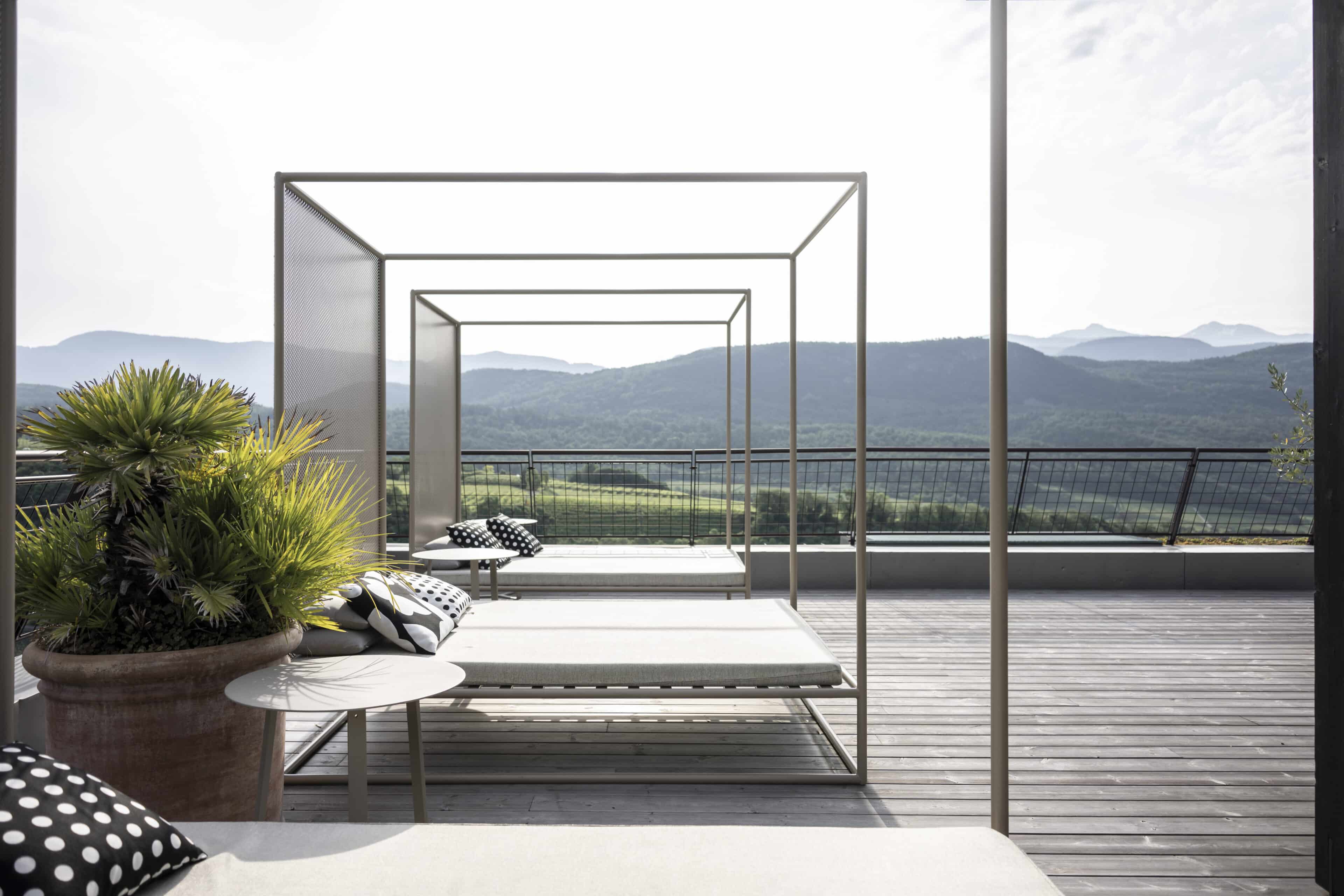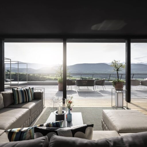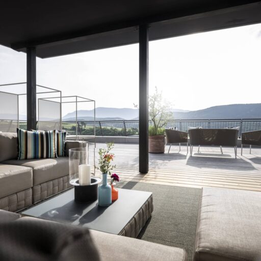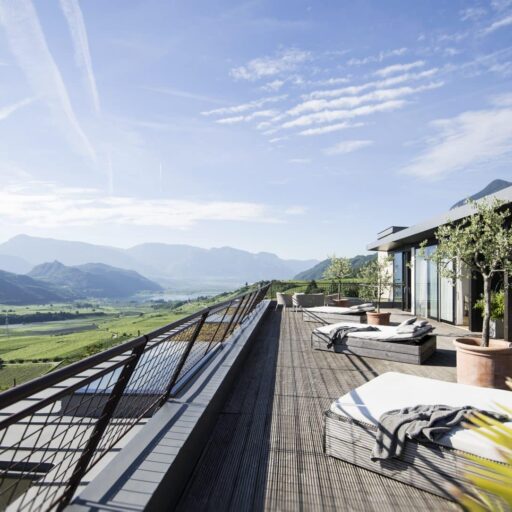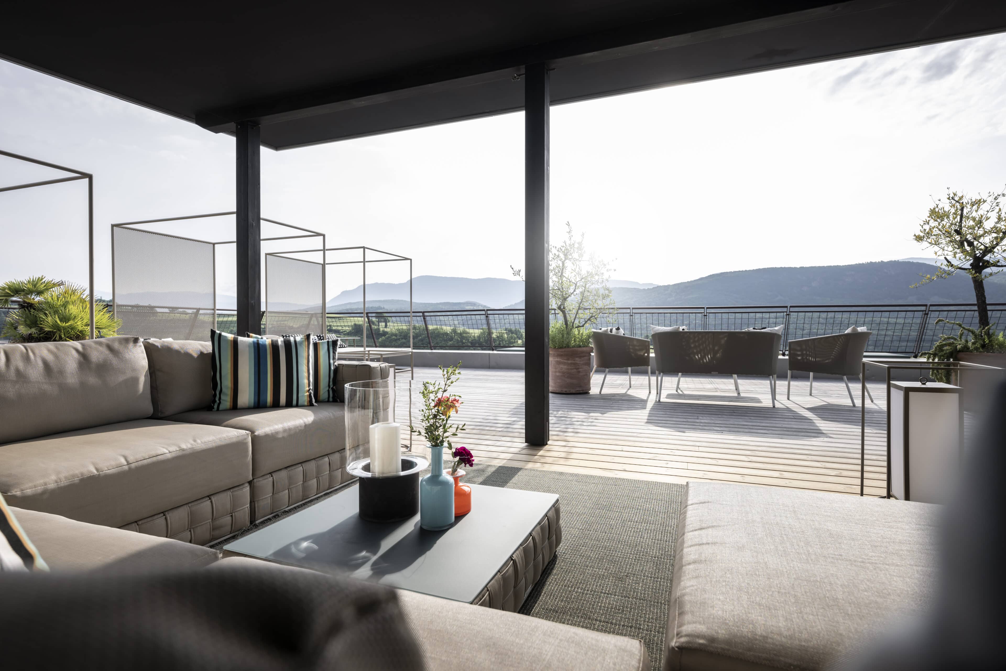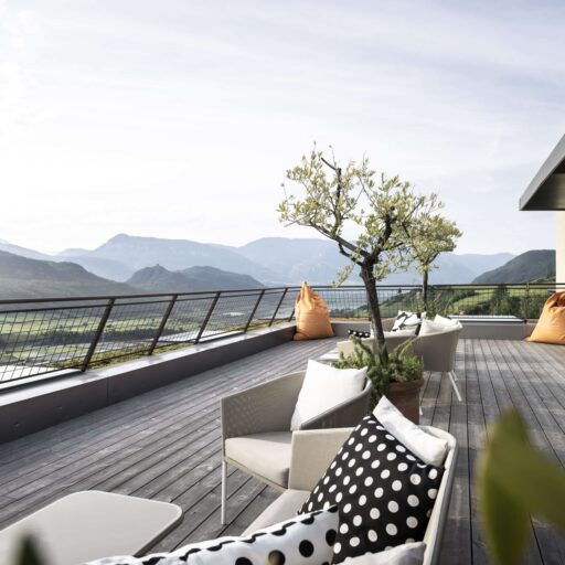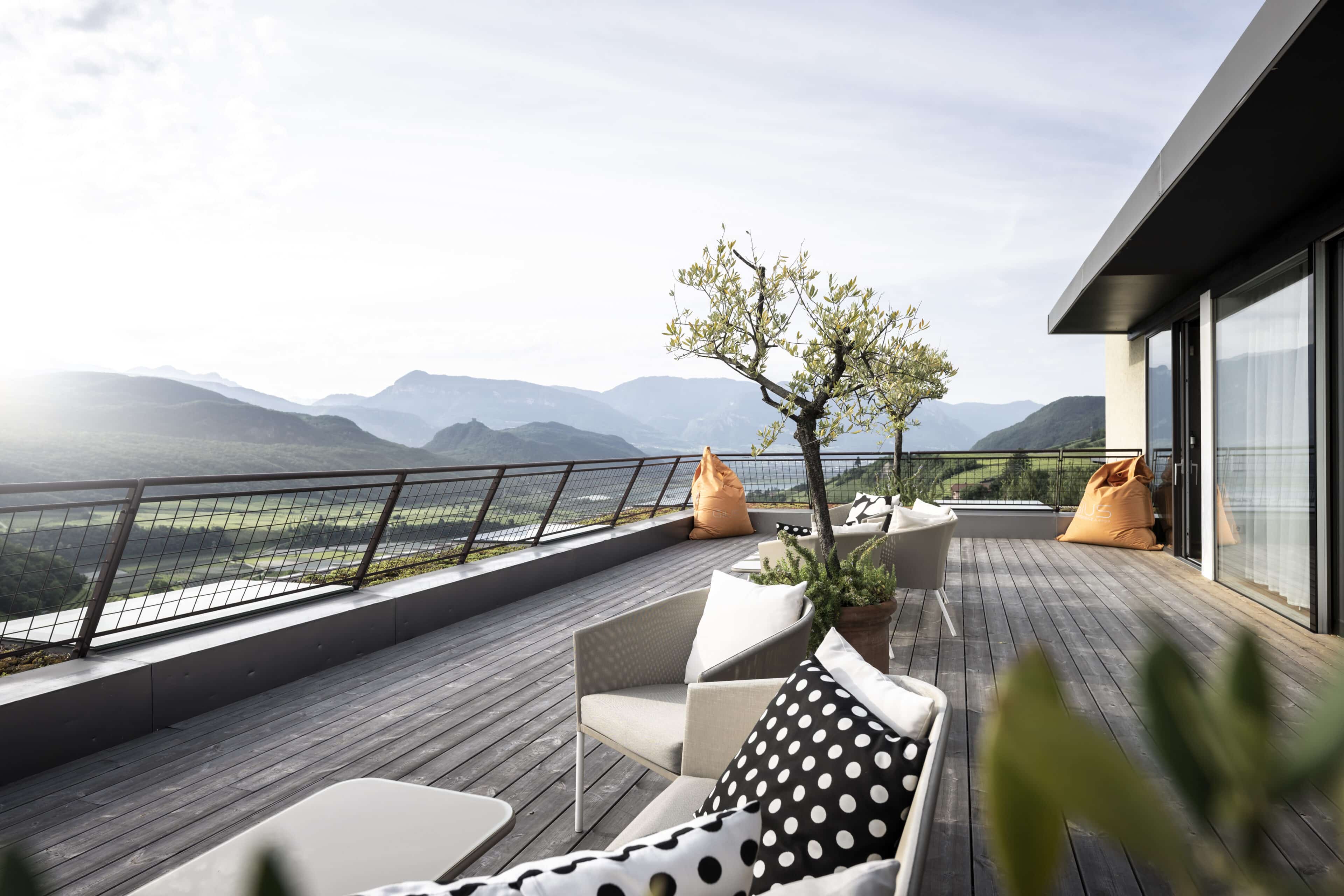 - The huge roof terrace at Hotel La Residenza with sun beds, sofa corners and a breakfast area, with a fantastic view of Lake Kaltern and the beautiful landscape