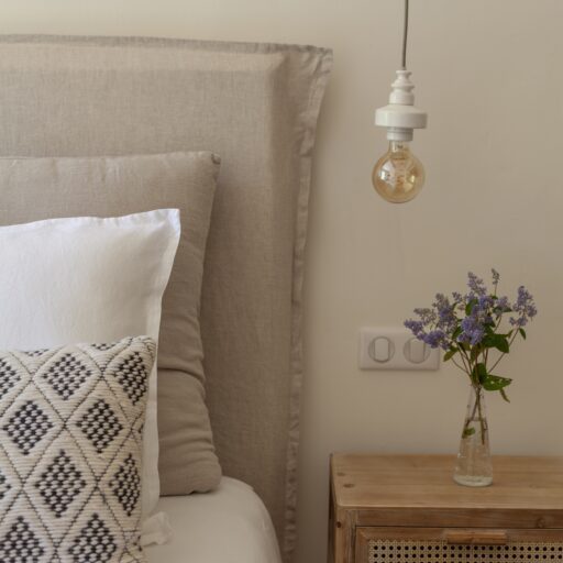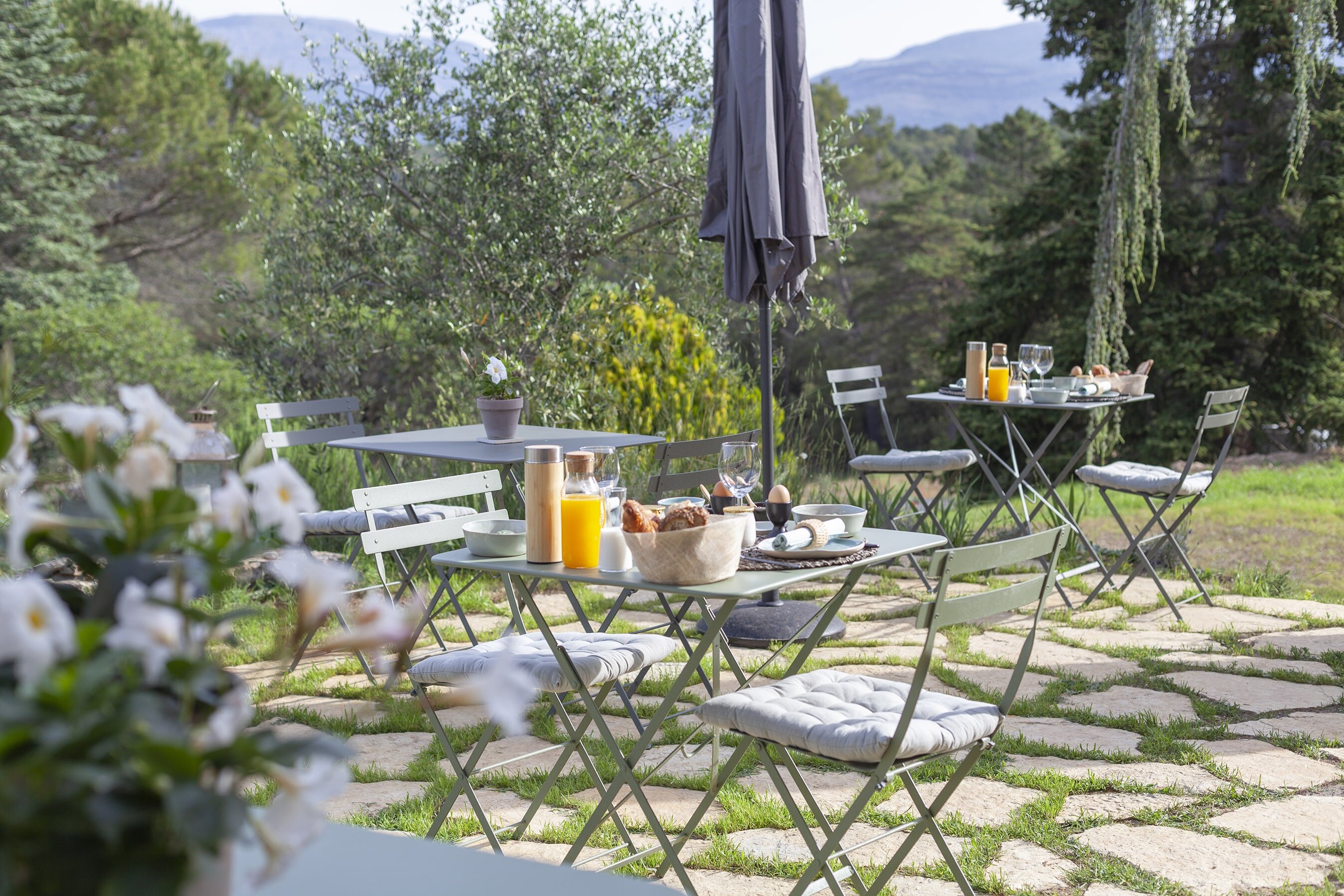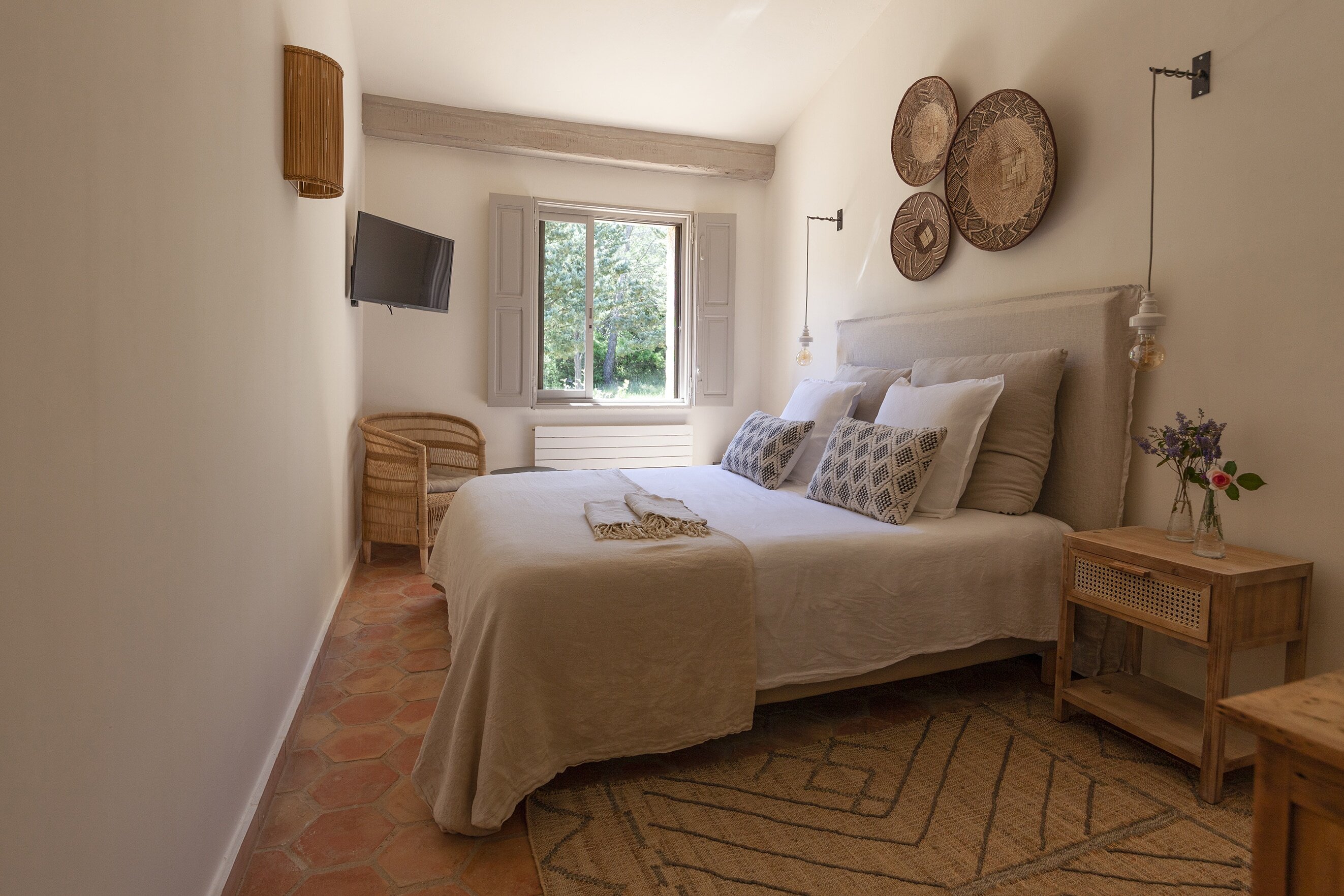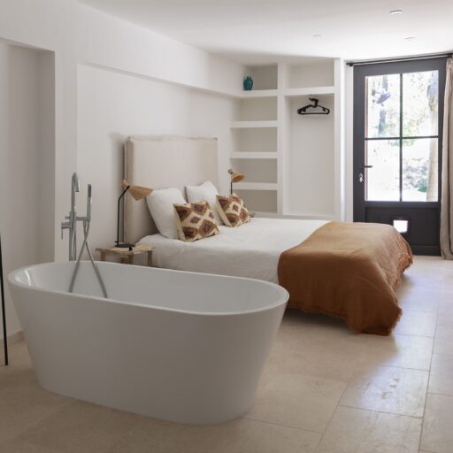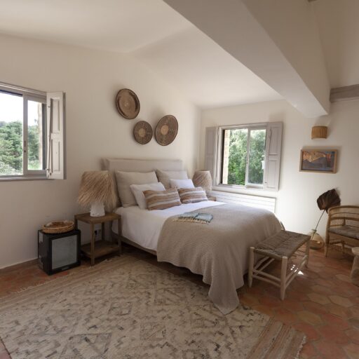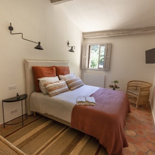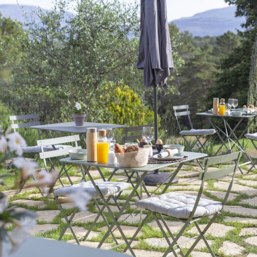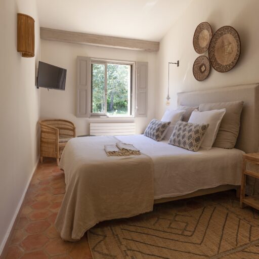 As you approach your destination along the winding gravel road, between densely wooded hills looking towards the foothills of the Alps, the view becomes more beautiful with every meter you climb and you know that something special awaits your arrival. Surrounded by ten hectares of land, the Provençal farmhouse is situated on a plateau in the middle of the Préalpes d’Azur Nature Park. Owner Stéphanie Larguier had lived here with her family for fifteen years. When her children moved to the city to study, she wanted to share this magical place with others. We think it was a great decision. A loving renovation has created the house of her dreams and a place that fulfills many peoples’ idea of the perfect romantic retreat in the countryside. Five spacious, bright guest rooms are located behind the rough stone walls, decorated in earthy tones inspired by the surroundings. Boho-style accessories, handmade floor tiles and antique Spanish doors add an individual touch. The surrounding park with pine, oak and olive trees is home to many species of birds and wildlife. Busy bees produce delicious honey and free-range chickens provide fresh eggs for breakfast. Scattered throughout are communal areas where you can meet and share your day with others: A living room with kitchen and fireplace, a small lounge, a terrace, a heated swimming pool and a large pétanque court. More than enough for a wonderful vacation. And we haven’t even mentioned the heavenly Mediterranean scent of lavender, rosemary, and broom …