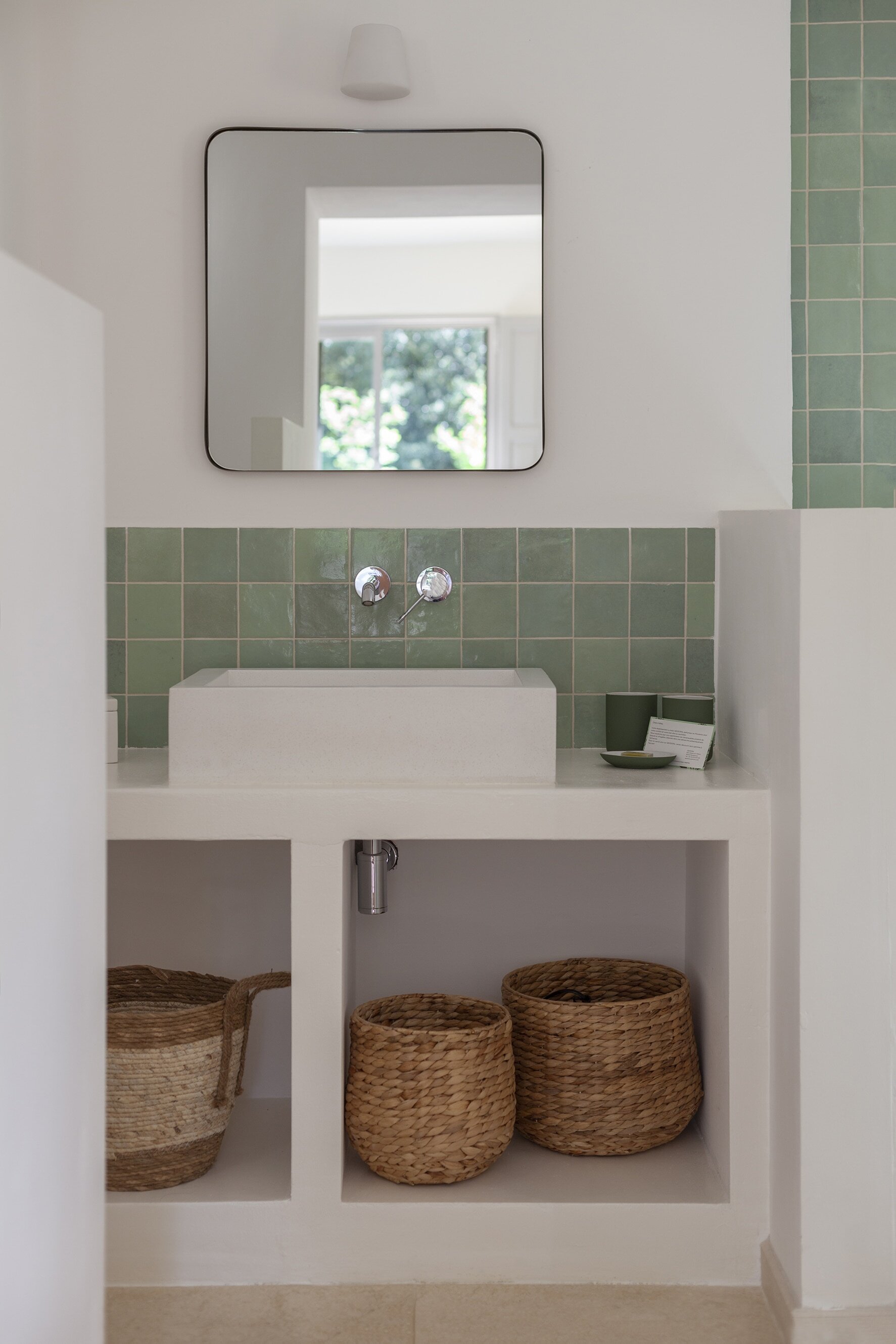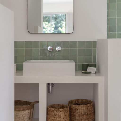 - Each bathroom has a walk-in shower with pretty Zellige tiles in shades of green, white, and gray that would look good in any home.