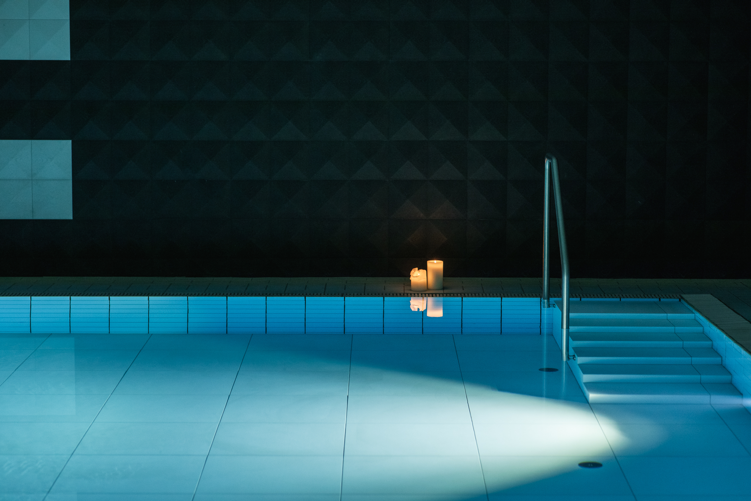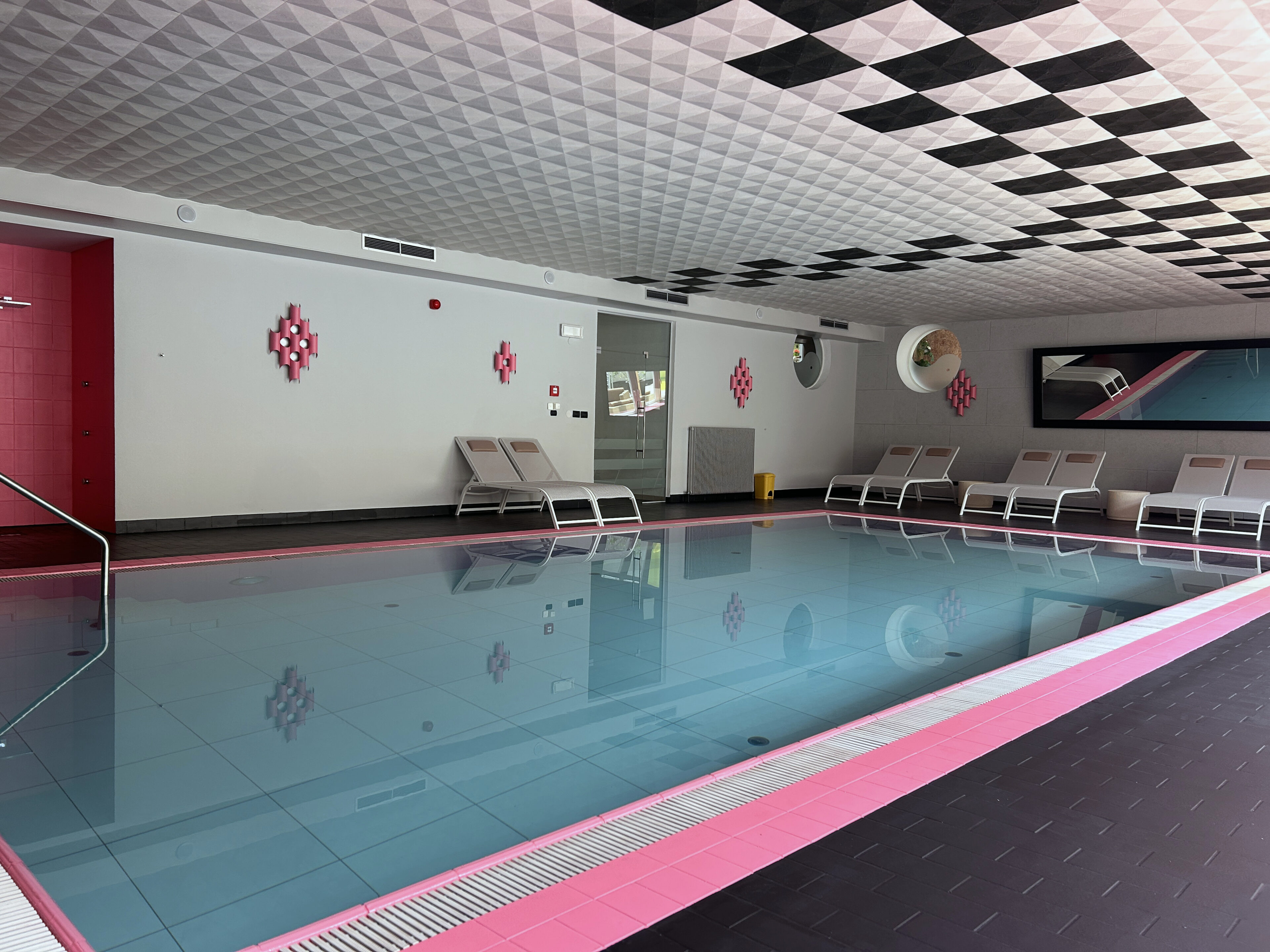 - The extremely photogenic pool with a checkerboard ceiling, pool surround, and benches in bright pink