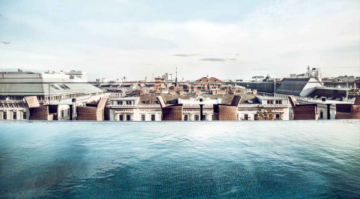 • den Rooftop-Pool unter freiem Himmel mit grandioser Aussicht