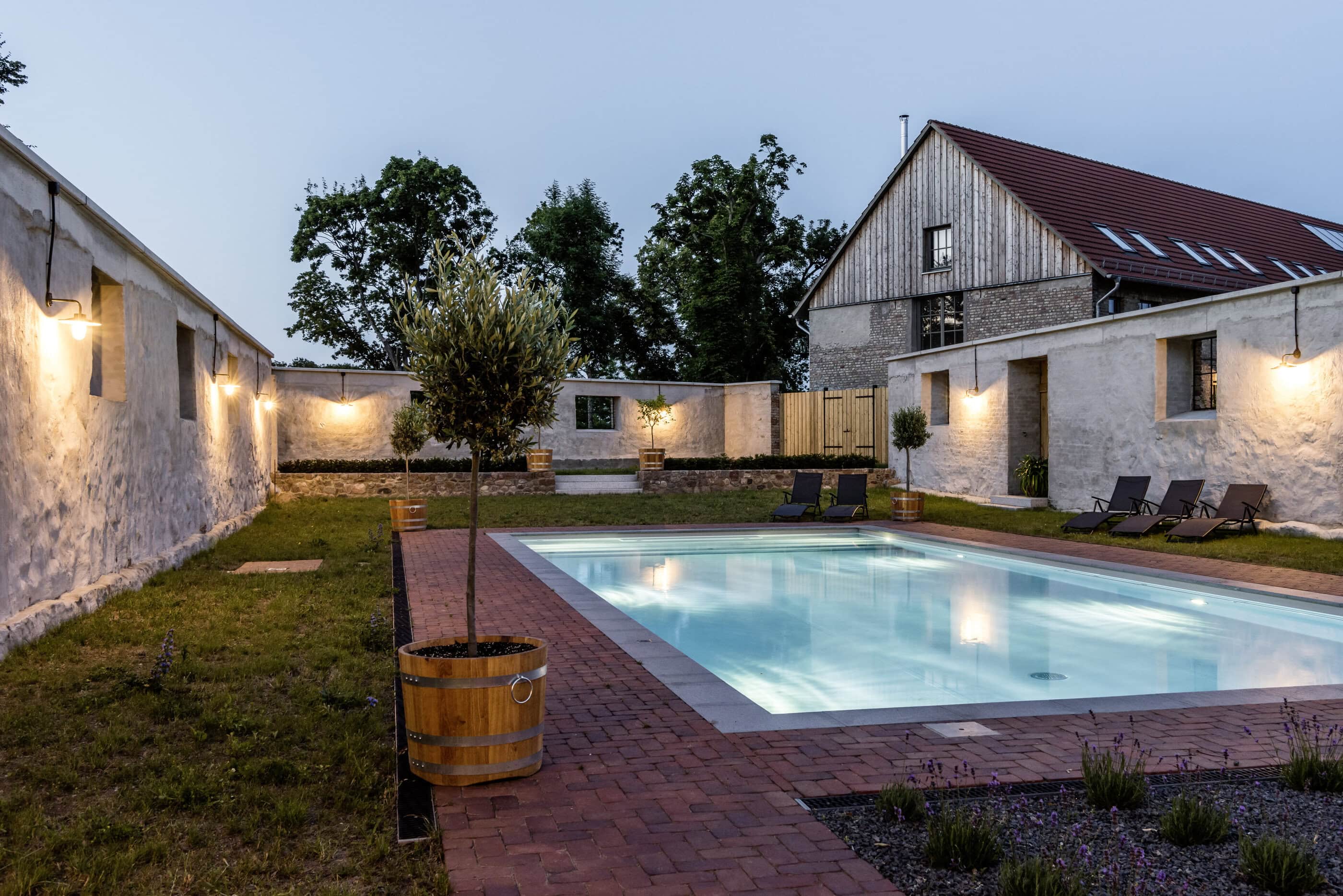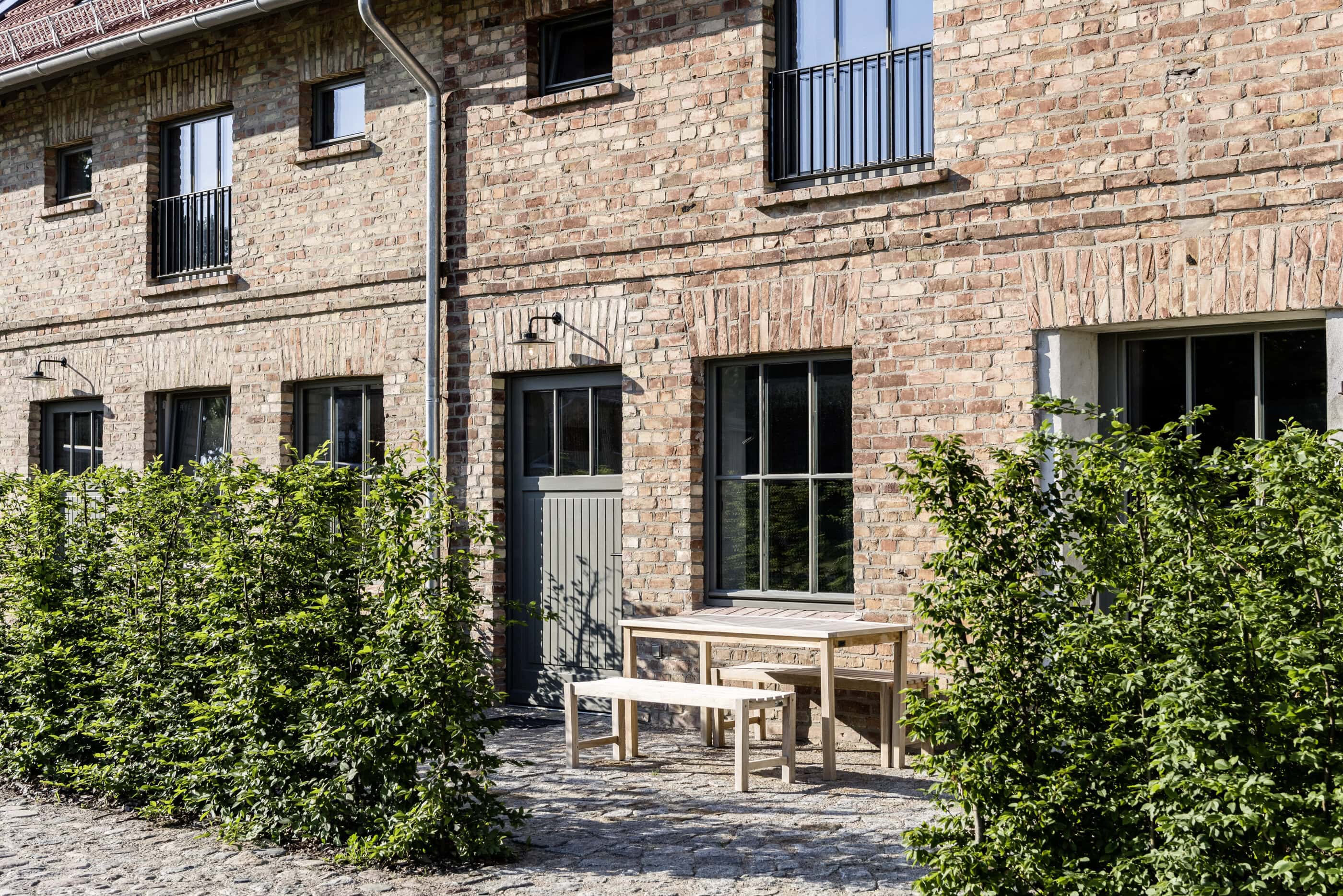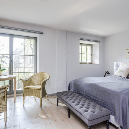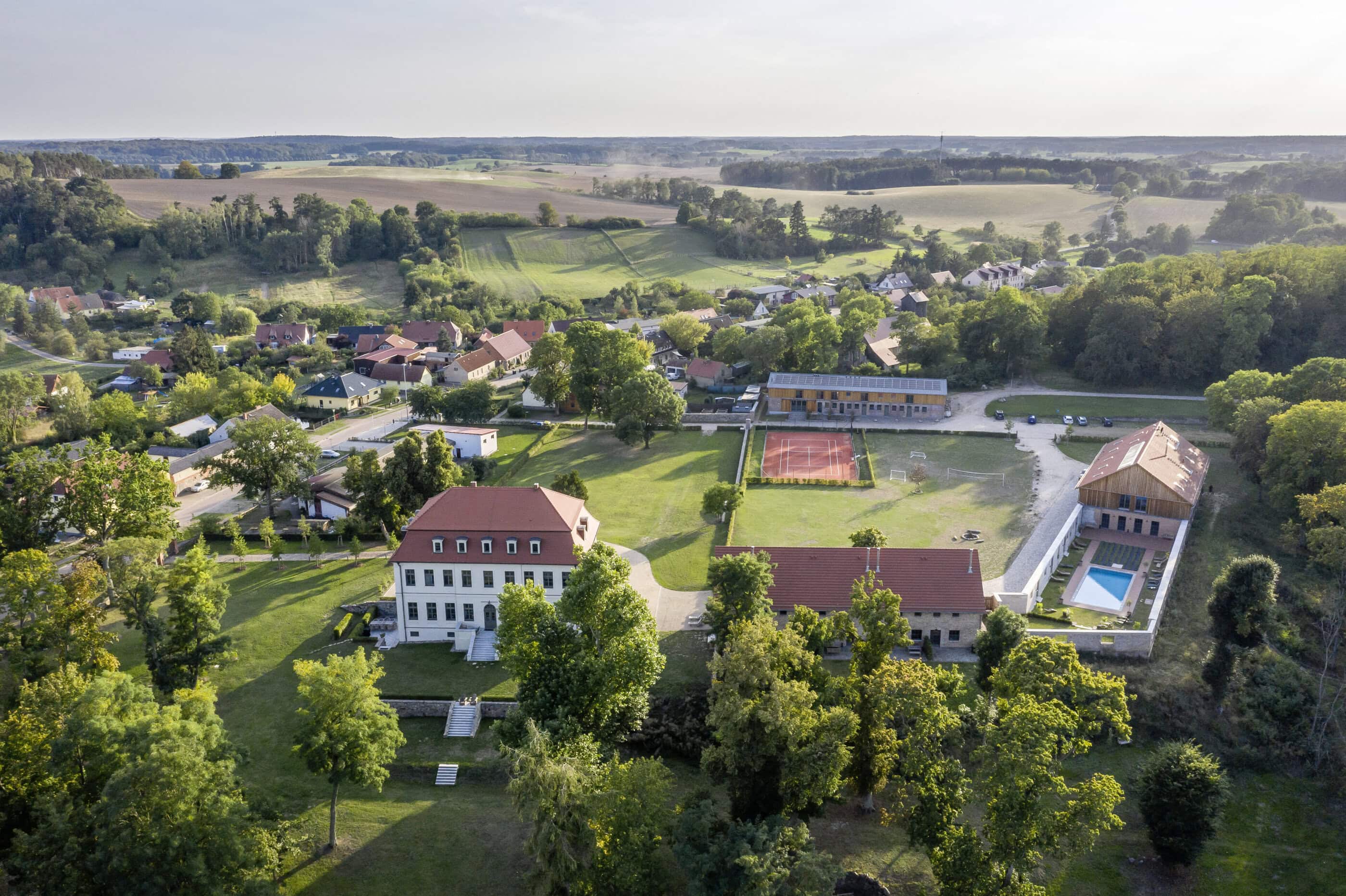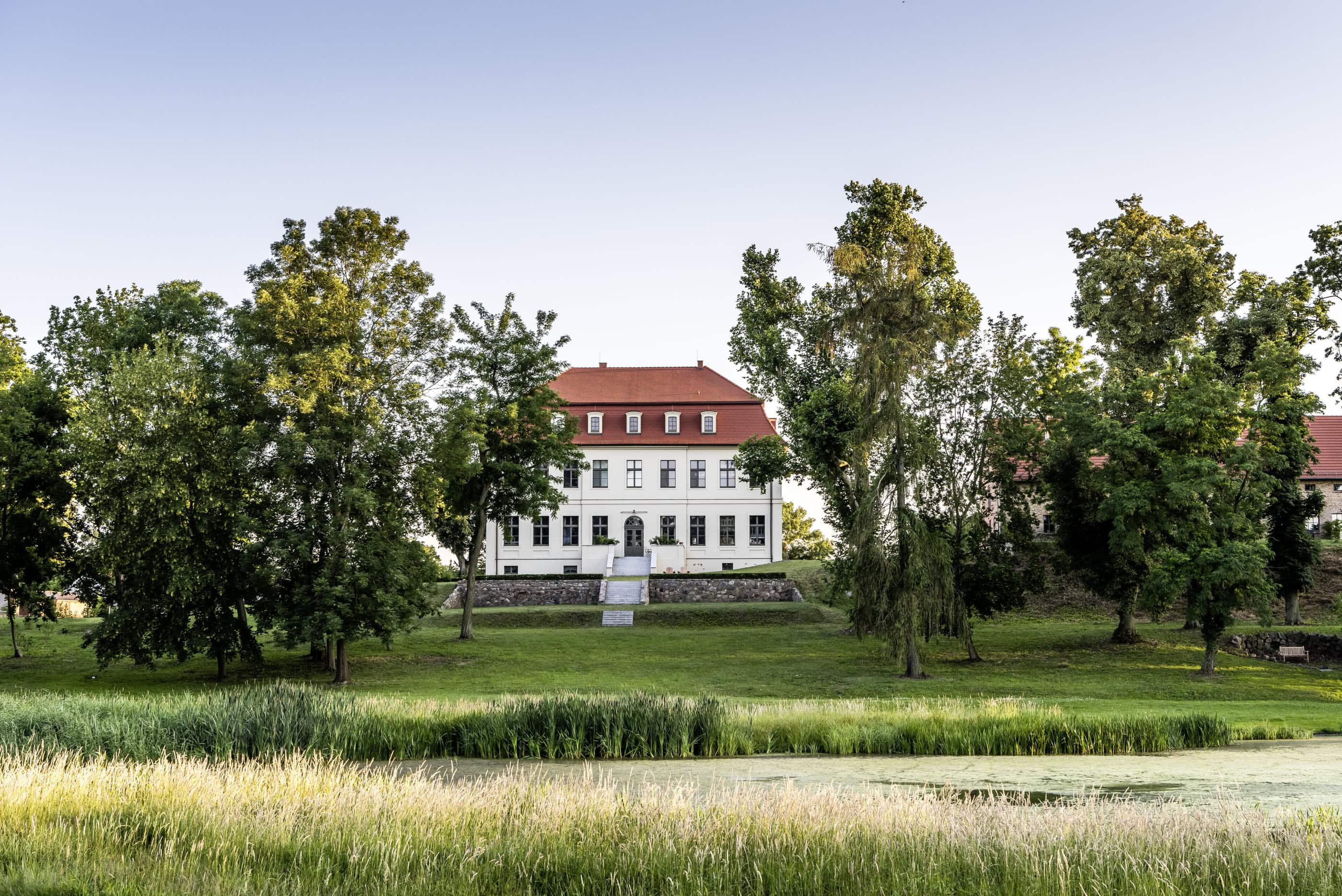 Old trees sway in the wind, somewhere the soft chirping of crickets can be heard; otherwise, a soothing sense of calm prevails. Gut Fredenwalde is nestled into a gently rolling landscape, surrounded by an expansive park – a place that feels more reminiscent of Tuscany than Brandenburg. And yet Berlin is only about an hour away, at the edge of the Schorfheide-Chorin Biosphere Reserve. Between 2016 and 2020, the ensemble was carefully restored in line with heritage preservation guidelines. From the outside, the baroque elegance of the manor house is striking; inside, the apartments are furnished in a skilful blend of old and new. Antiques meet selected design classics, fieldstone and brick contrast with larch wood and raw concrete. The accommodations are spread across several buildings, each following its own idea of retreat and togetherness. In the former stable, ten micro-apartments were created for two guests each – pared down, clear in design, with a small pantry kitchen. Those looking for more space will find it in the holiday apartments located in the gatehouse, the granary, or the coach house. Every apartment has been individually designed and sensitively attuned to the historic fabric.Particularly spacious is the “Schäferei” apartment, offering four double bedrooms, an additional communal room under the roof, and a private terrace where the day can begin slowly – and just as slowly come to an end. There is also room for gathering and special occasions. The communal space SPACE is ideal for celebrations, workshops, or long shared tables, while the event room in the former stable lends itself to seminars and yoga retreats. At least as much care was devoted to the park as to the buildings themselves. Paths lead past two ponds, benches appear exactly where they are needed, and meadows invite guests to play, read, or simply do nothing at all. Almost without trying, everyone finds their own personal favorite spot here.
