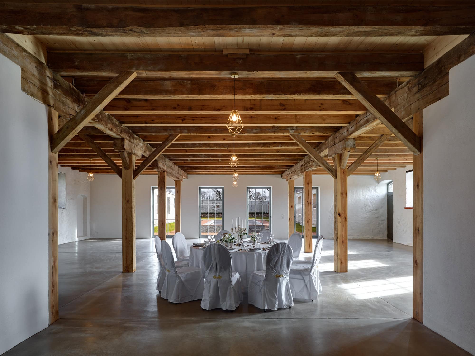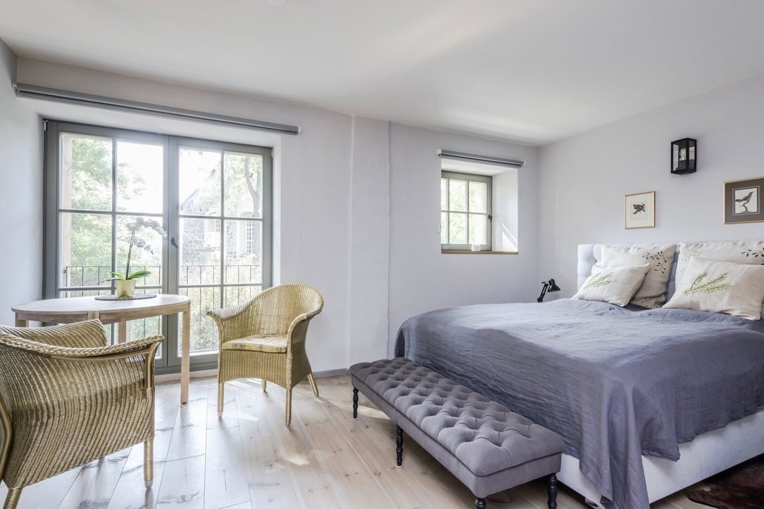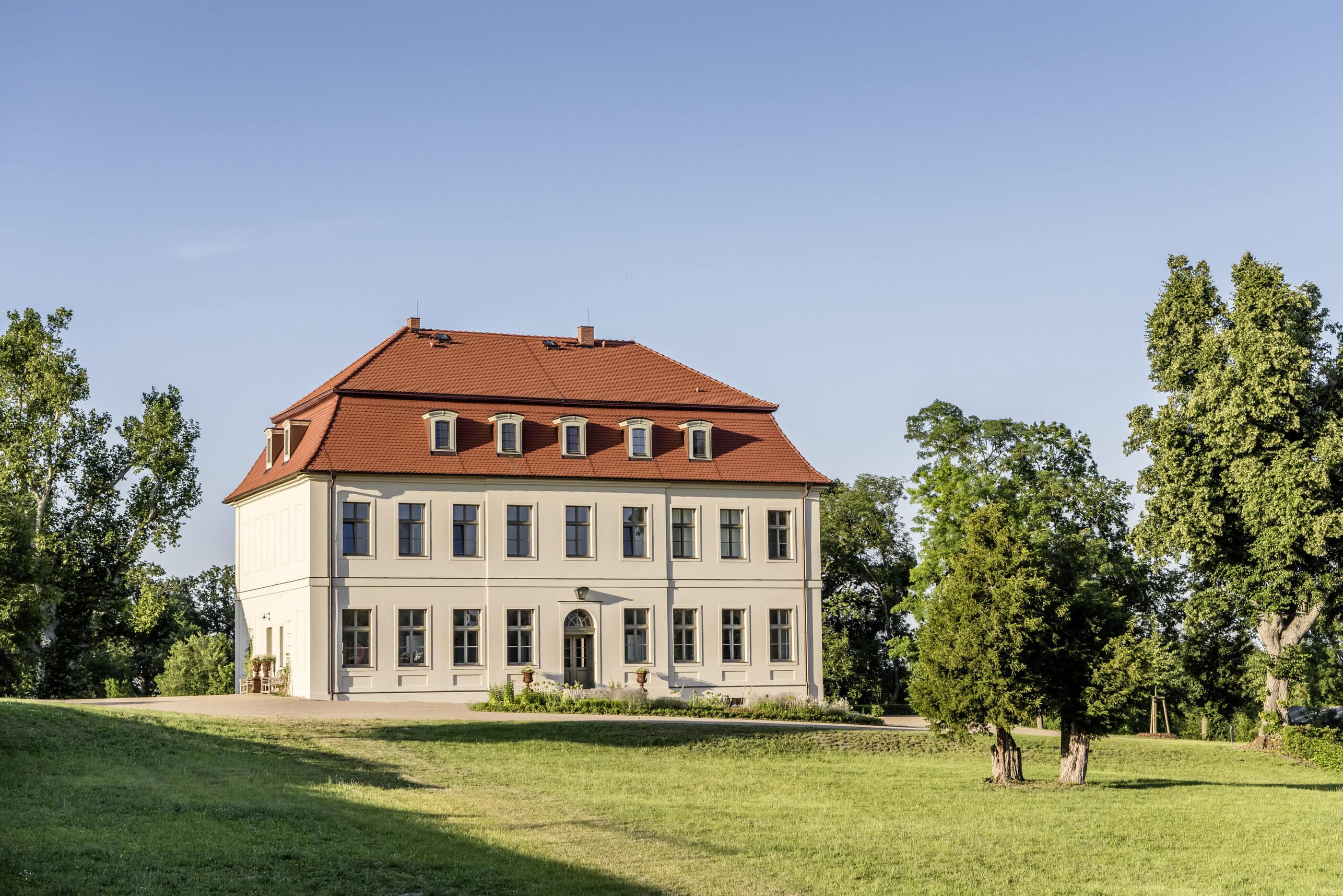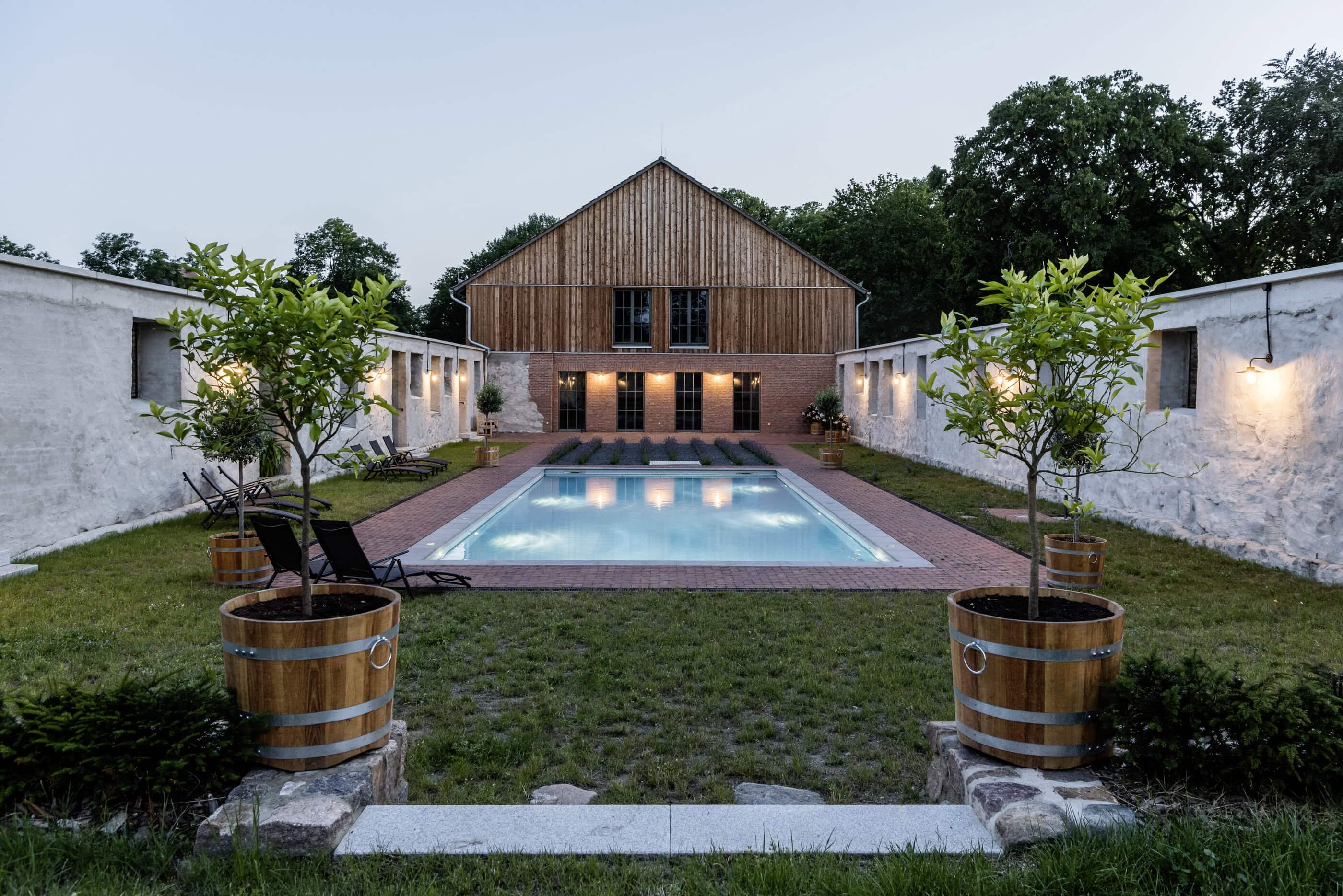 Old trees sway in the wind, somewhere the soft chirping of crickets can be heard; otherwise, a soothing sense of calm prevails. Gut Fredenwalde is nestled into a gently rolling landscape, surrounded by an expansive park – a place that feels more reminiscent of Tuscany than Brandenburg. And yet Berlin is only about an hour away, at the edge of the Schorfheide-Chorin Biosphere Reserve. Between 2016 and 2020, the ensemble was carefully restored in line with heritage preservation guidelines. From the outside, the baroque elegance of the manor house is striking; inside, the apartments are furnished in a skilful blend of old and new. Antiques meet selected design classics, fieldstone and brick contrast with larch wood and raw concrete. The accommodations are spread across several buildings, each following its own idea of retreat and togetherness. In the former stable, ten micro-apartments were created for two guests each – pared down, clear in design, with a small pantry kitchen. Those looking for more space will find it in the holiday apartments located in the gatehouse, the granary, or the coach house. Every apartment has been individually designed and sensitively attuned to the historic fabric.Particularly spacious is the “Schäferei” apartment, offering four double bedrooms, an additional communal room under the roof, and a private terrace where the day can begin slowly – and just as slowly come to an end. There is also room for gathering and special occasions. The communal space SPACE is ideal for celebrations, workshops, or long shared tables, while the event room in the former stable lends itself to seminars and yoga retreats. At least as much care was devoted to the park as to the buildings themselves. Paths lead past two ponds, benches appear exactly where they are needed, and meadows invite guests to play, read, or simply do nothing at all. Almost without trying, everyone finds their own personal favorite spot here.