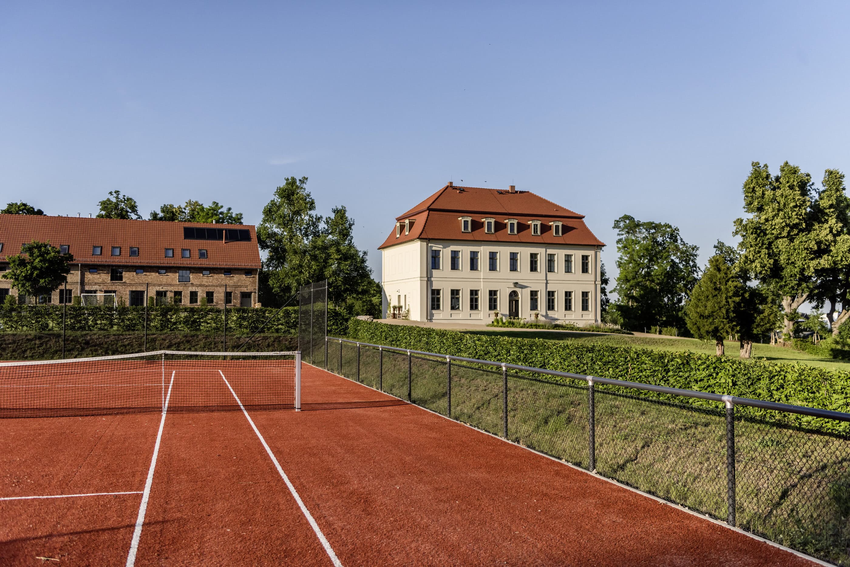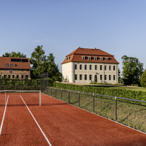 - In summer, life takes place outside. Heated pool, tennis court, volleyball court and fire pit pave the way for outdoor activities in the estate park