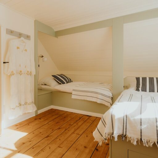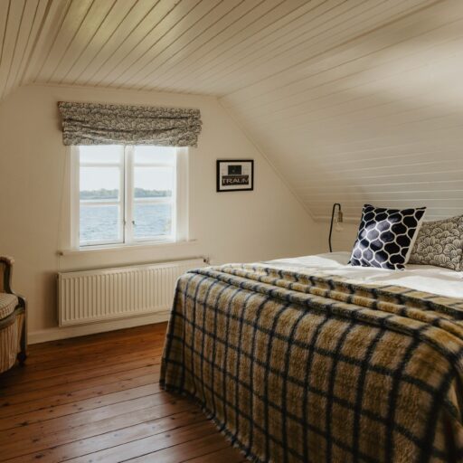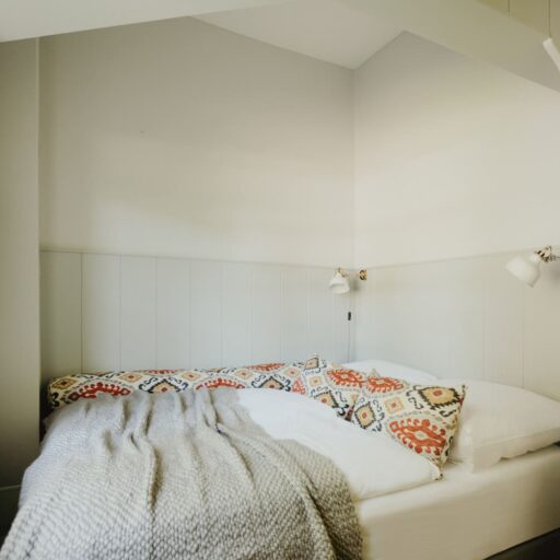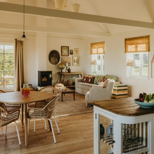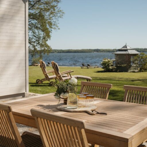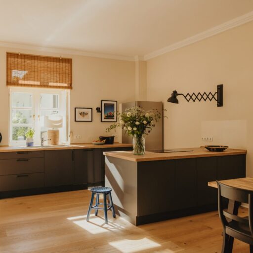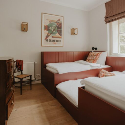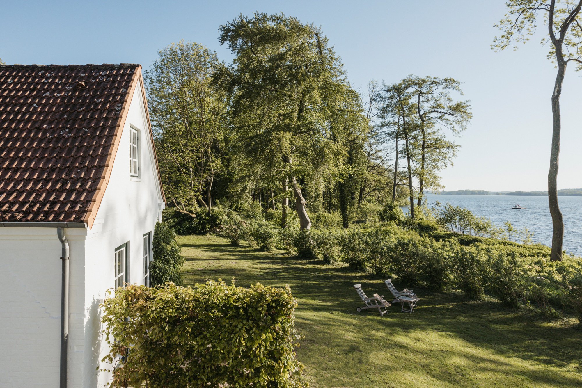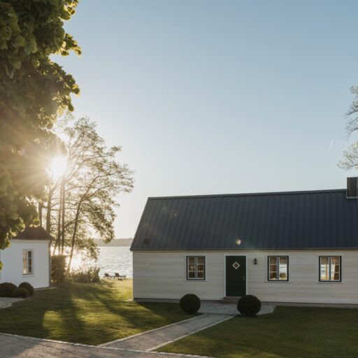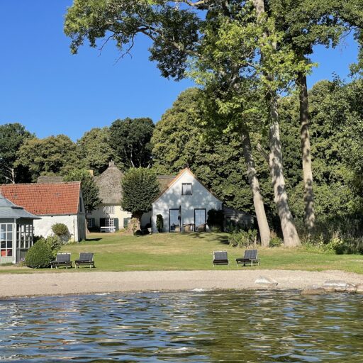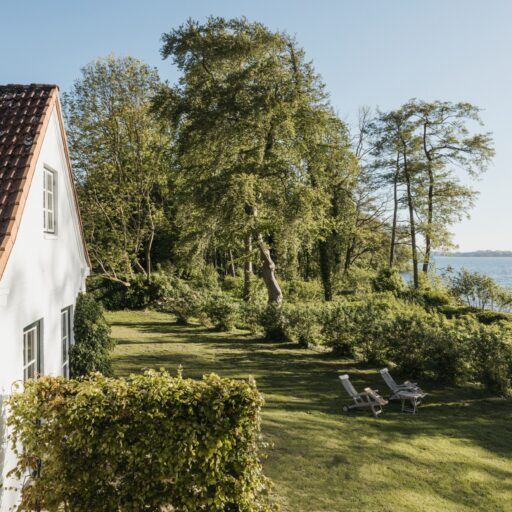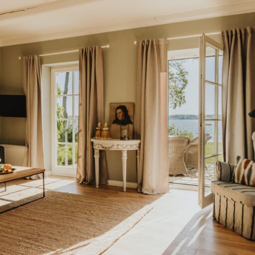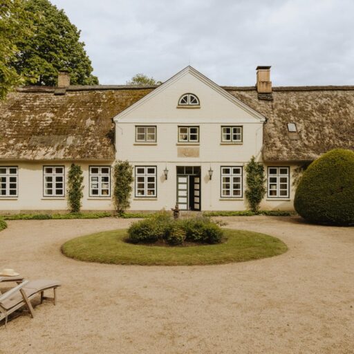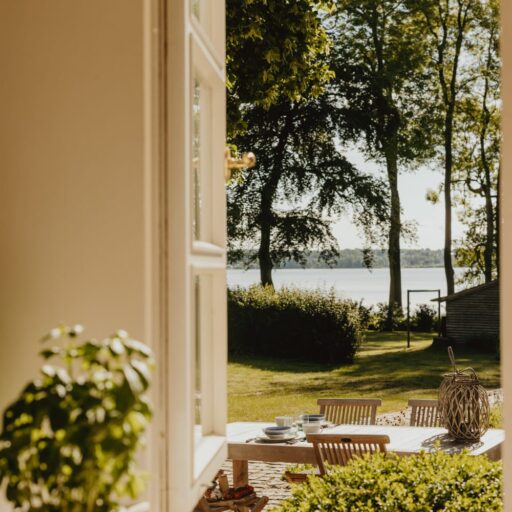 It’s one of those places that reminds us how good it is to spend time surrounded by nature. How delicious apples taste when we pick them fresh from the tree. The scent of wildflowers, the feeling of a morning dip in the lake or a long fall walk. The journey alone offers us glimpses of beauty. All around are dense forests, fields and meadows and grazing horses. Ancient oak trees line the avenue that leads to the ensemble of white houses. Arrive and breathe in the country air! Gut Nehmten, family-owned since 1768, is located in the conservation area directly on the shores of Lake Plön in Schleswig-Holstein. Four boutique apartments have been built here since 2022, all full of rural comfort, historic details, cozy corners with armchairs and sofas and high-quality fixtures and fittings. The two-story Backhaus with its three bedrooms and the small Seehaus for two people are the place to be for anyone who likes to be as close to the water as possible while enjoying the view over the deep blue lake from their own terrace. There are also two vacation apartments in the Alte Meierei: One with particularly beautiful original elements such as a stone floor, cast-iron pillars and industrial-style lattice windows, the other featuring oiled floorboards and a loft character. They’re all furnished differently, but probably the best thing they all have in common—apart from the stylish interior—is a fireplace in each accommodation where you can listen to the fire crackling. When you’re lost in your own thoughts in the tree swing on the shore, enjoying food straight from the barbecue under old trees on a summer evening or encountering an otter while paddling, it soon becomes clear that great happiness can be found here, above all, in the simple things.
