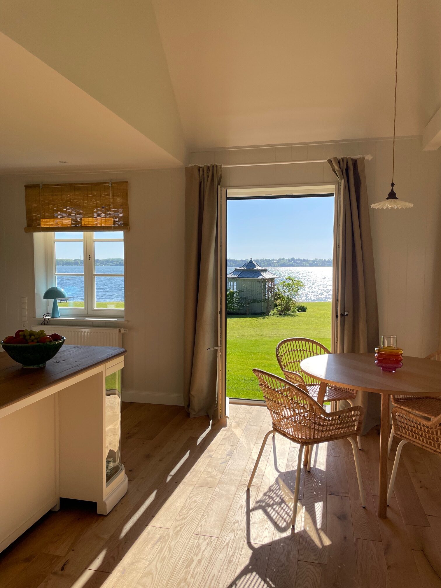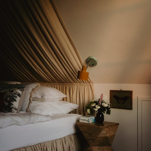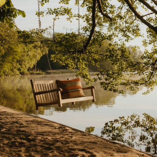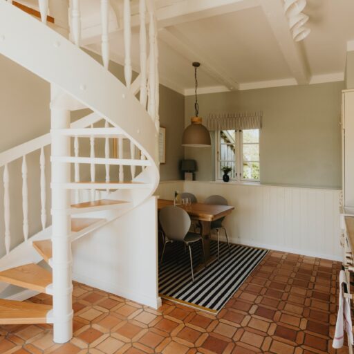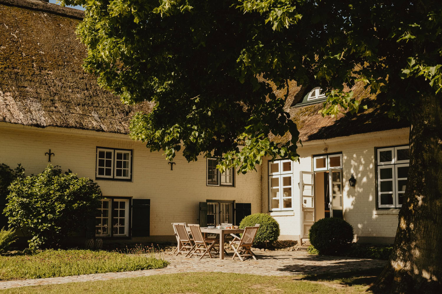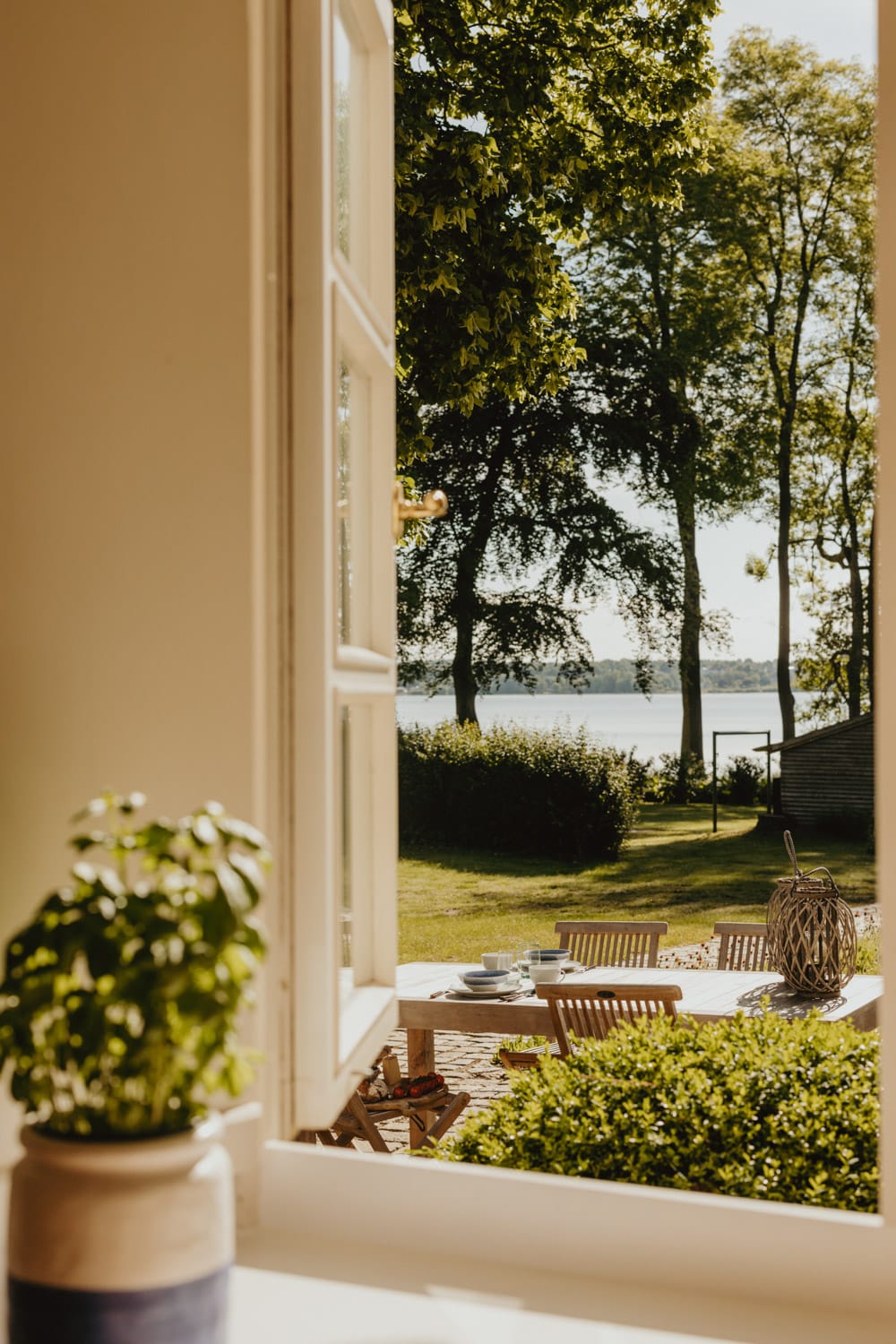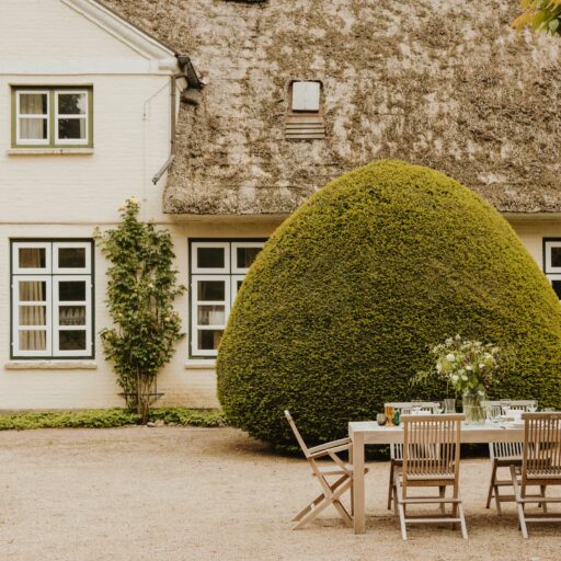 It’s one of those places that reminds us how good it is to spend time surrounded by nature. How delicious apples taste when we pick them fresh from the tree. The scent of wildflowers, the feeling of a morning dip in the lake or a long fall walk. The journey alone offers us glimpses of beauty. All around are dense forests, fields and meadows and grazing horses. Ancient oak trees line the avenue that leads to the ensemble of white houses. Arrive and breathe in the country air! Gut Nehmten, family-owned since 1768, is located in the conservation area directly on the shores of Lake Plön in Schleswig-Holstein. Four boutique apartments have been built here since 2022, all full of rural comfort, historic details, cozy corners with armchairs and sofas and high-quality fixtures and fittings. The two-story Backhaus with its three bedrooms and the small Seehaus for two people are the place to be for anyone who likes to be as close to the water as possible while enjoying the view over the deep blue lake from their own terrace. There are also two vacation apartments in the Alte Meierei: One with particularly beautiful original elements such as a stone floor, cast-iron pillars and industrial-style lattice windows, the other featuring oiled floorboards and a loft character. They’re all furnished differently, but probably the best thing they all have in common—apart from the stylish interior—is a fireplace in each accommodation where you can listen to the fire crackling. When you’re lost in your own thoughts in the tree swing on the shore, enjoying food straight from the barbecue under old trees on a summer evening or encountering an otter while paddling, it soon becomes clear that great happiness can be found here, above all, in the simple things.