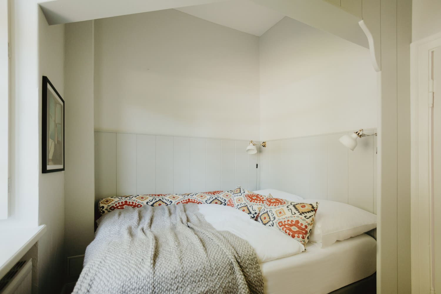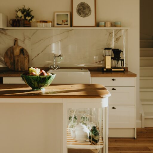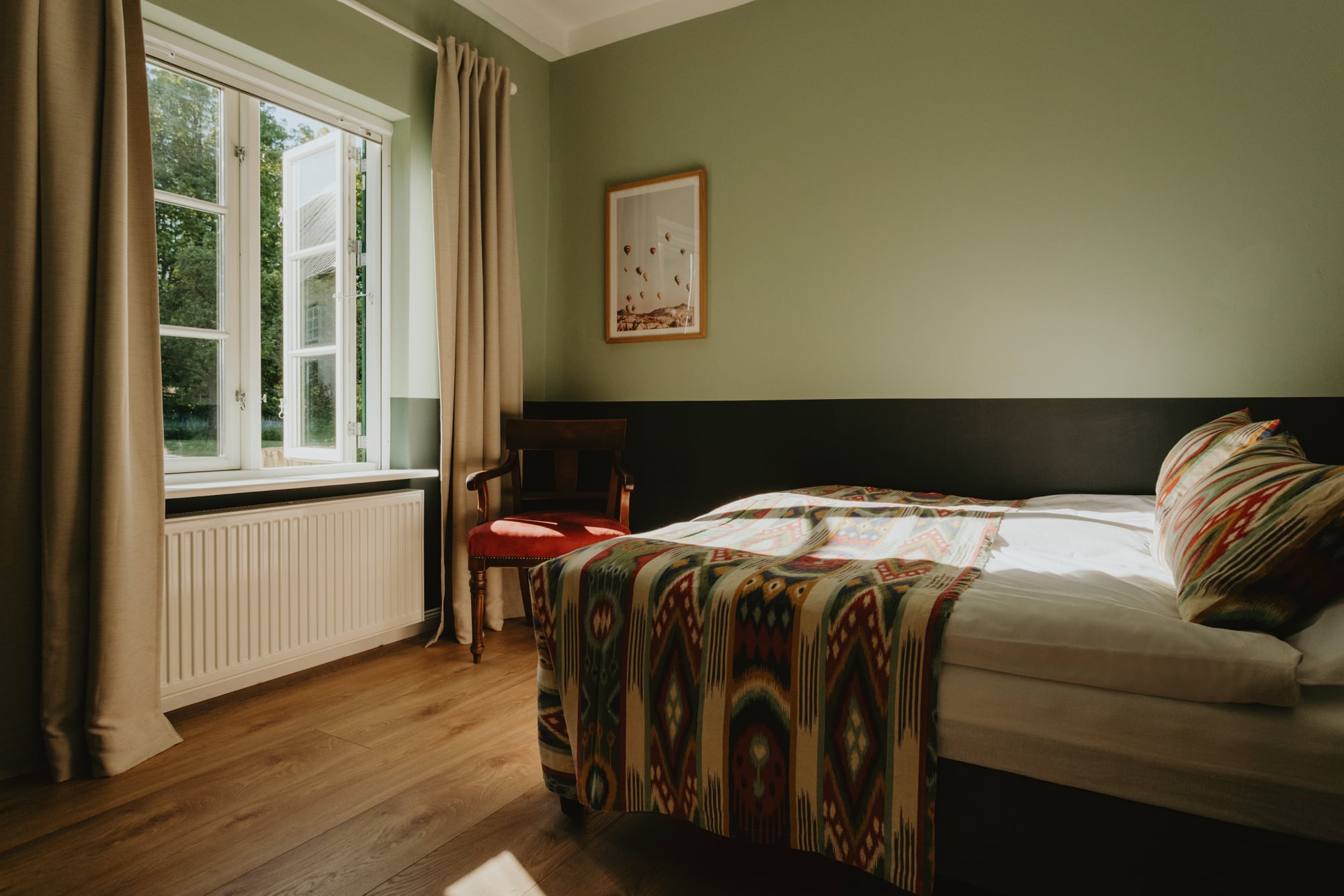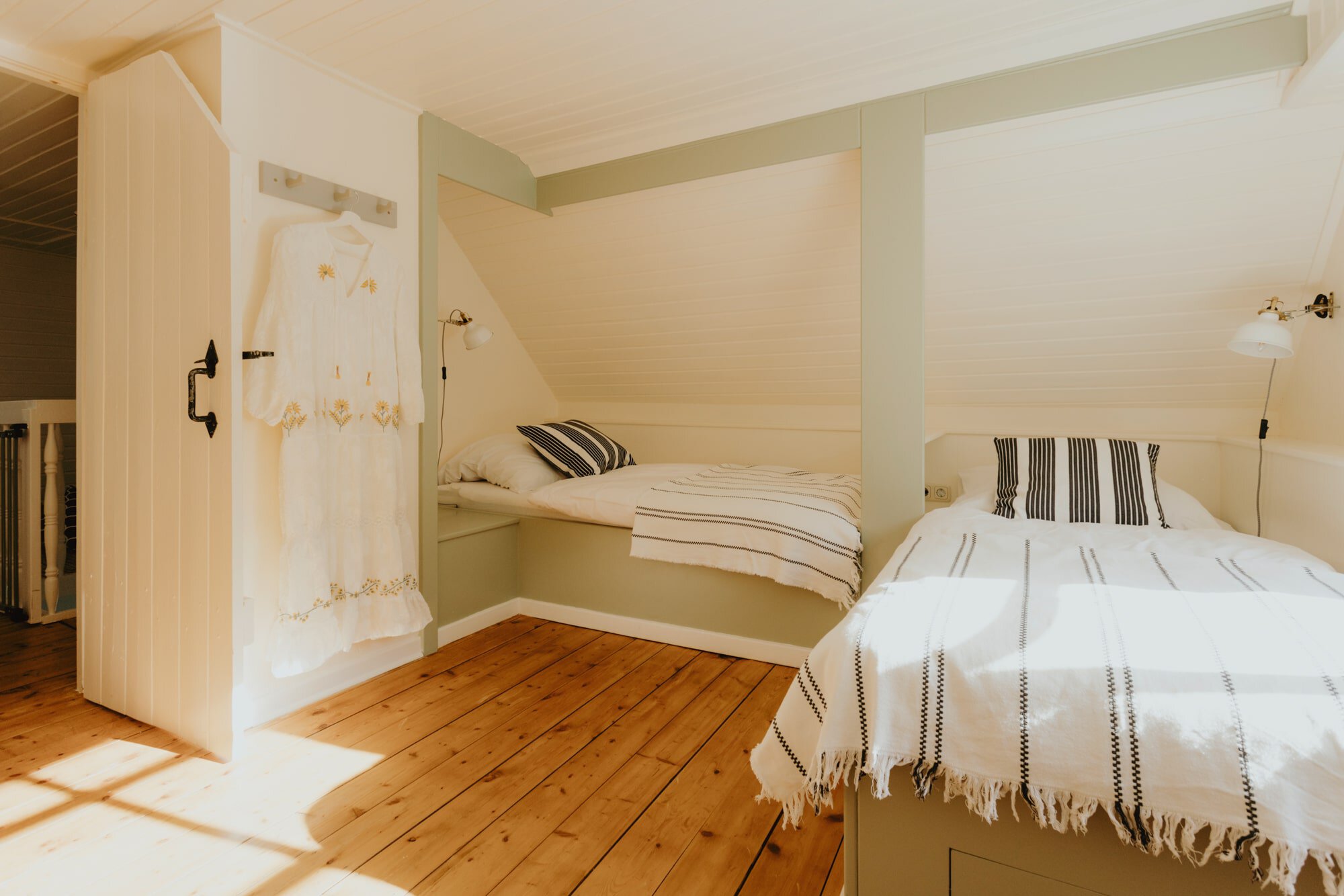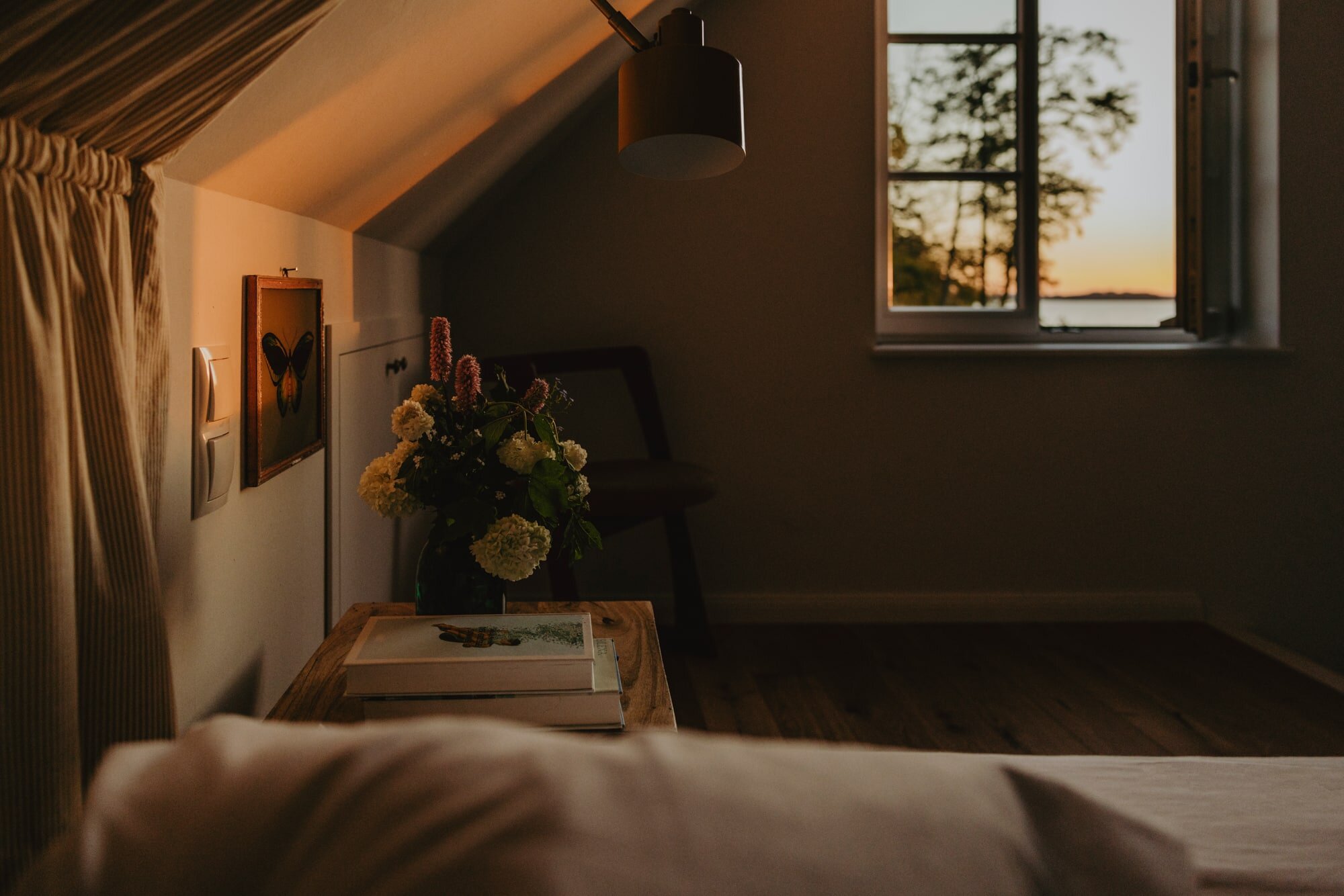 It’s one of those places that reminds us how good it is to spend time surrounded by nature. How delicious apples taste when we pick them fresh from the tree. The scent of wildflowers, the feeling of a morning dip in the lake or a long fall walk. The journey alone offers us glimpses of beauty. All around are dense forests, fields and meadows and grazing horses. Ancient oak trees line the avenue that leads to the ensemble of white houses. Arrive and breathe in the country air! Gut Nehmten, family-owned since 1768, is located in the conservation area directly on the shores of Lake Plön in Schleswig-Holstein. Four boutique apartments have been built here since 2022, all full of rural comfort, historic details, cozy corners with armchairs and sofas and high-quality fixtures and fittings. The two-story Backhaus with its three bedrooms and the small Seehaus for two people are the place to be for anyone who likes to be as close to the water as possible while enjoying the view over the deep blue lake from their own terrace. There are also two vacation apartments in the Alte Meierei: One with particularly beautiful original elements such as a stone floor, cast-iron pillars and industrial-style lattice windows, the other featuring oiled floorboards and a loft character. They’re all furnished differently, but probably the best thing they all have in common—apart from the stylish interior—is a fireplace in each accommodation where you can listen to the fire crackling. When you’re lost in your own thoughts in the tree swing on the shore, enjoying food straight from the barbecue under old trees on a summer evening or encountering an otter while paddling, it soon becomes clear that great happiness can be found here, above all, in the simple things.