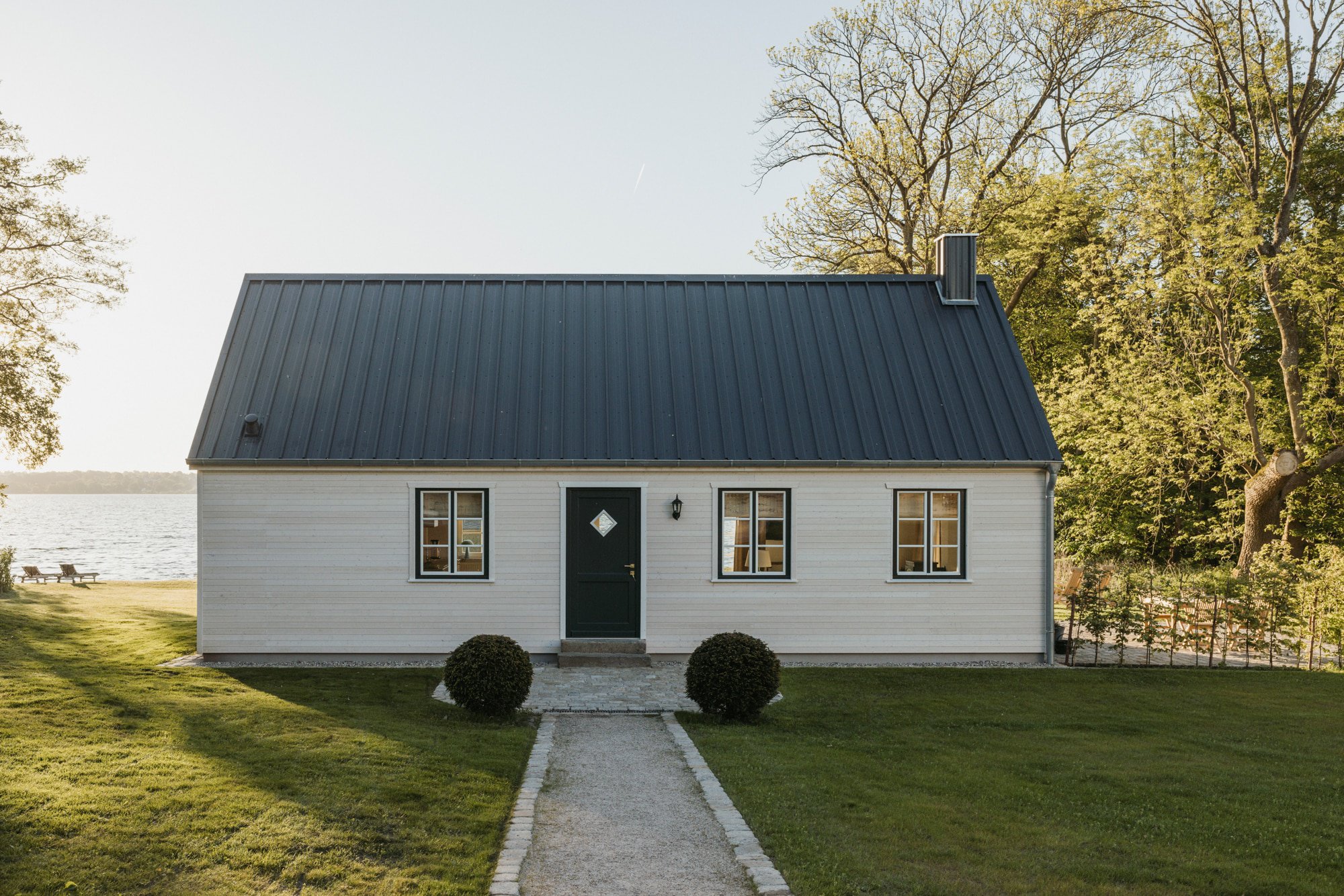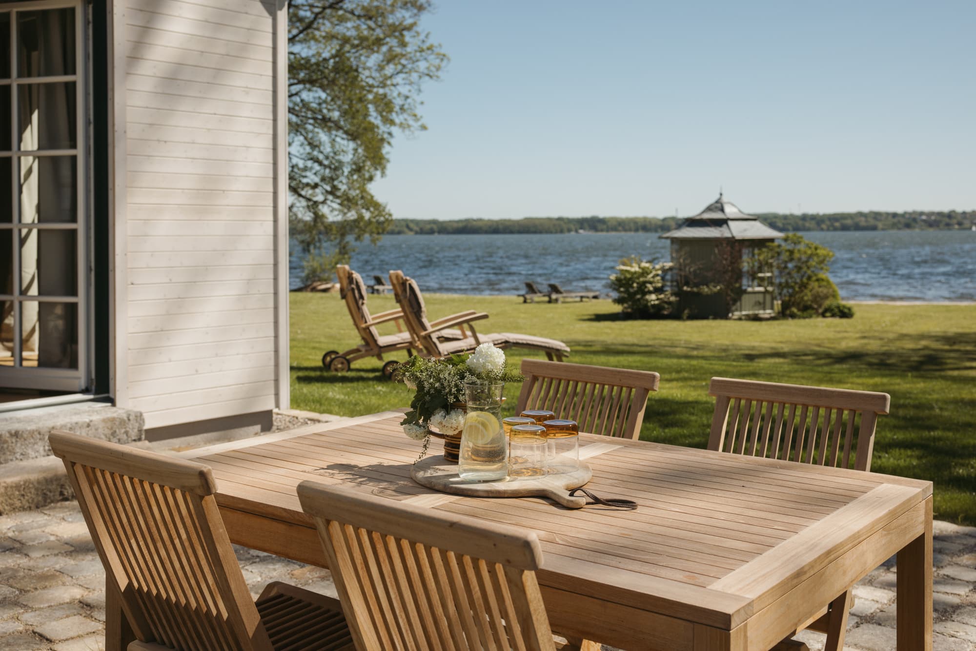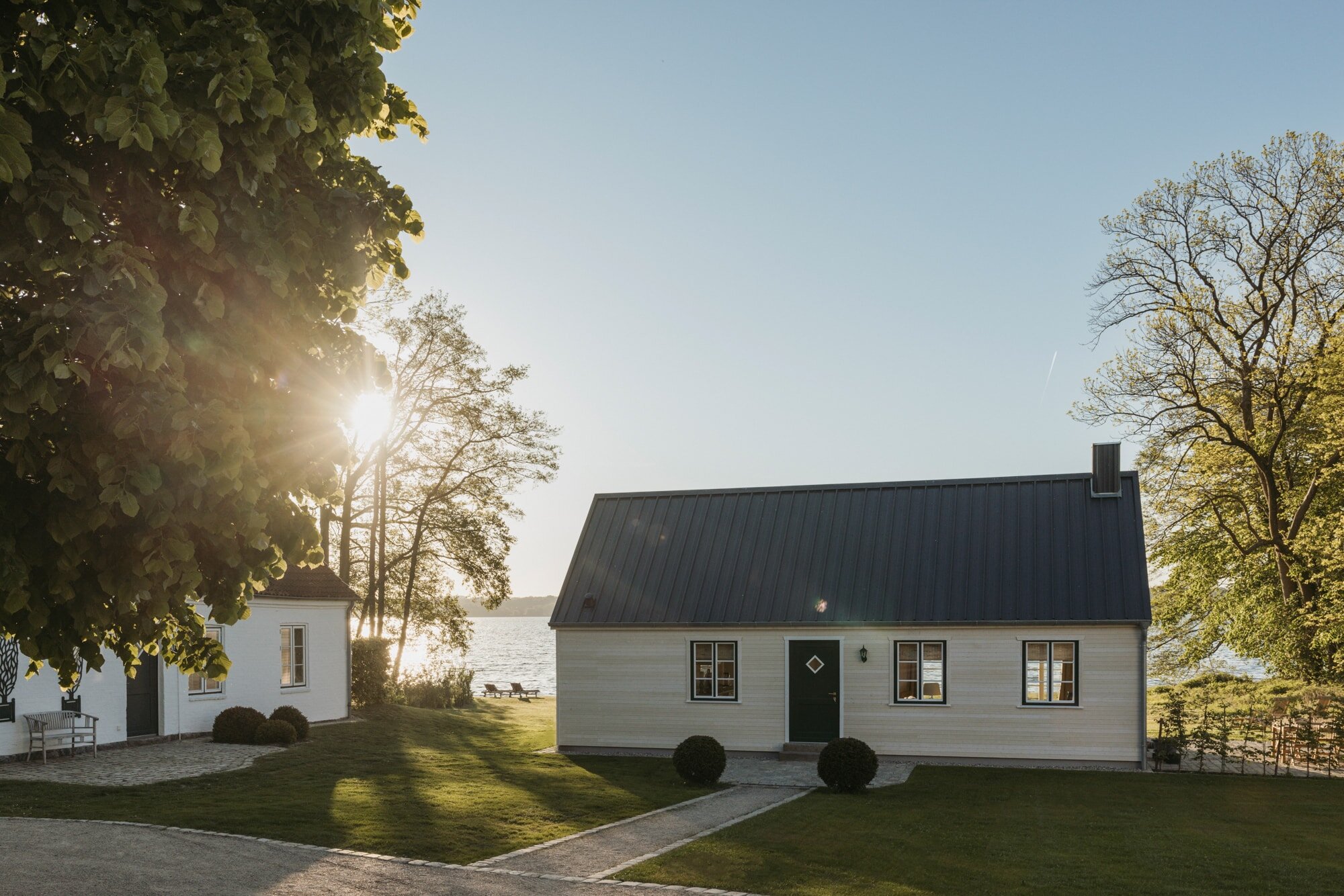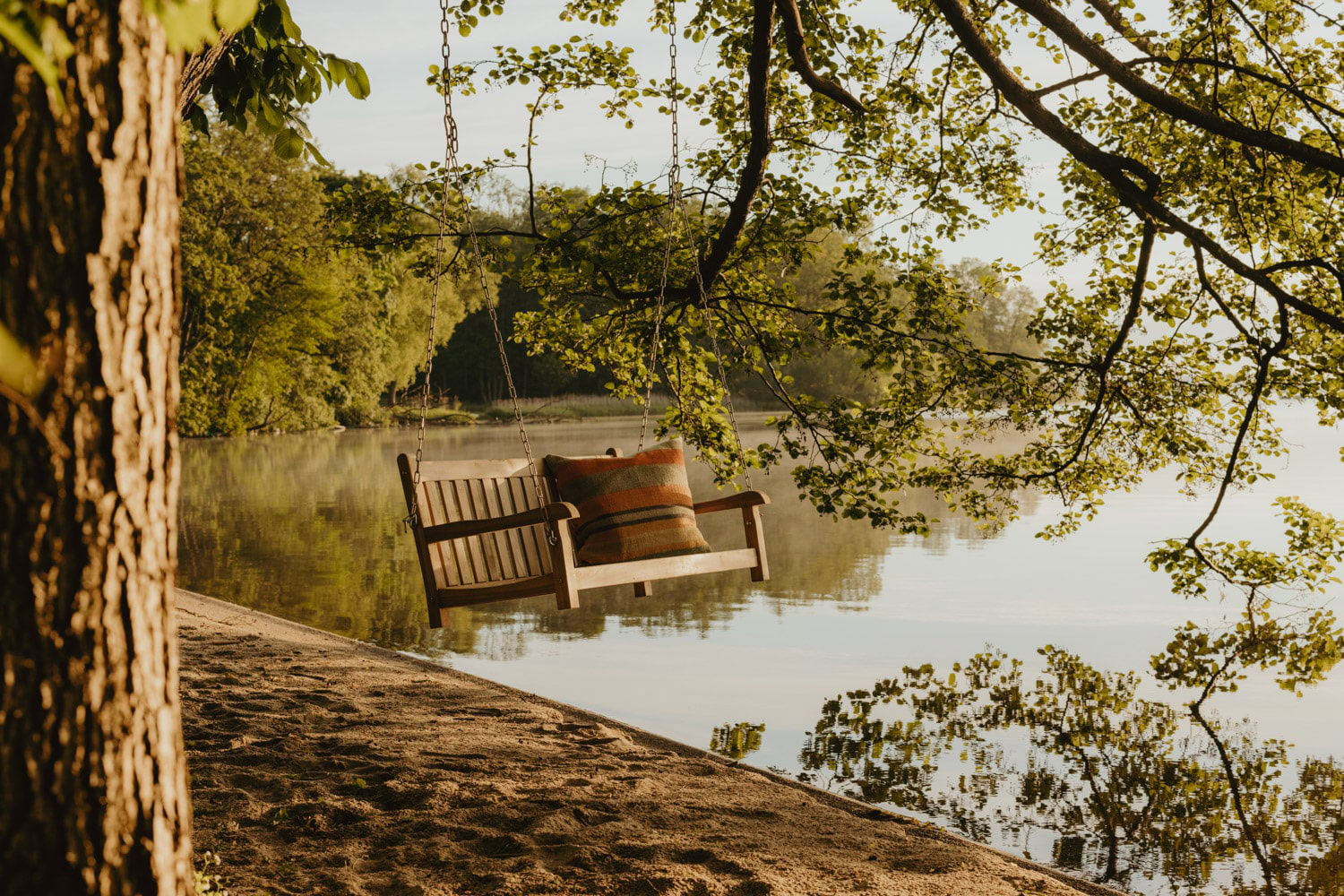 • The beach area by the lake, which belongs to the estate—enjoy the meadow, sand, a small pavilion and cushioned sun loungers. From here, you can swim to the swimming pontoon in the lake and hone your diving technique—or warm yourself in the sun.