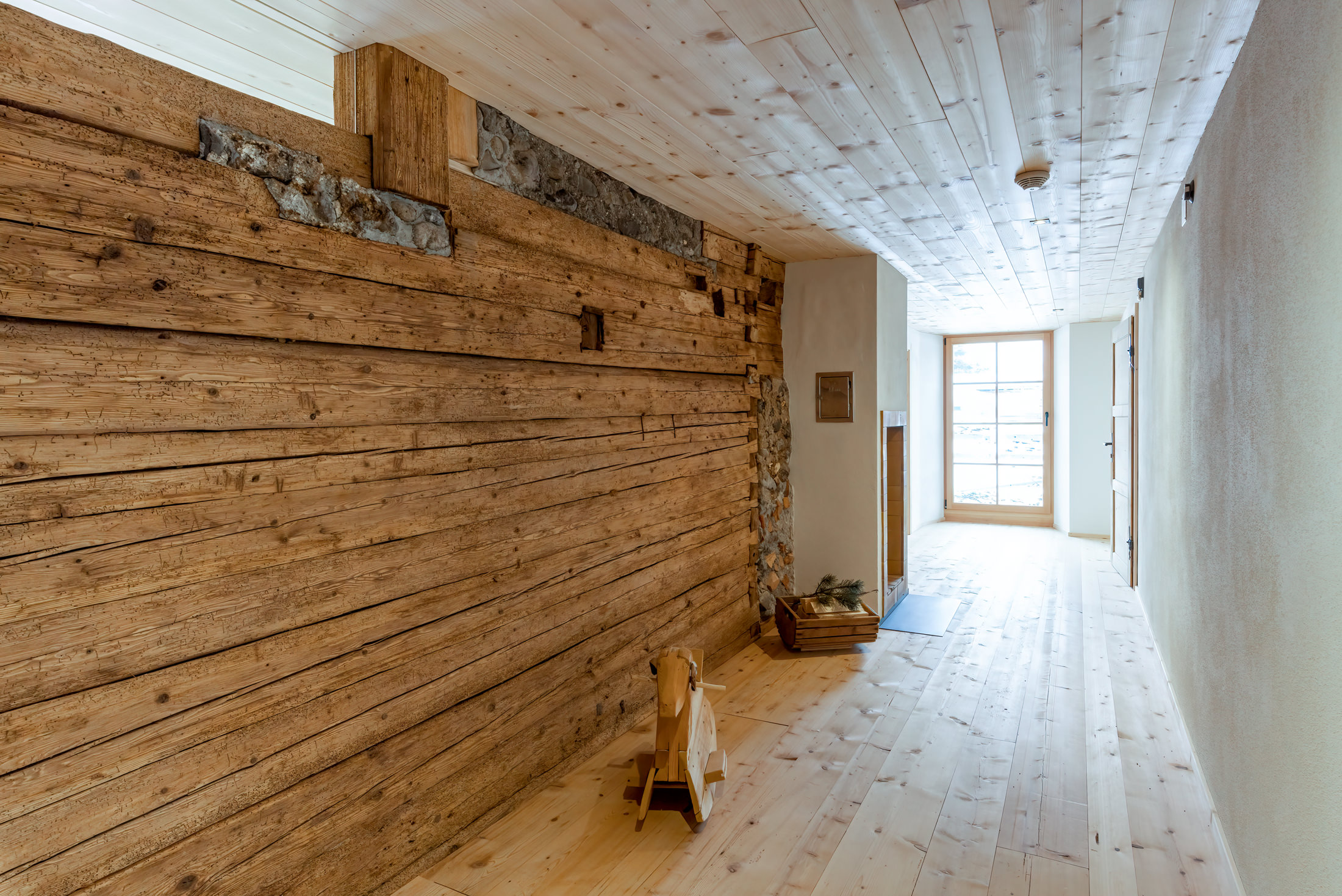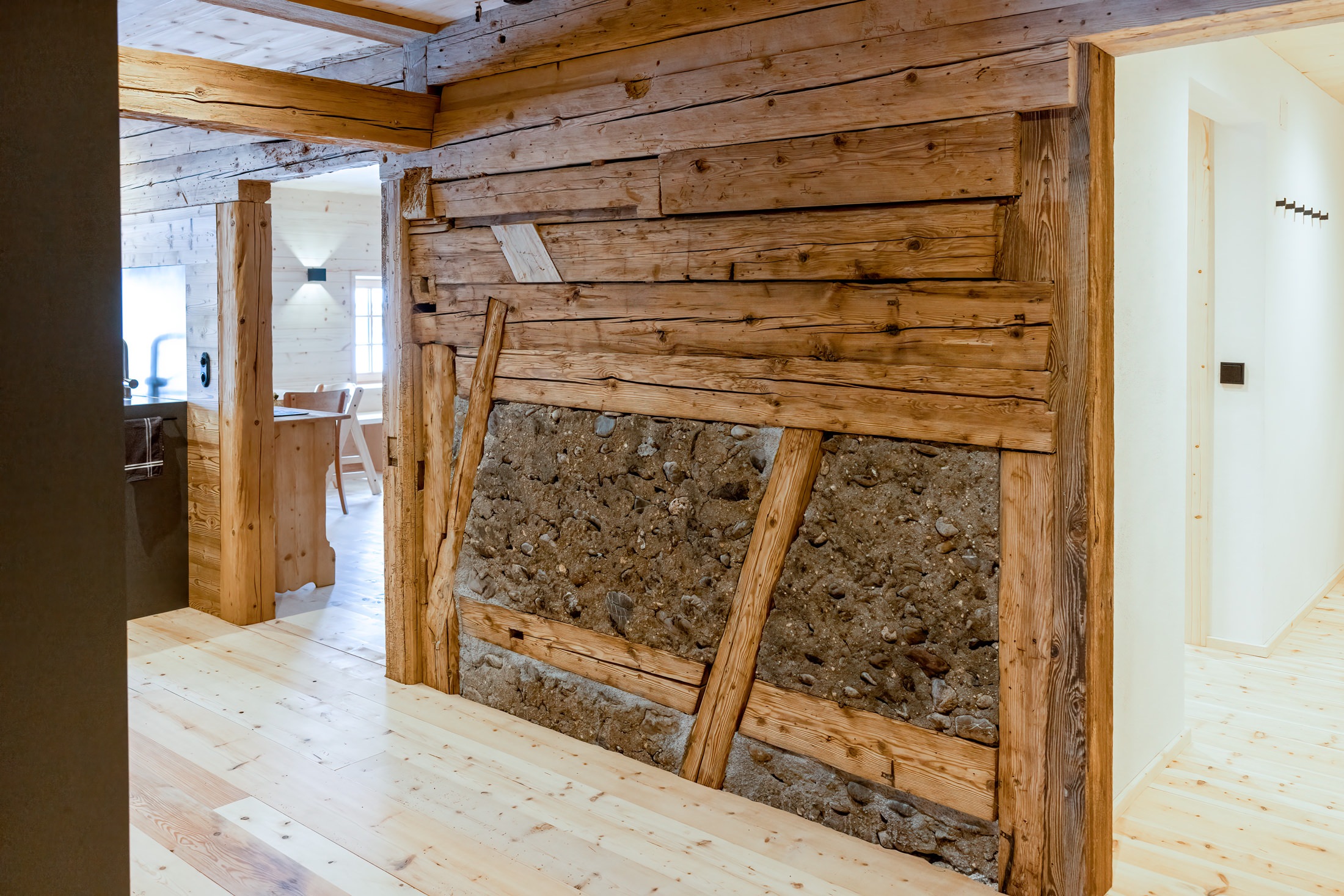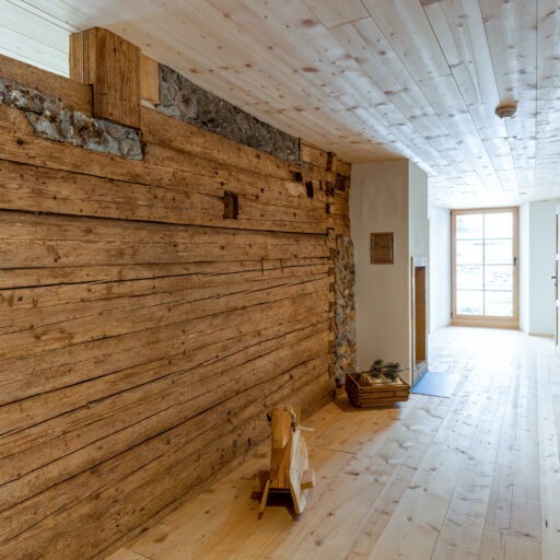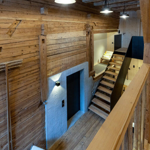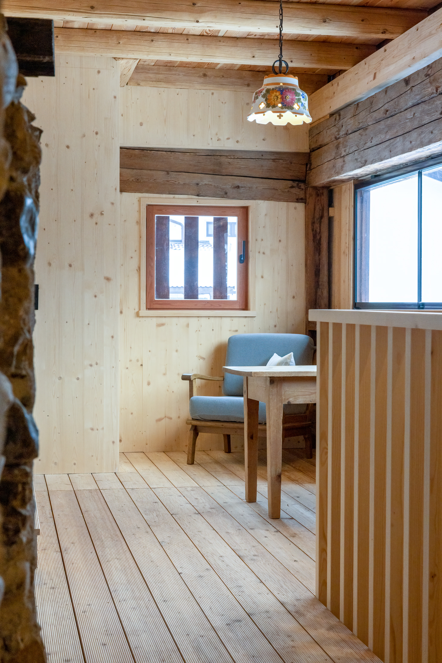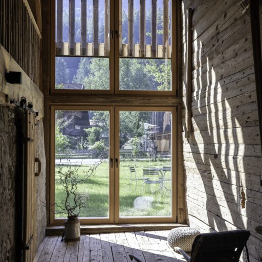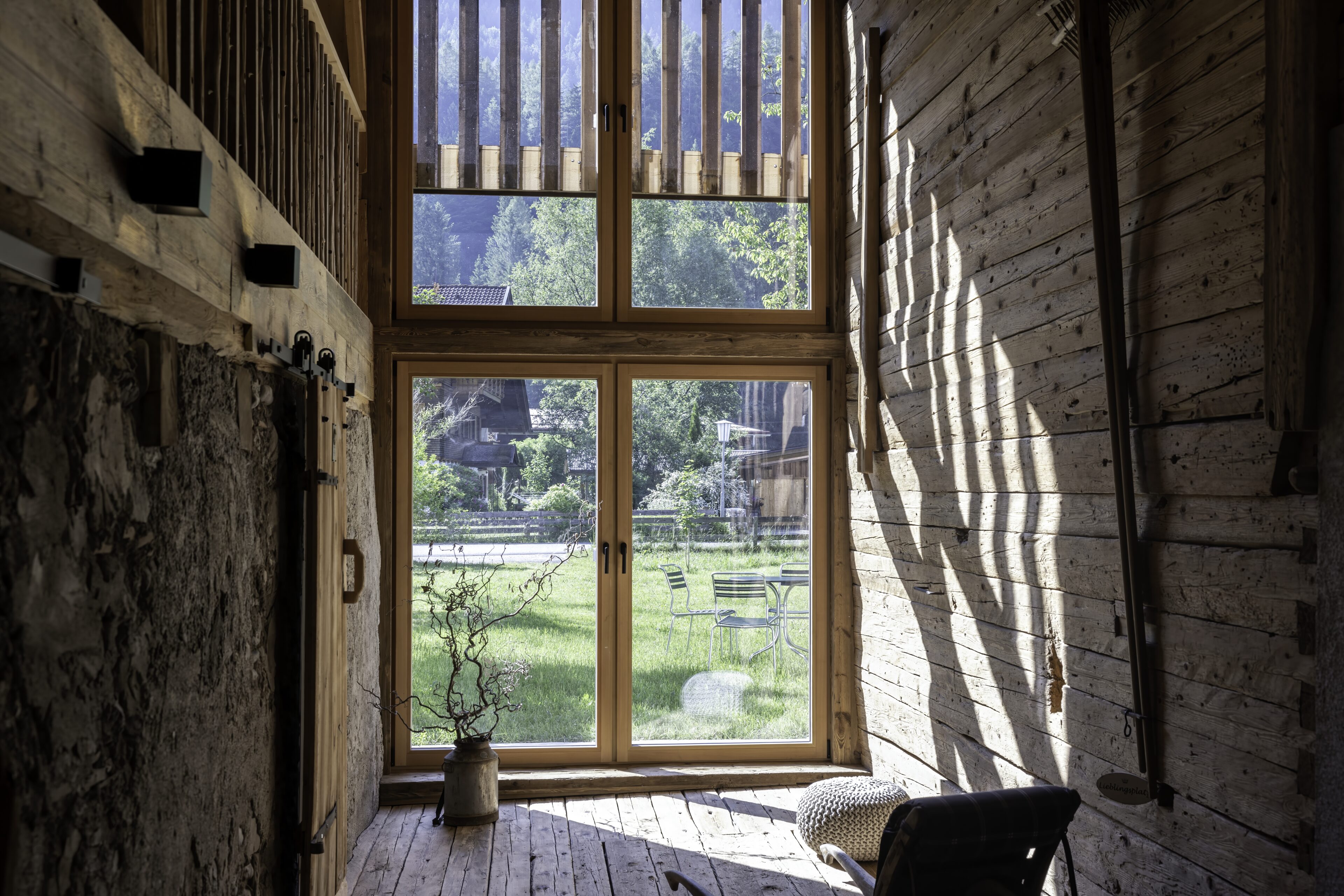 - The apartments have spots that are real favorites: In the first-story apartment, it’s the former barn entrance with its huge floor-to-ceiling window that floods the high room with warm light; in the upper apartment, it’s the cozy loggia with a view of the Alps.