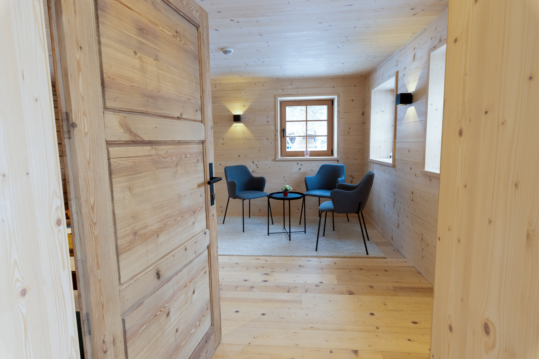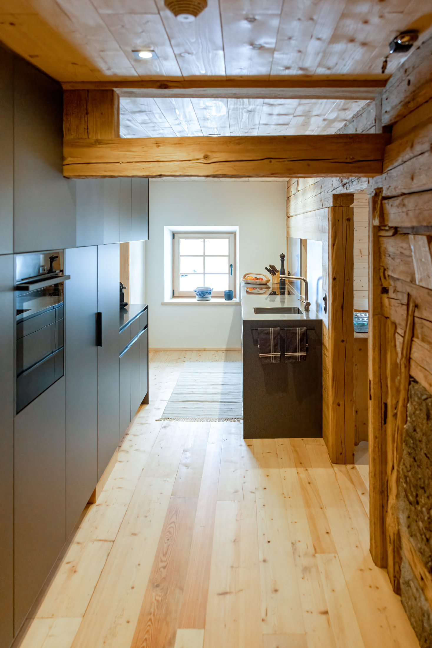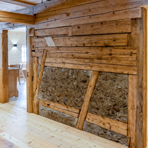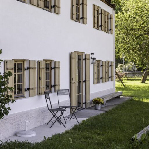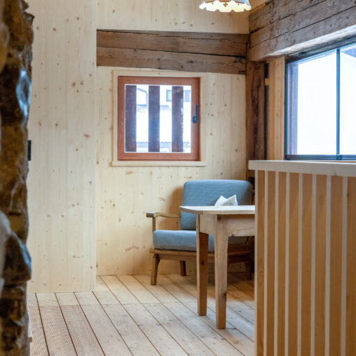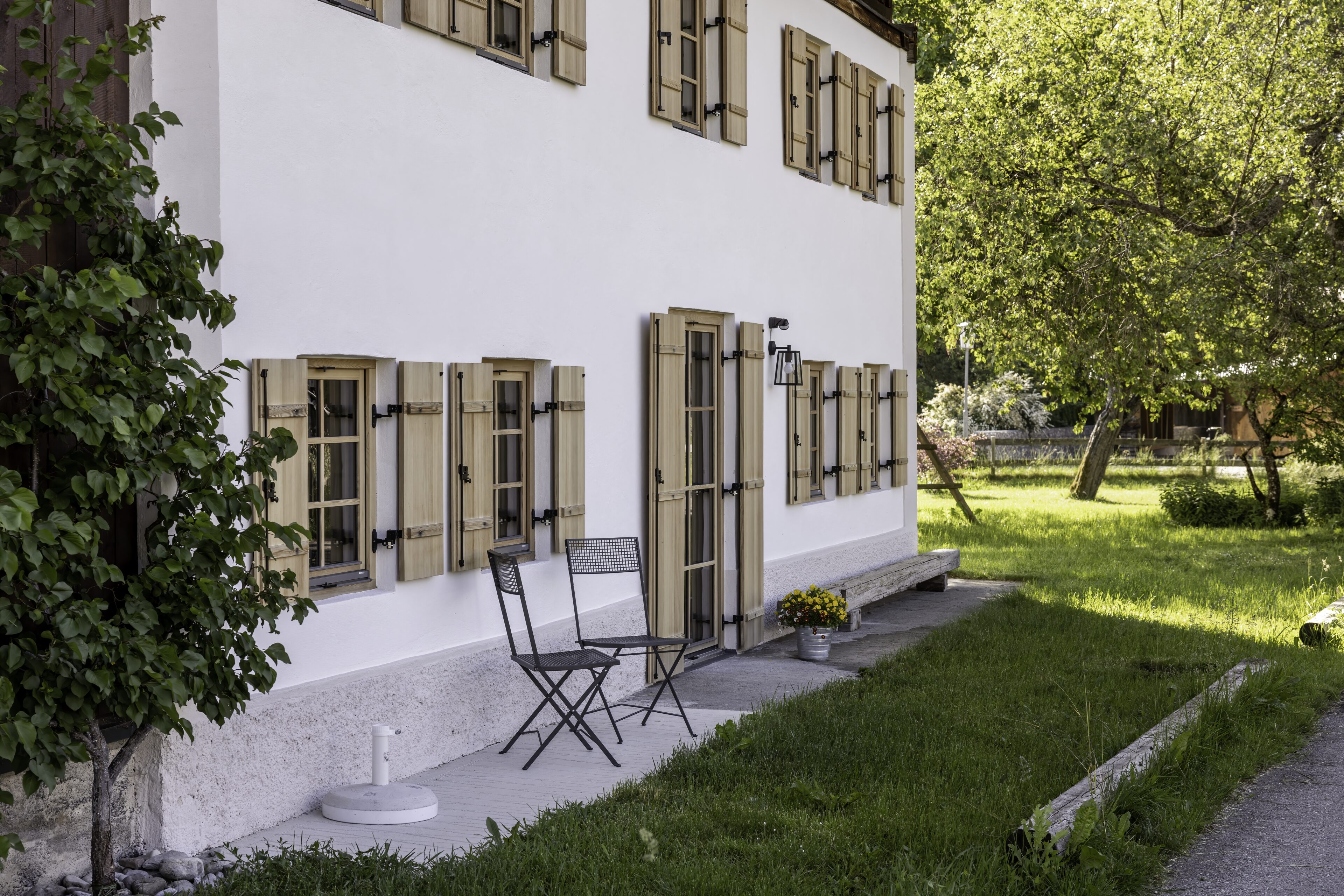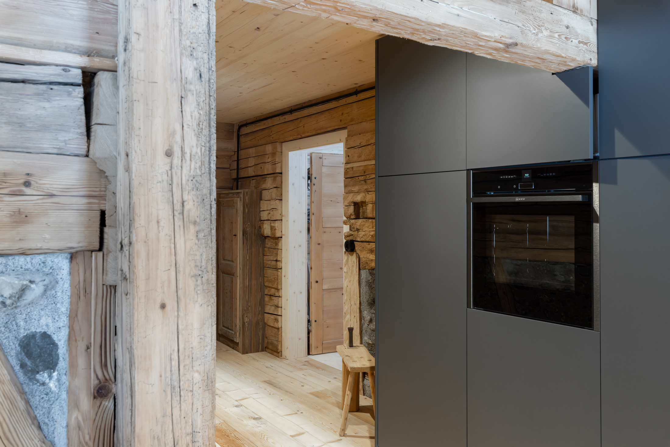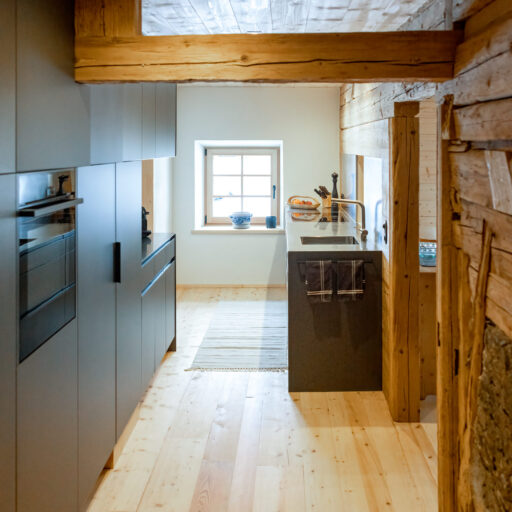 - The apartments have spots that are real favorites: In the first-story apartment, it’s the former barn entrance with its huge floor-to-ceiling window that floods the high room with warm light; in the upper apartment, it’s the cozy loggia with a view of the Alps.