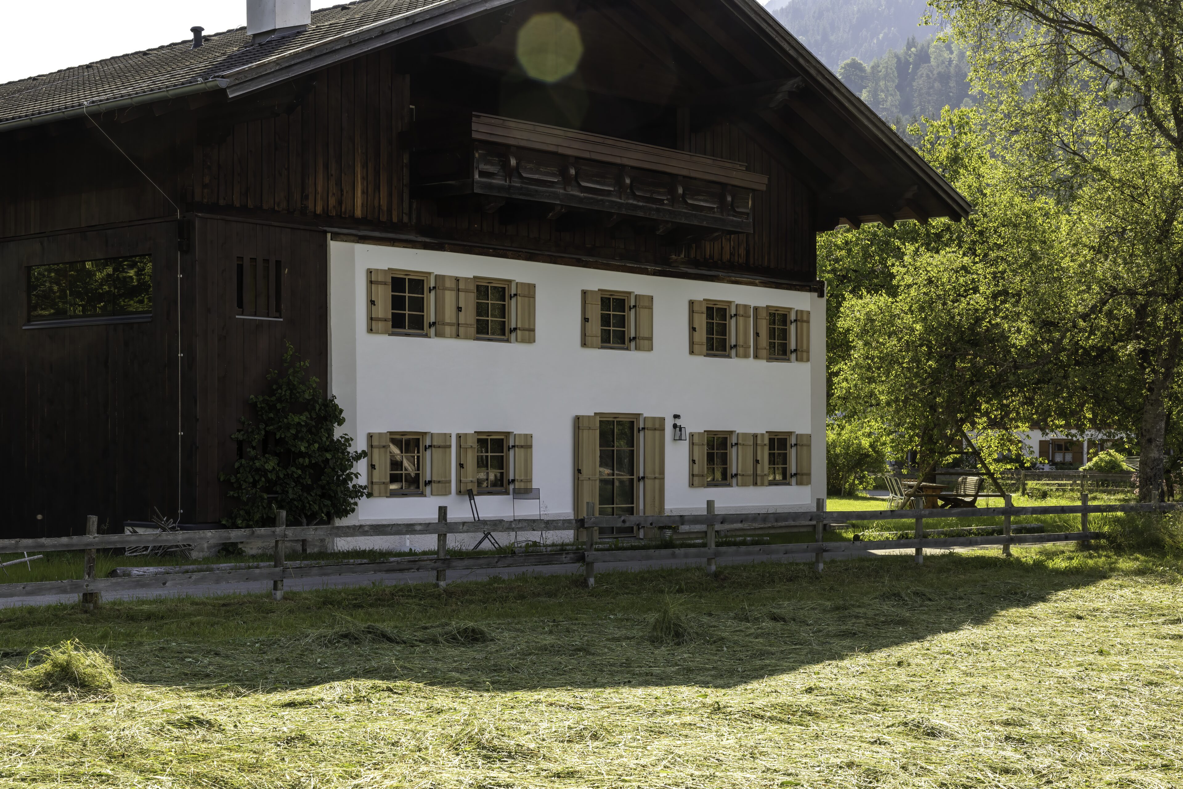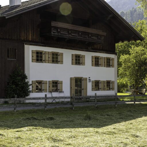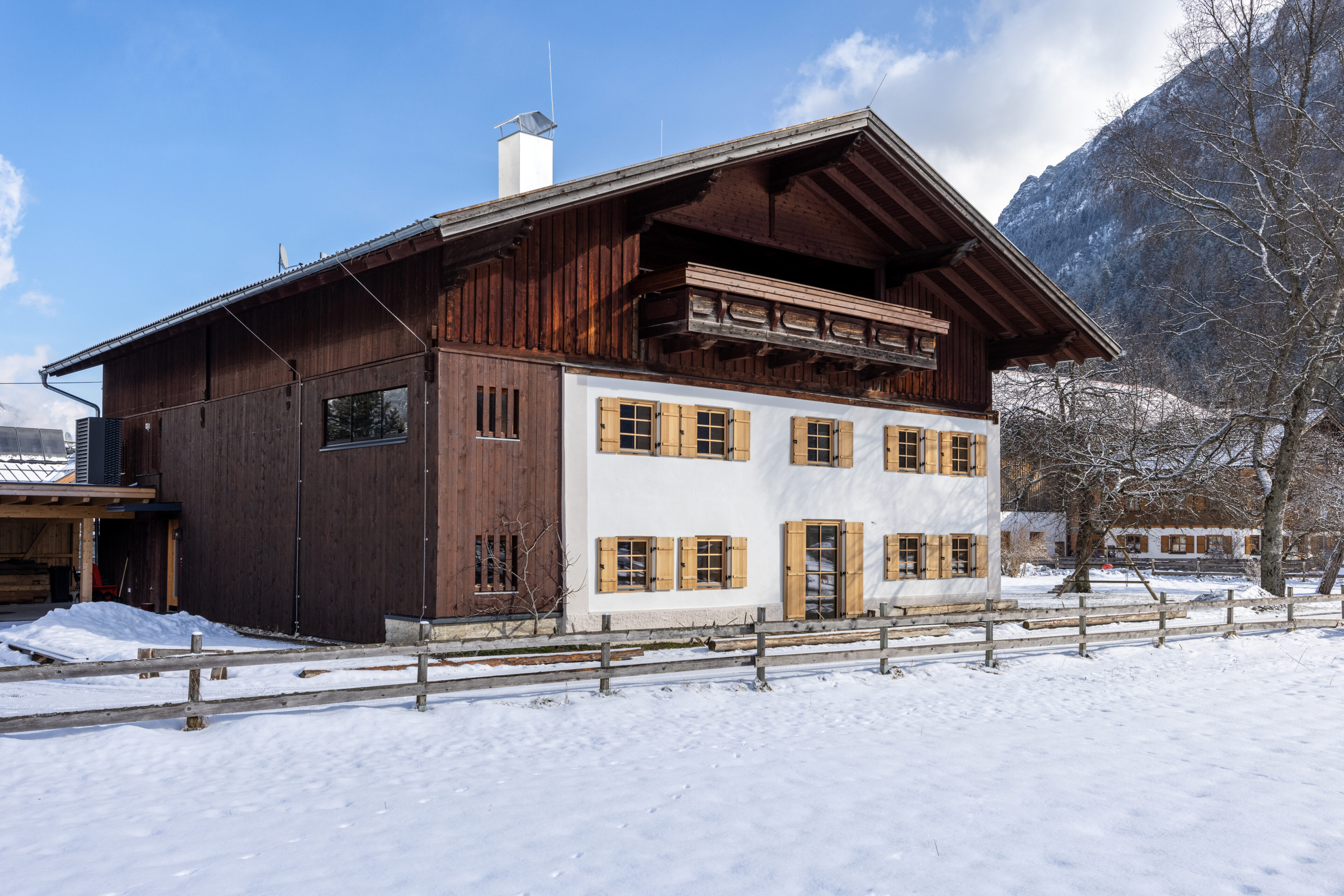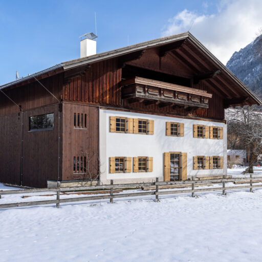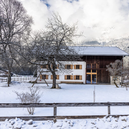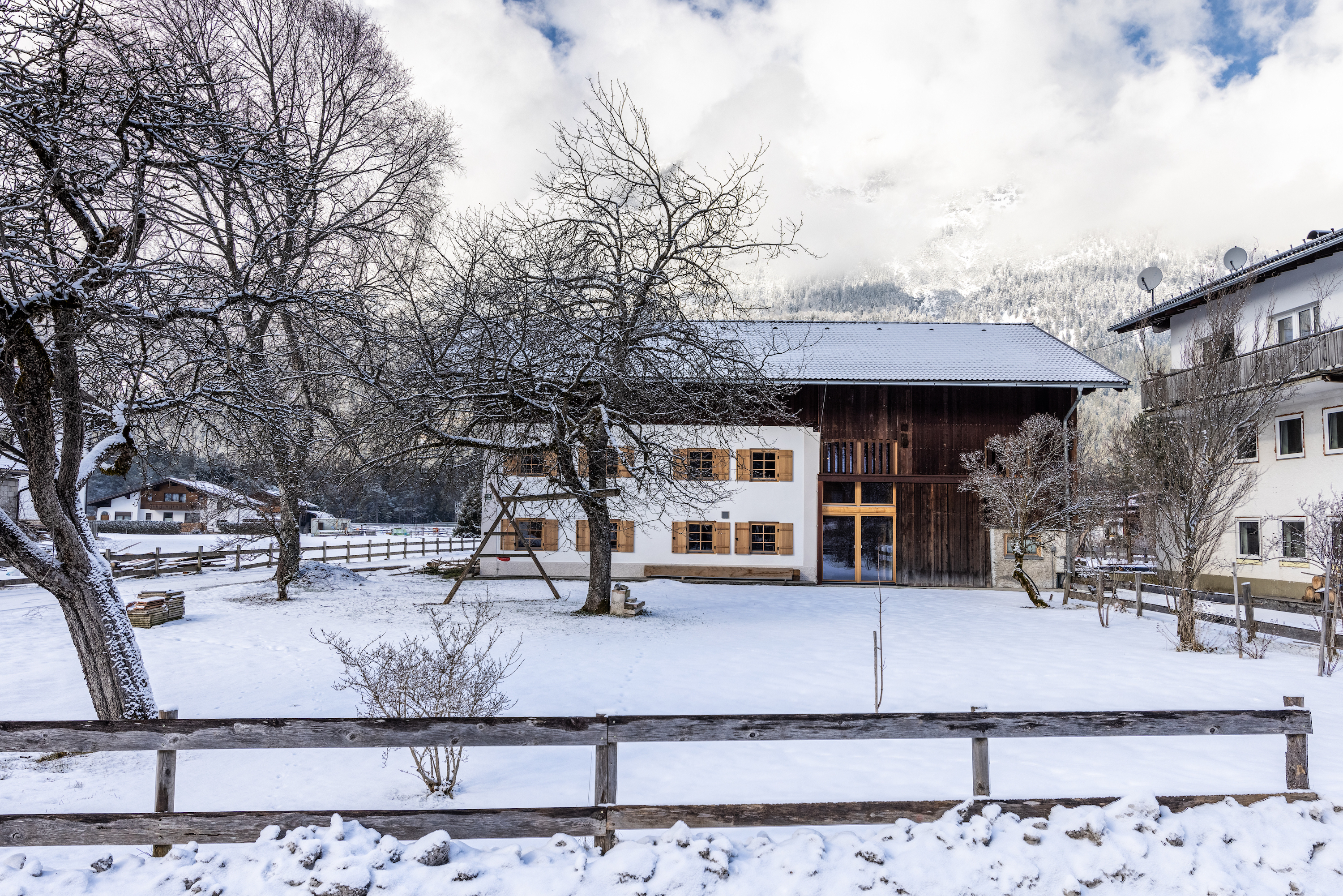 The place where hay was once stored and cows were still milked by hand has now become somewhere to simply relax, put your feet up, and enjoy yourselves. This 250-year-old farmhouse with the old farm name Greates was reinvented in 2022. A great deal of craftsmanship and love for purist design has transformed it into an alpine chalet with two vacation apartments, successfully marrying traditional Tyrolean construction with contemporary architecture. However, it was a complex process to achieve the feeling of comfort and warmth this accommodation exudes today, involving the removal of surface layers and the exposure of the original load-bearing components. Instead of completely renovating everything, old wood was refurbished and combined with new paneling—an approach that not only looks great, but also highlights the eventful history of the house. The former barn on the first floor has been converted into an apartment for eight people. Large windows let in plenty of daylight and are also ideal for admiring the Austrian Alps. Above it is a vacation apartment for four guests, featuring solid beams and exposed stone walls. Just as beautiful as the accommodation’s interior is its location in the small Alpine village of Forchach, surrounded by the Tyrolean Lech Nature Park, one of the last wild river landscapes in the Northern Alps. Spring-fed lakes and imposing mountain ranges are just waiting to be discovered. For little nature adventures, however, you only need to step into the old farm garden, run barefoot through the grass, pick apples, rustle through the autumn leaves, or build snowmen. A vacation on this historic farm will bring back warm childhood memories.