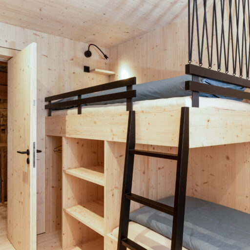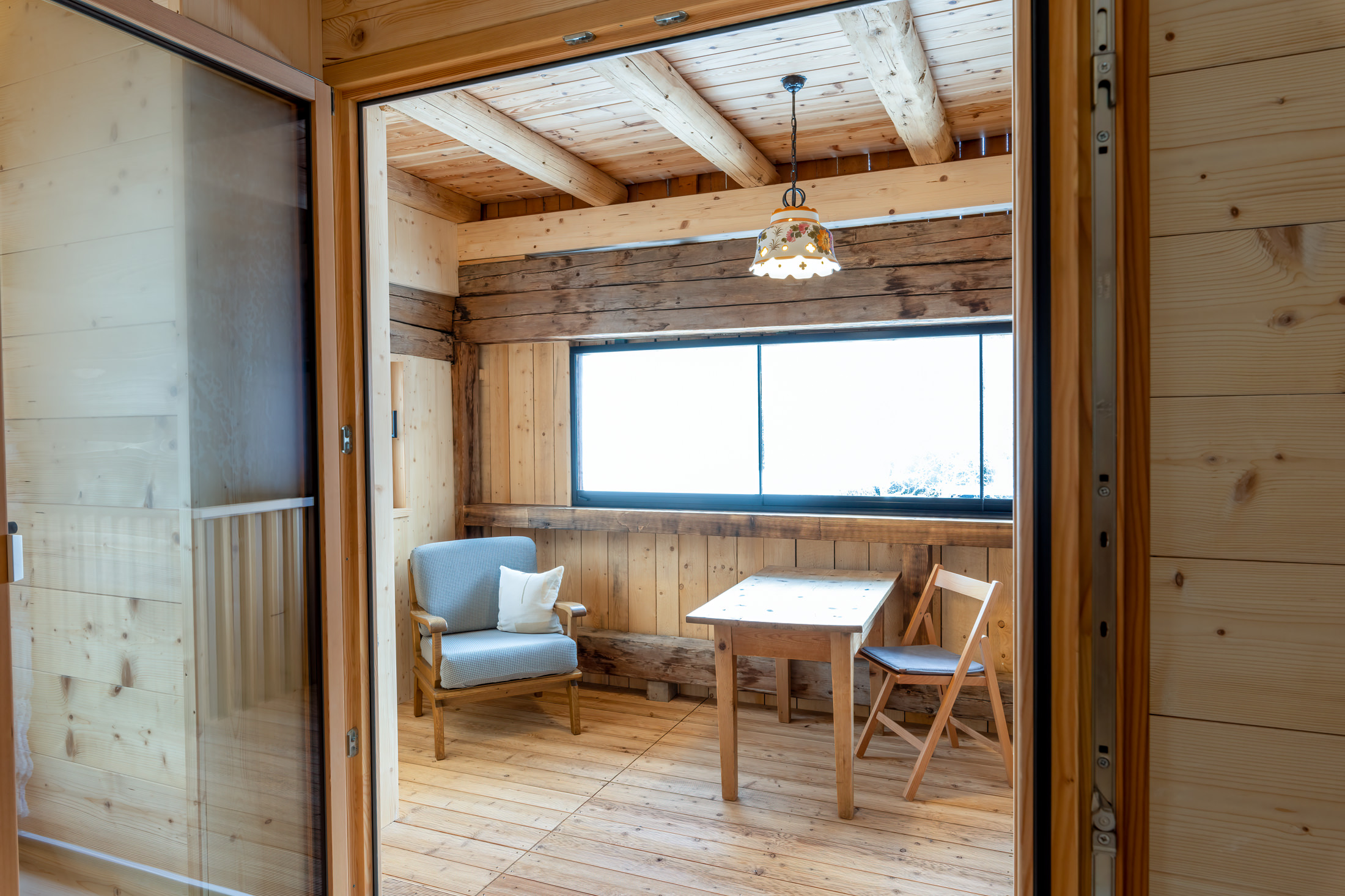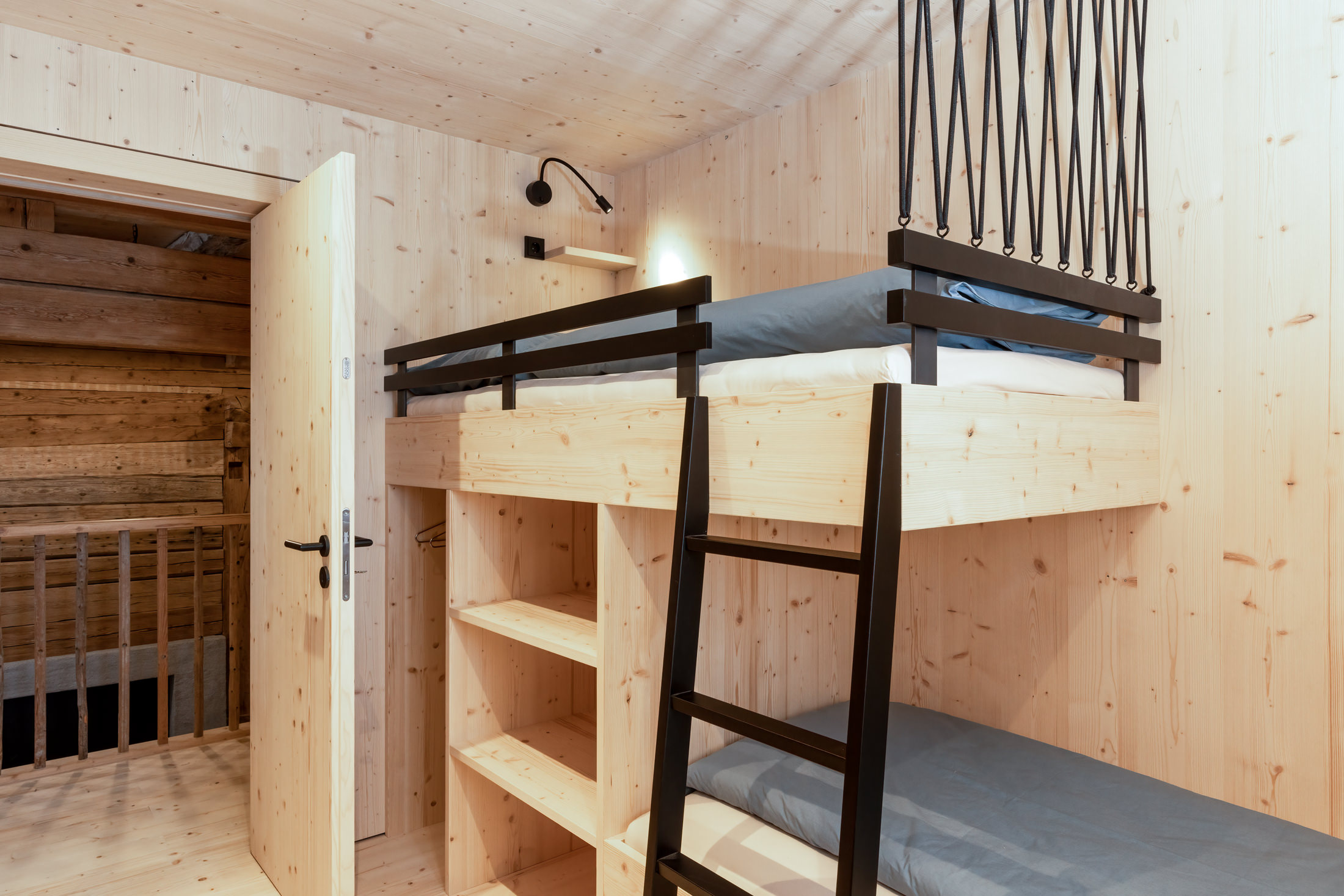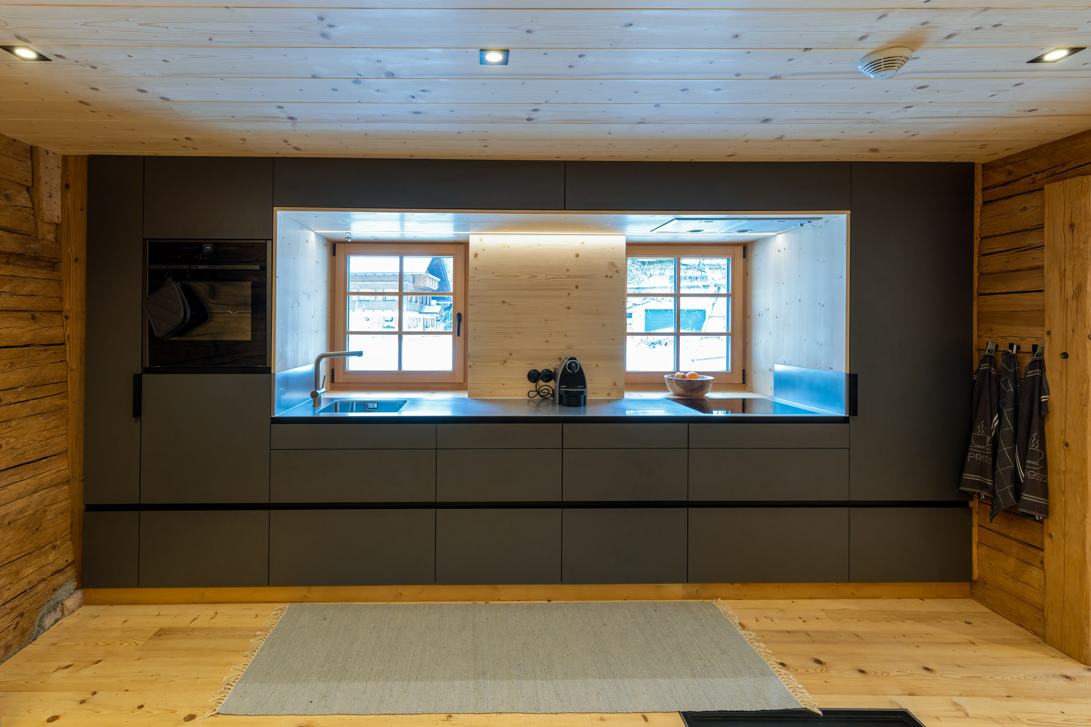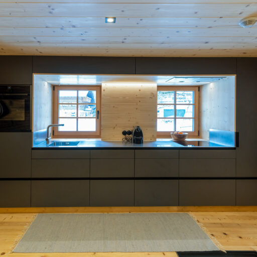 - The smaller loggia apartment on the upper floor is suitable for four people. The centerpiece is the built-in kitchen in the hallway, which includes a serving hatch to the living room with dining area. There’s also a sweeping view of the Alps to top it off!