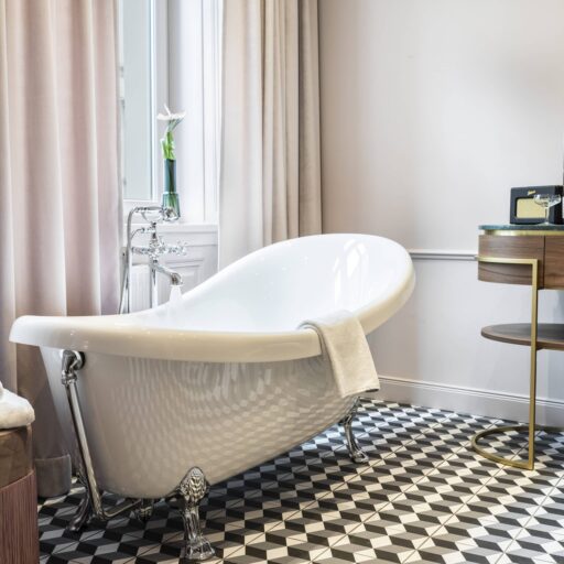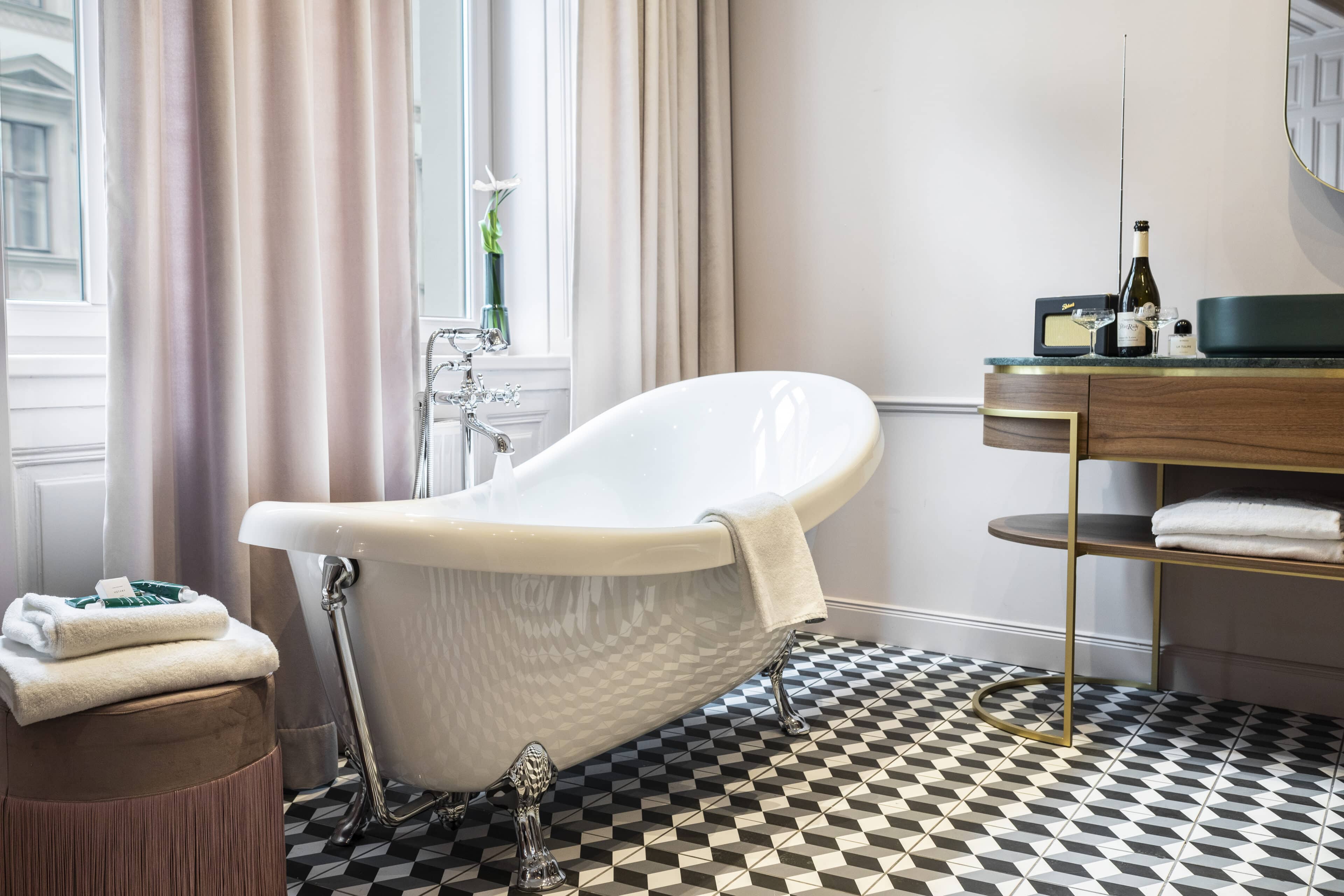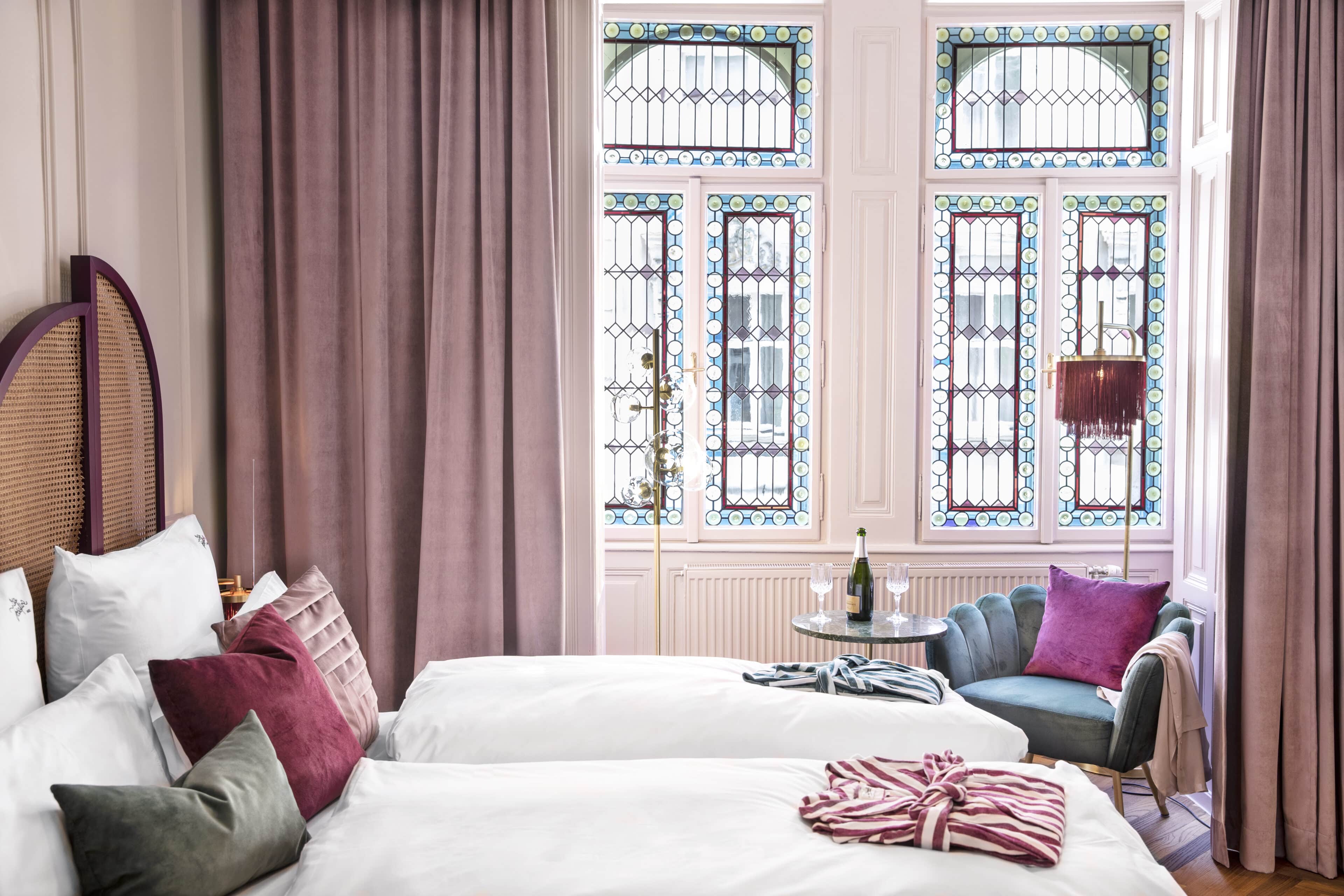 - Josefine Historique and the Bel Étage—two very special rooms where you can admire beautiful stained glass windows. In the latter, old stucco and a free-standing bathtub with lion paws provide exceptional retro flair.