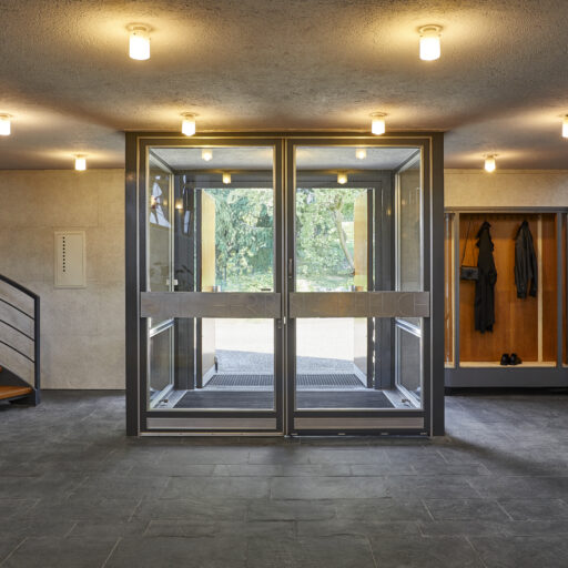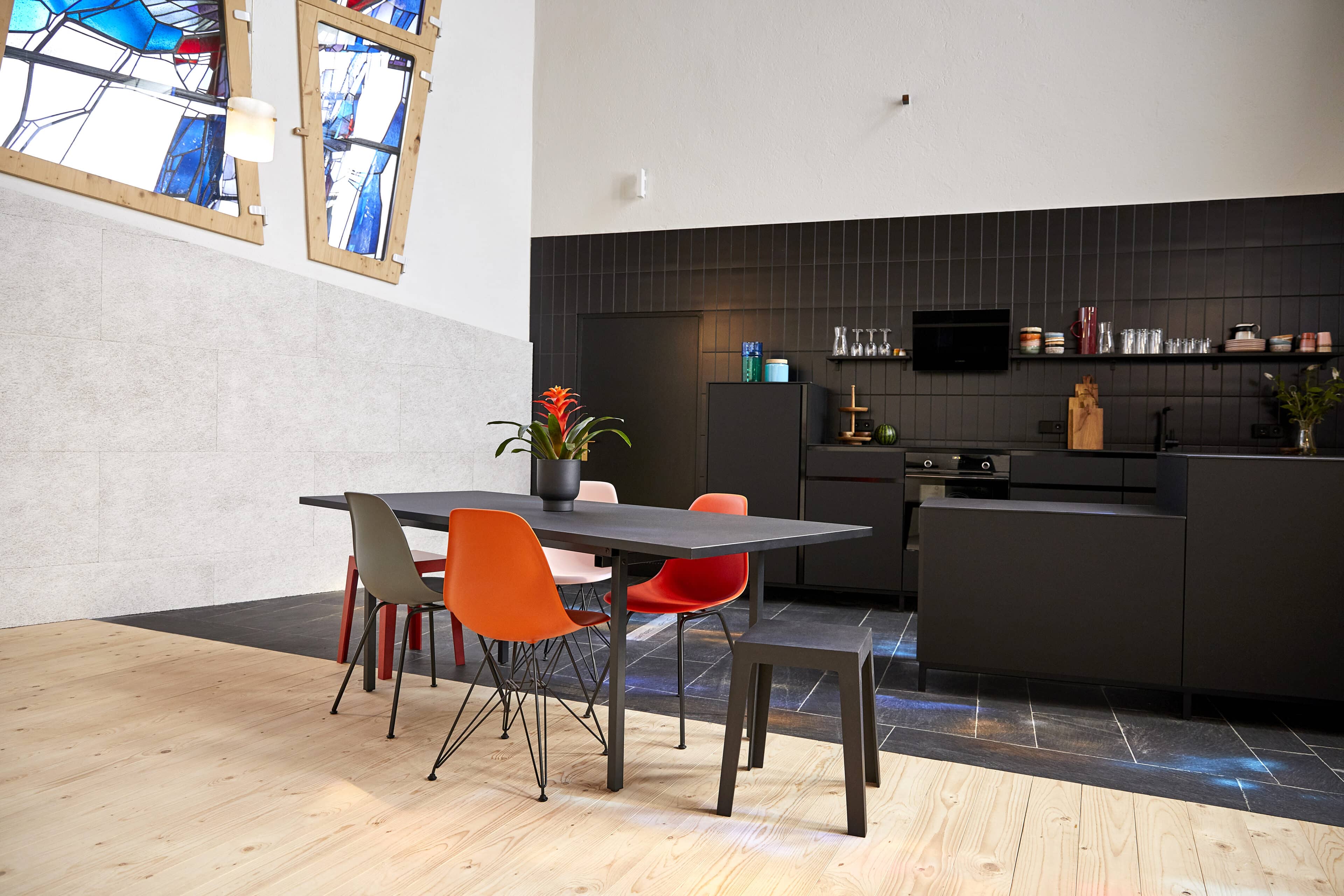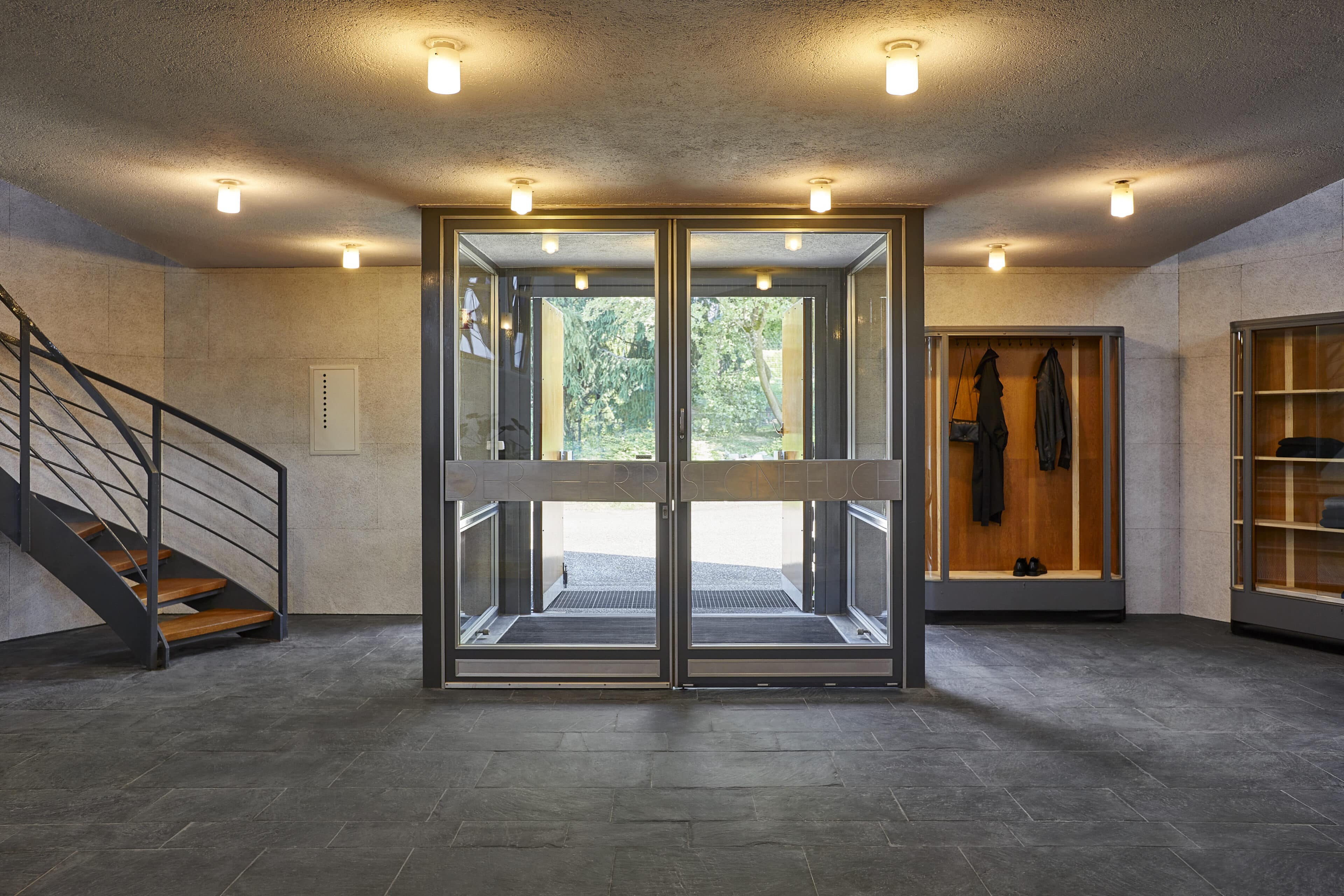 - Church elements have been deliberately preserved, such as the podium, the double-winged aluminum entrance door with the inscription “Der Herr segne euch” (The Lord bless you), and the slate floor in the kitchen. The furniture strikes a balance between old and new. Modern designer pieces are combined with 1960s shop fittings from a handicraft store in Meschede.