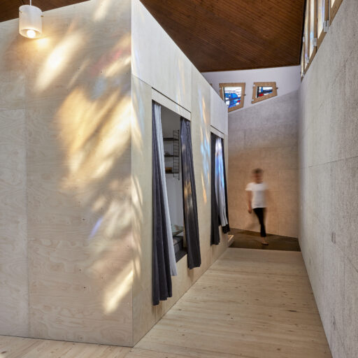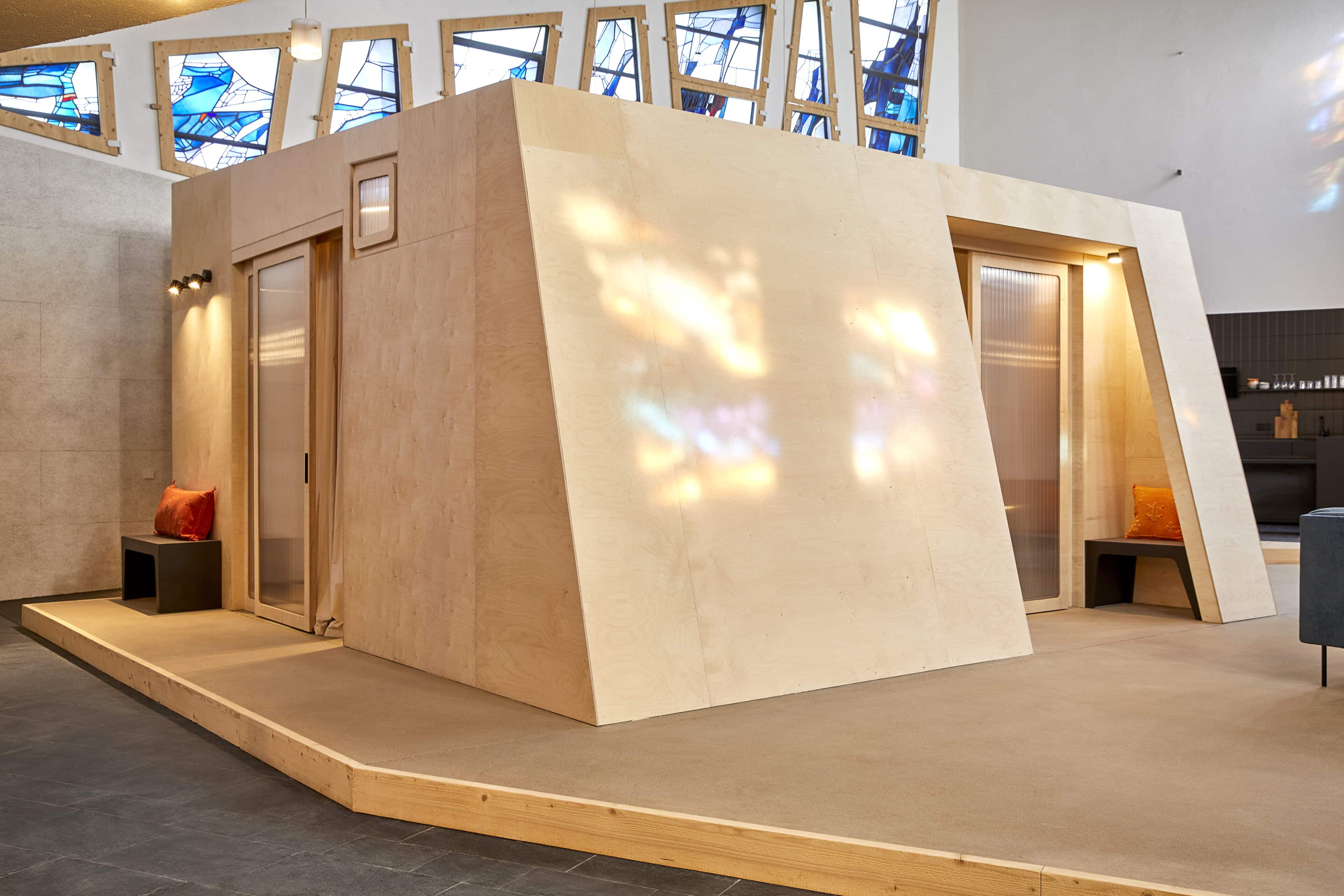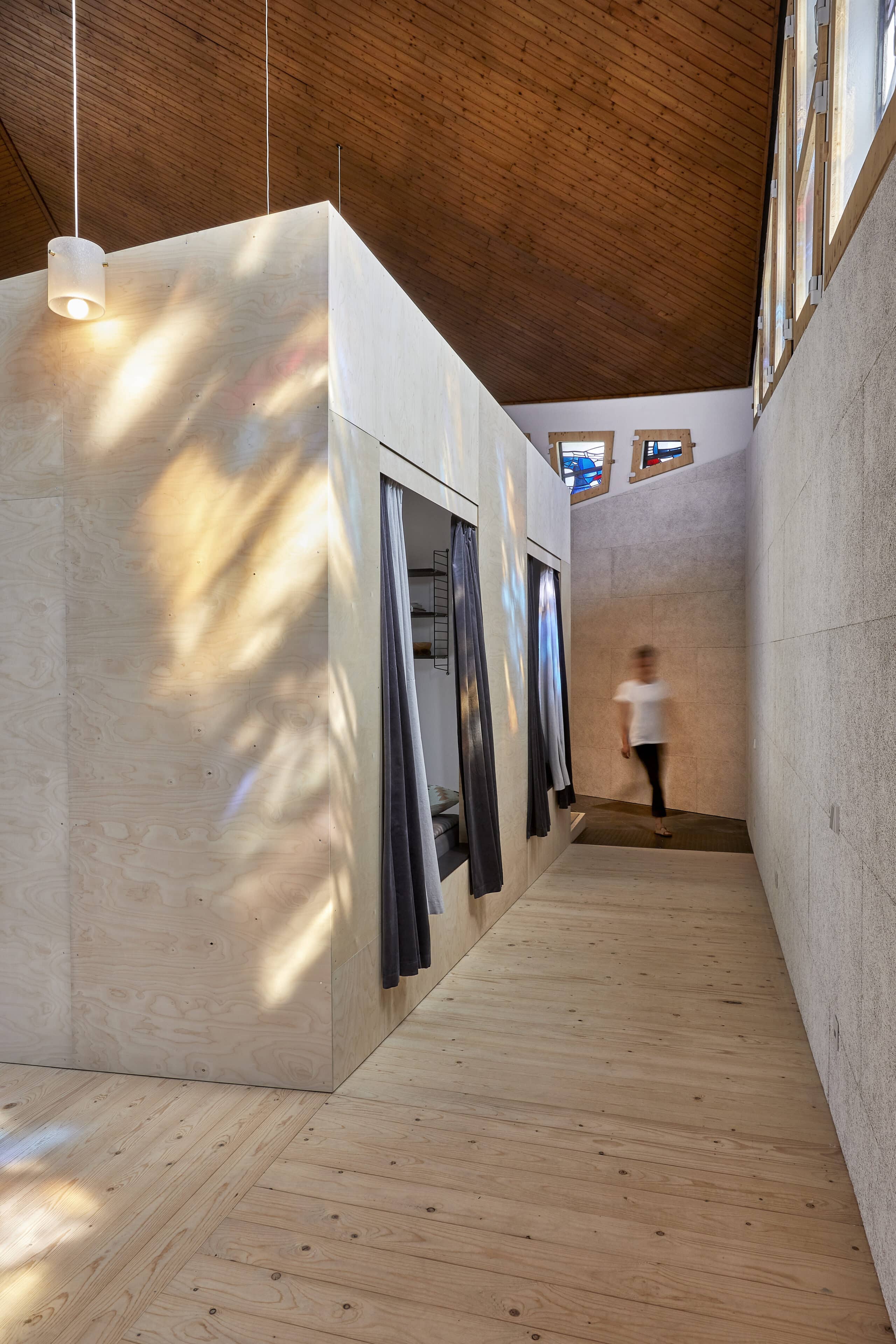 If you're longing for a truly heavenly break, you should head for the Sauerland region. North of Meschede, surrounded by two nature parks and not far from Lake Hennesee, lies this unusual vacation rental: a building with a trapezoidal floor plan and a striking tower, built in 1964 as the Protestant Church of St. John – now known as “Johannes Neun.” The fact that this listed building now houses a loft-style vacation home is thanks to architect Sandra Glados and civil engineer Reimund Köster. When the church was put up for sale, the two thought, “Let's just take a look,” but it didn't stop there. After becoming the new owners in 2020, they began to make plans and converted the building into a temporary home. In order to preserve its authentic character and not change the floor plan, they integrated a large wooden sleeping cube into the church interior (like a house within a house). With its two bedrooms and two bunks, it now offers space for up to six people and creates a cozy retreat within the open-plan concept. A steel spiral staircase leads to the former organ loft, a wonderful spot for reading, listening to music, or being inspired by the unique atmosphere in the deluxe workspace. What gives this vacation home its special atmosphere are the asymmetrical stained glass windows in various colors, whose light is reflected on the walls, floors, and furniture and is constantly changing. Watch this play of light and let the silence sink and you’ll forget everything around you. What could be better than that?