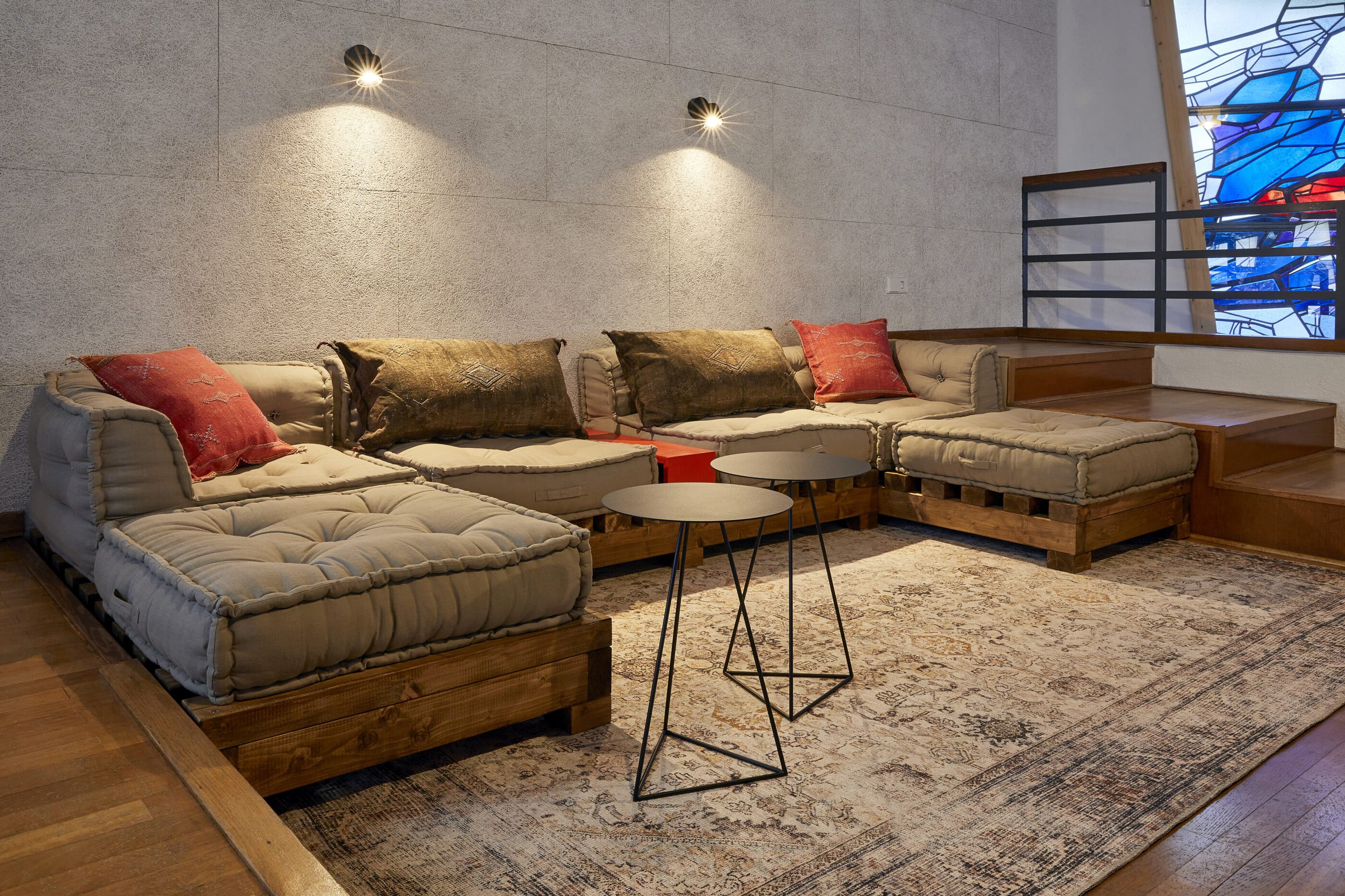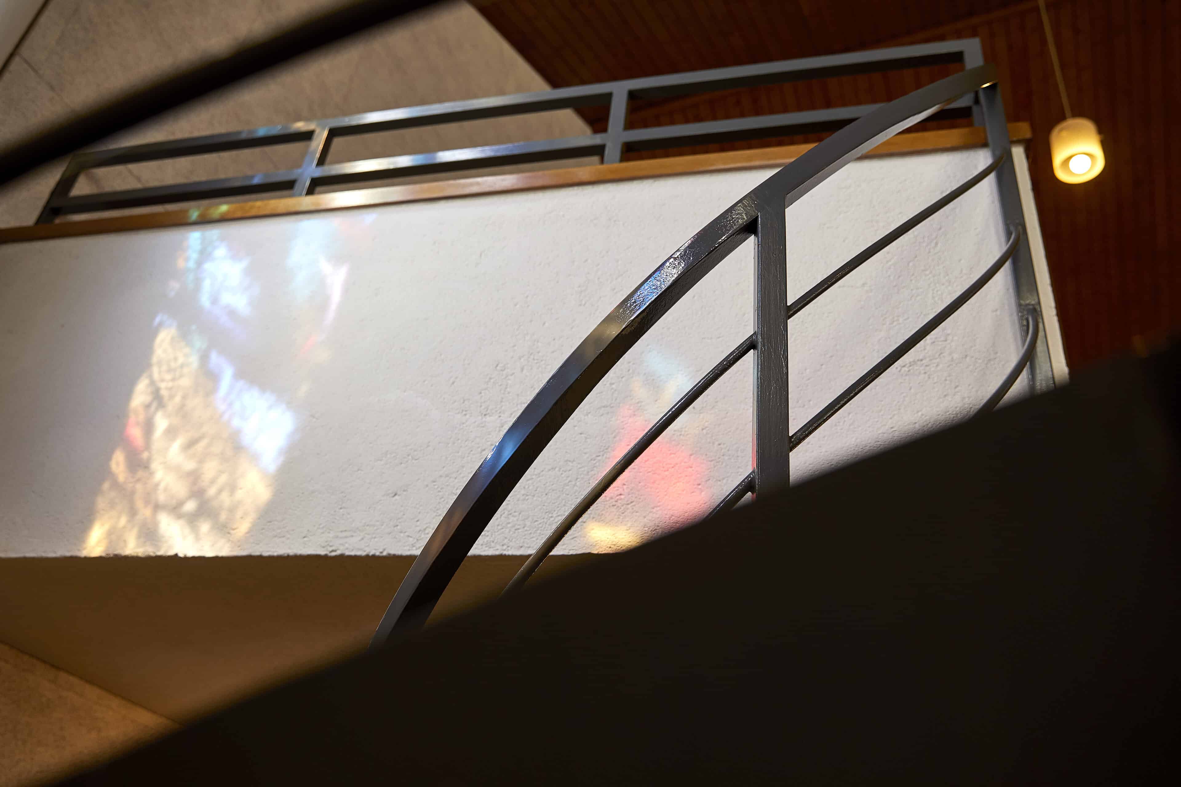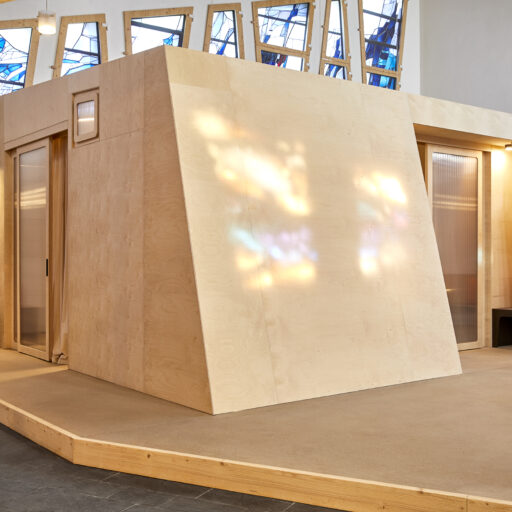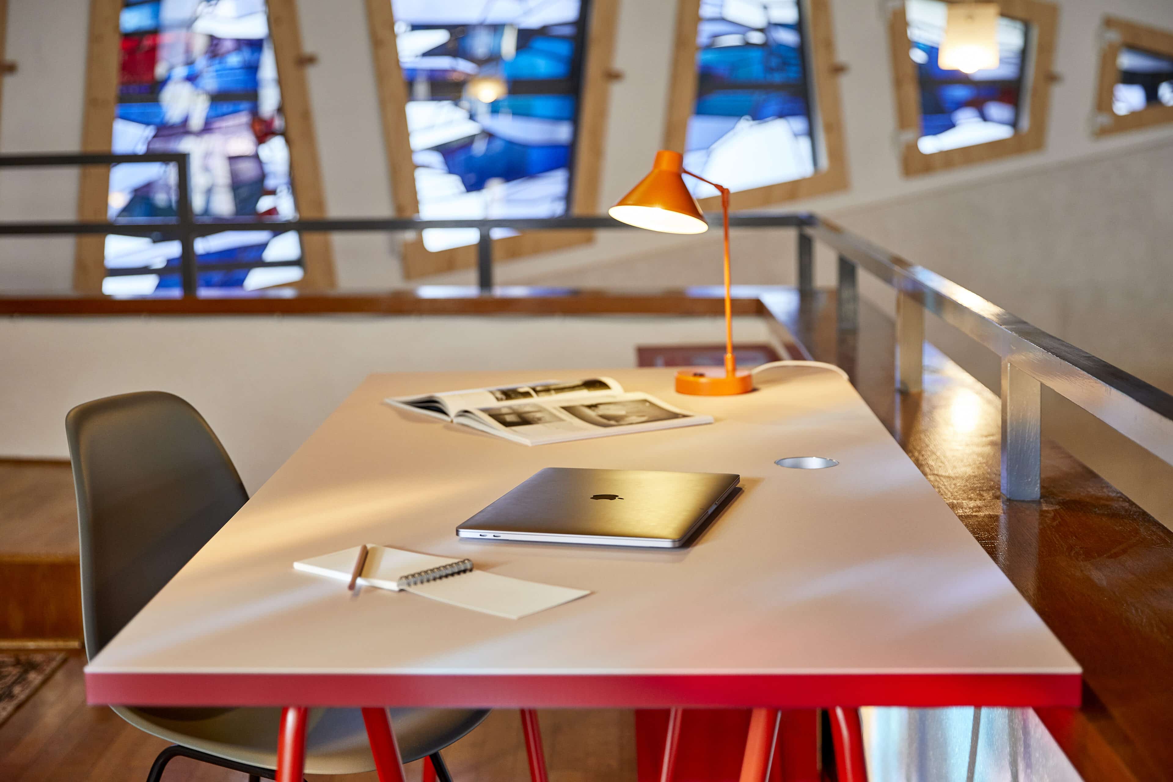 If you're longing for a truly heavenly break, you should head for the Sauerland region. North of Meschede, surrounded by two nature parks and not far from Lake Hennesee, lies this unusual vacation rental: a building with a trapezoidal floor plan and a striking tower, built in 1964 as the Protestant Church of St. John – now known as “Johannes Neun.” The fact that this listed building now houses a loft-style vacation home is thanks to architect Sandra Glados and civil engineer Reimund Köster. When the church was put up for sale, the two thought, “Let's just take a look,” but it didn't stop there. After becoming the new owners in 2020, they began to make plans and converted the building into a temporary home. In order to preserve its authentic character and not change the floor plan, they integrated a large wooden sleeping cube into the church interior (like a house within a house). With its two bedrooms and two bunks, it now offers space for up to six people and creates a cozy retreat within the open-plan concept. A steel spiral staircase leads to the former organ loft, a wonderful spot for reading, listening to music, or being inspired by the unique atmosphere in the deluxe workspace. What gives this vacation home its special atmosphere are the asymmetrical stained glass windows in various colors, whose light is reflected on the walls, floors, and furniture and is constantly changing. Watch this play of light and let the silence sink and you’ll forget everything around you. What could be better than that?