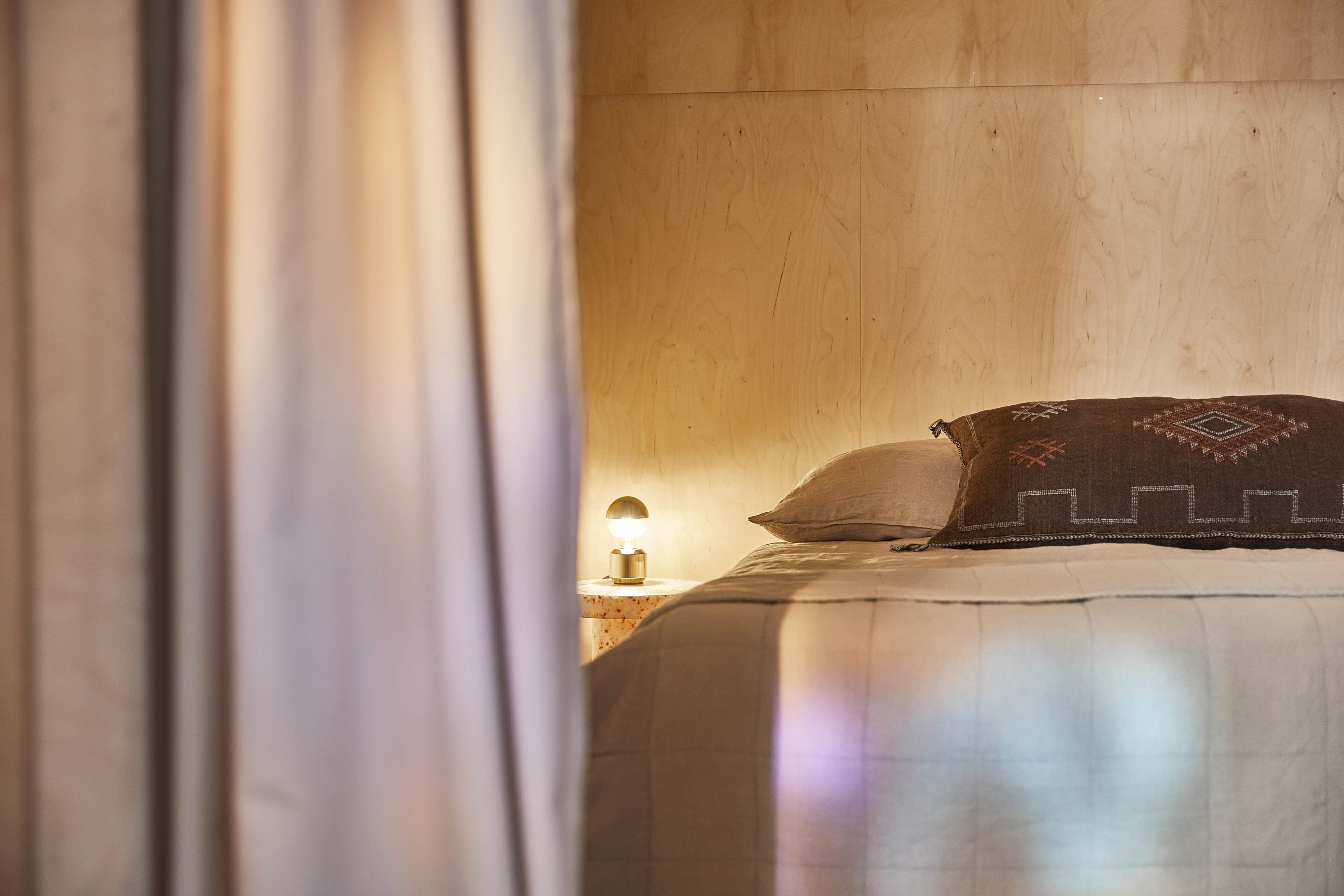 - The integrated sleeping cube has two bedrooms with double beds and two bunks. They are separated from the living area by curtains.