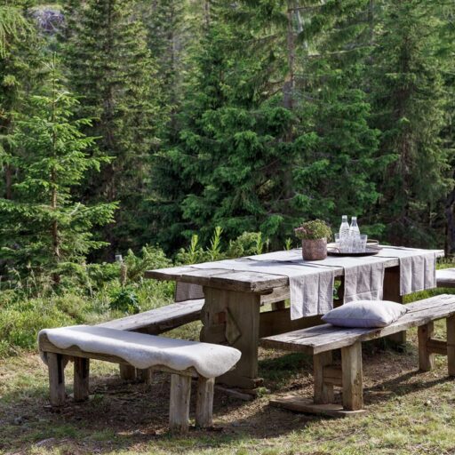 - The wooden table plus four benches in the garden looking out to a fairytale landscape of fir trees and mountain summits