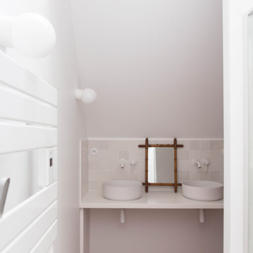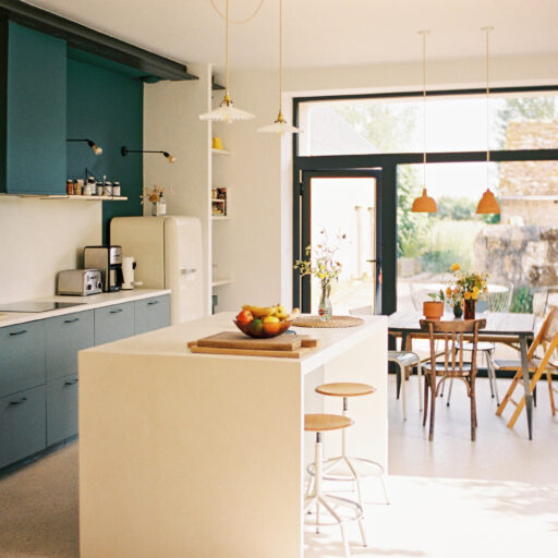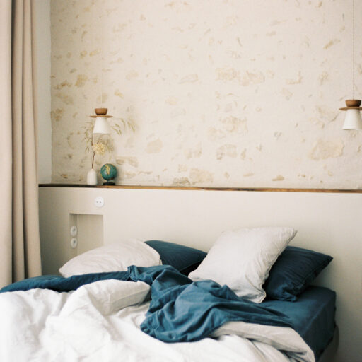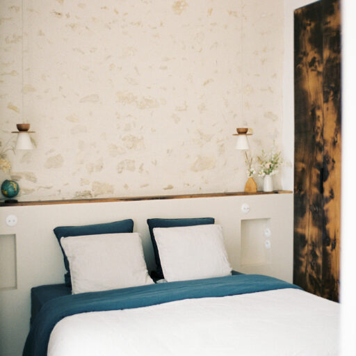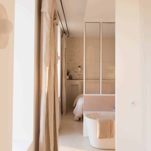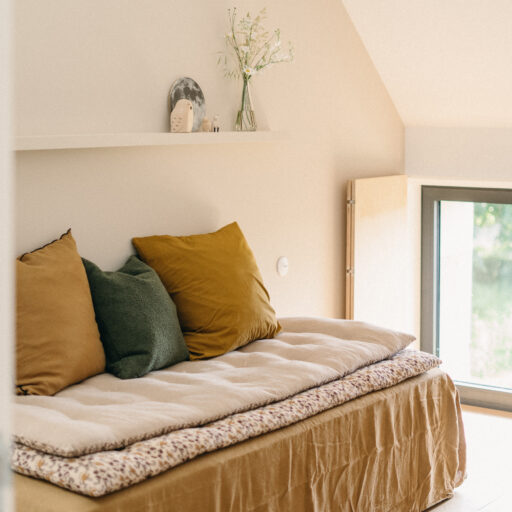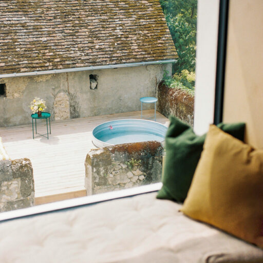 If we were to dream up a perfect vacation day, it might look something like this: We step out onto the terrace, still a little sleepy. While we enjoy vanilla French toast and kiwi mint salad with fragrant coffee in the morning sun, we look out over flowering meadows and wide open fields. We then spend the following hours reading a captivating novel under old mimosa trees, taking long walks, cycling through the surrounding villages, stopping off at a fish restaurant on the Loire, tasting local wines at a winery before returning in the early evening to where it all began that morning. Where is that? Well, in this former farmhouse, where you simply can’t help but feel at home. In the spacious garden, just behind the walnut tree, there’s still time for a game of pétanque. And regardless of whether it’s successful or not, it must be rewarded in any case with a trip to the “Country Spa”—a kind of XL hot tub with water heated by a wood fire. From there, we look up at the stars at a late hour (would you like a glass of wine?) before snuggling up tired and blissful under centuries-old beams. Sounds good? It is. In the French commune of Channay-sur-Lathan in the Centre-Val de Loire, less than three hours from Paris and surrounded by unspoiled nature, we came across this accommodation where you can spend your leisure time without a care in the world. “Take time to do nothing” is the motto of the owners Pauline and Paul, who have created a little paradise in the country house with a converted barn that used to house goats and horses. And they invite their guests to share it with them. Absolutely dreamy!