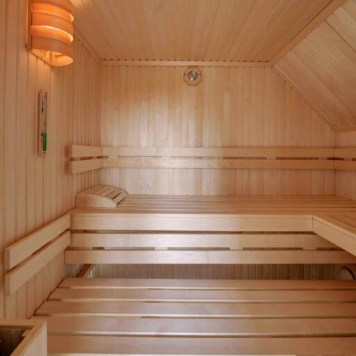 • Spa lovers won’t be disappointed, either – they’ll enjoy the sauna on the upper floor, which is made of custom-carpentered aspen wood.