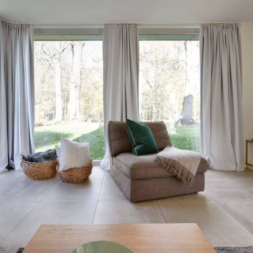 • The living room with its corner fireplace allows you to forget the hustle and bustle of the world: you let your view wander to the old trees from the panoramic window and allow yourself to soak up the cosy Lillesol atmosphere.