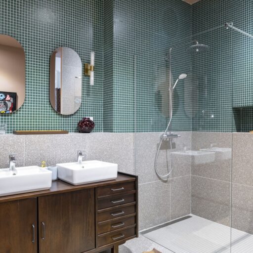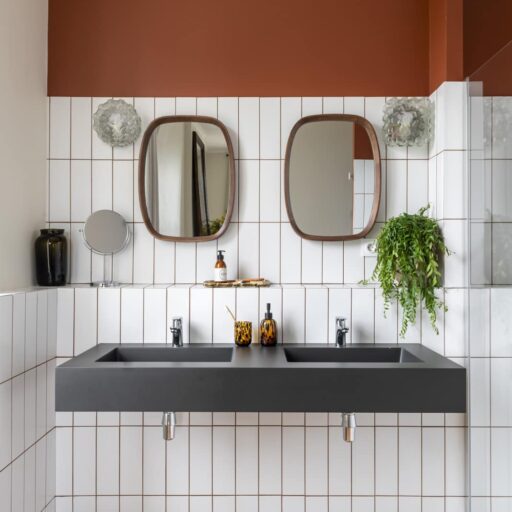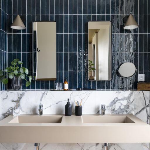 - The tasteful and creative wall design, which is different in every room: High-quality tiles in petrol or glossy black, individual areas in intense, dark shades or a wall that resembles a huge watercolor painting.