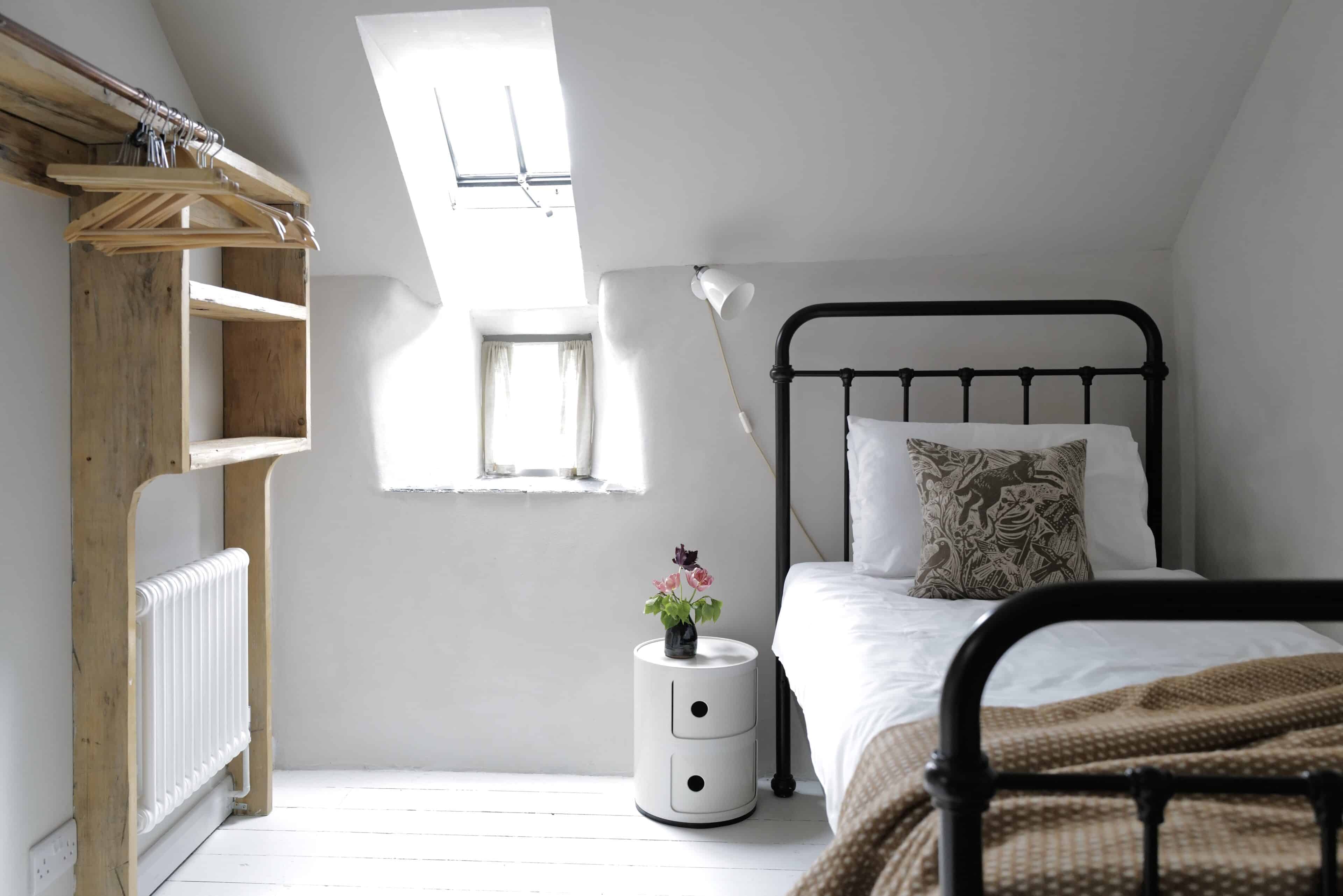 - The emphasis here is on recycling. An old door found in the garden was turned into a headboard for the bed, scaffolding boards were turned into built-in cupboards.