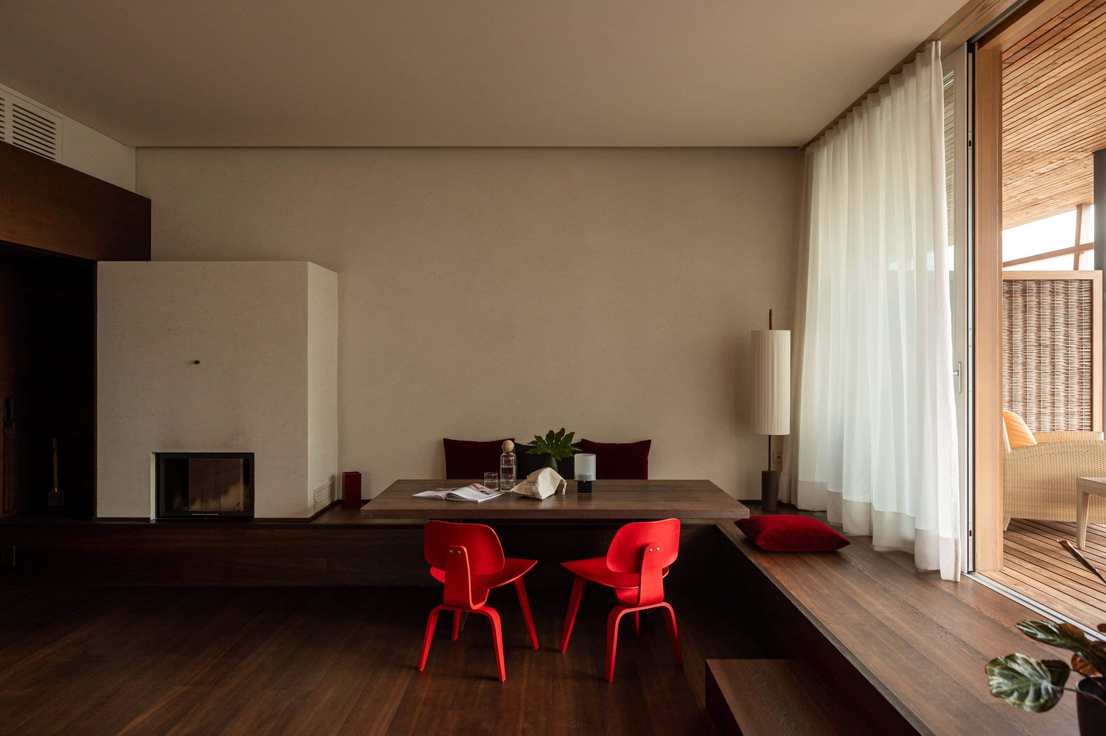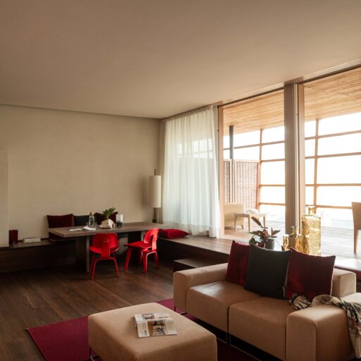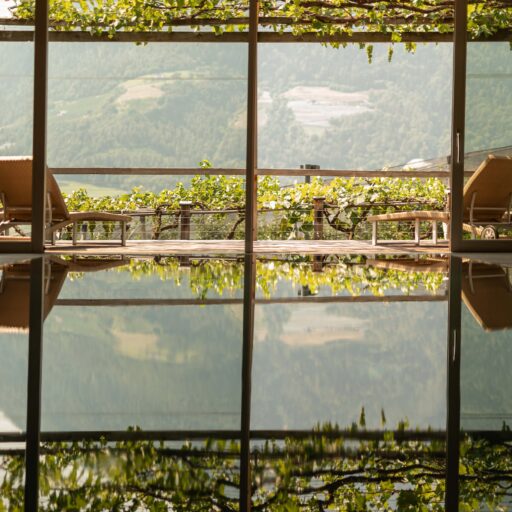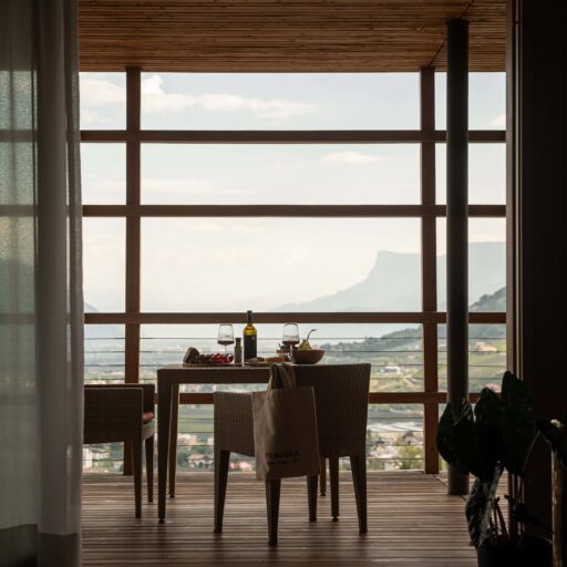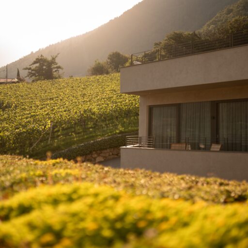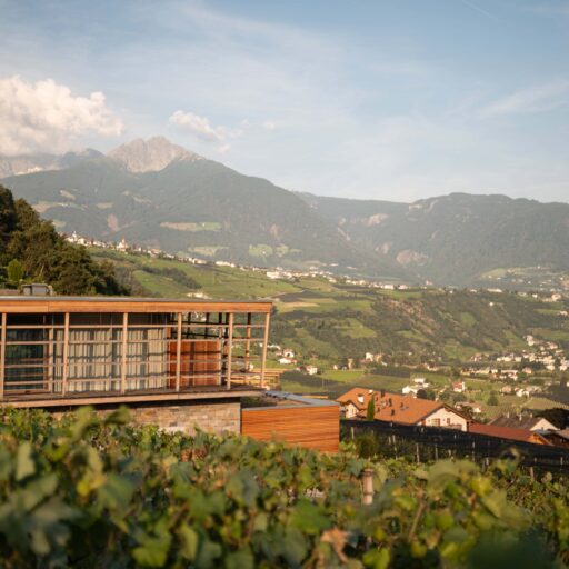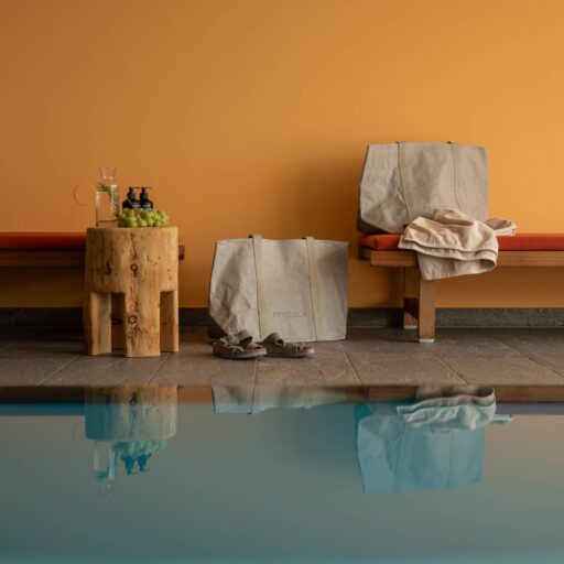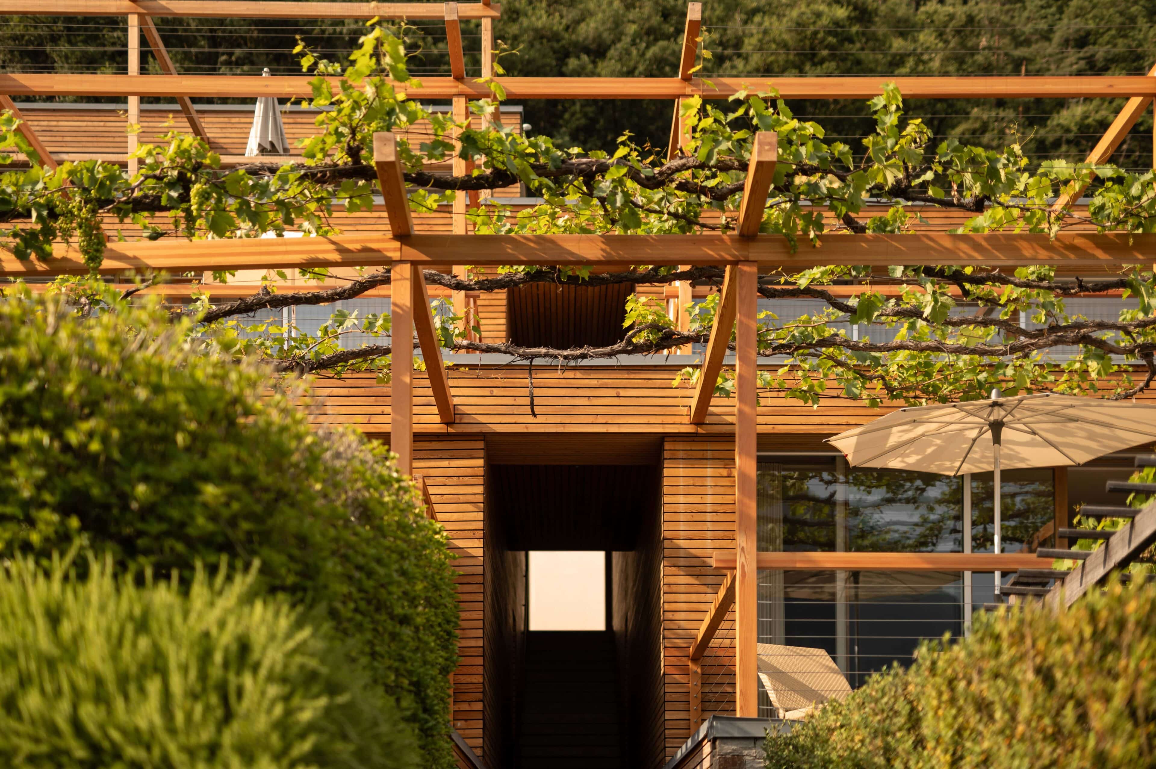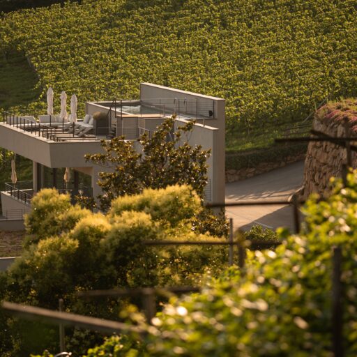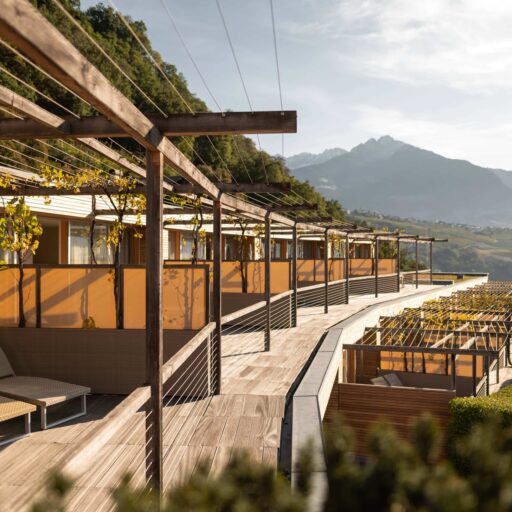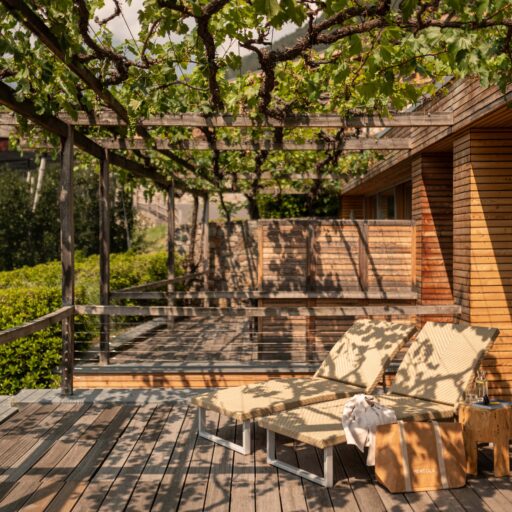 The twelve suites and two penthouses of the Pergola Residence are terraced along the hillside of Algund, as if they were part of the vineyards. Opened in 2004 by Ruth and Josef Innerhofer, this is a place to lie back and breathe easy, especially for guests who would rather follow their own rhythm while on vacation, and rather not have to dress up for breakfast in the morning. The apartments bear the signature of South Tyrol-born architect Matteo Thun. Thanks to his use of local materials and subtle proportions, his buildings seem to blend into the hilly landscape – an approach that the owners have maintained. Twenty years after the Pergola Residence opened, Josef’s daughter Karin Innerhofer began the next chapter of the property’s story: on the hillside above the apartment complex, she created Spazio 46. Its concrete construction has a young and modernist feel, but fits into the landscape just as well as the original structures. The new building has an emphasis on the wellness factor: an infinity pool on the roof, a panoramic sauna, and an open-air gym offer glorious views of the surrounding area. Architect and designer Hannes Peer, who also hails from the region, is the interior designer. In the luxury Loft 46 apartment for two, he combines local craftsmanship with cosmopolitan design standards. By combining elegant surfaces, vintage furniture in the style of the 1960s, like the sofa lounge around the freestanding fireplace, and custom-made elements, such as the intricately crafted wooden room divider, he draws on the craftsmanship of regional artisans and reinterprets it at the same time. As different as the architecture of the two buildings may be, what connects them is their sense of place. They are the ideal address for nature-loving connoisseurs who value their privacy.
