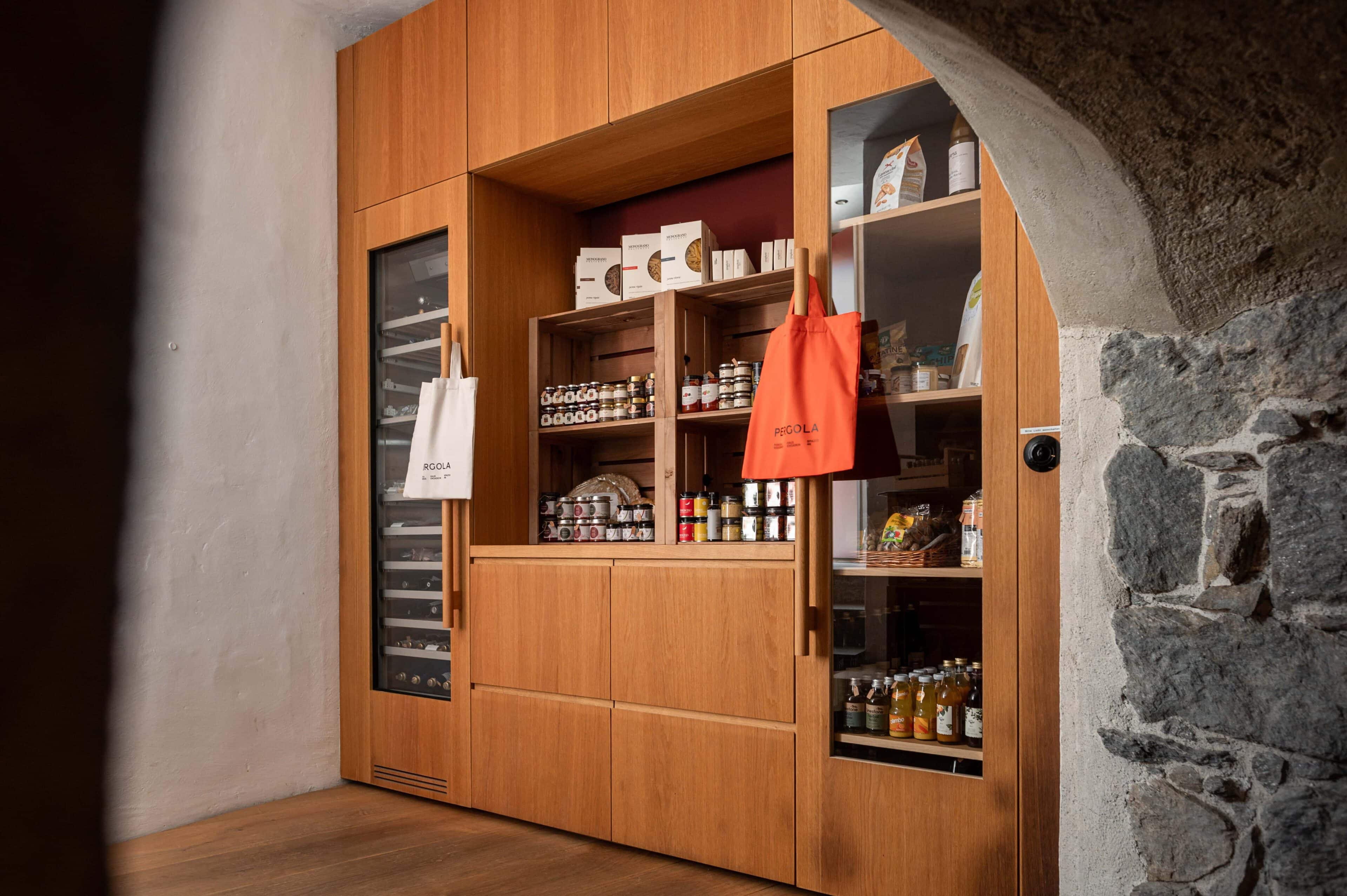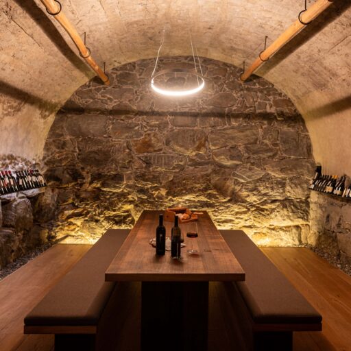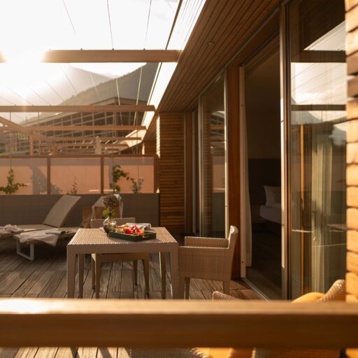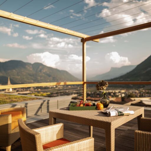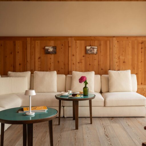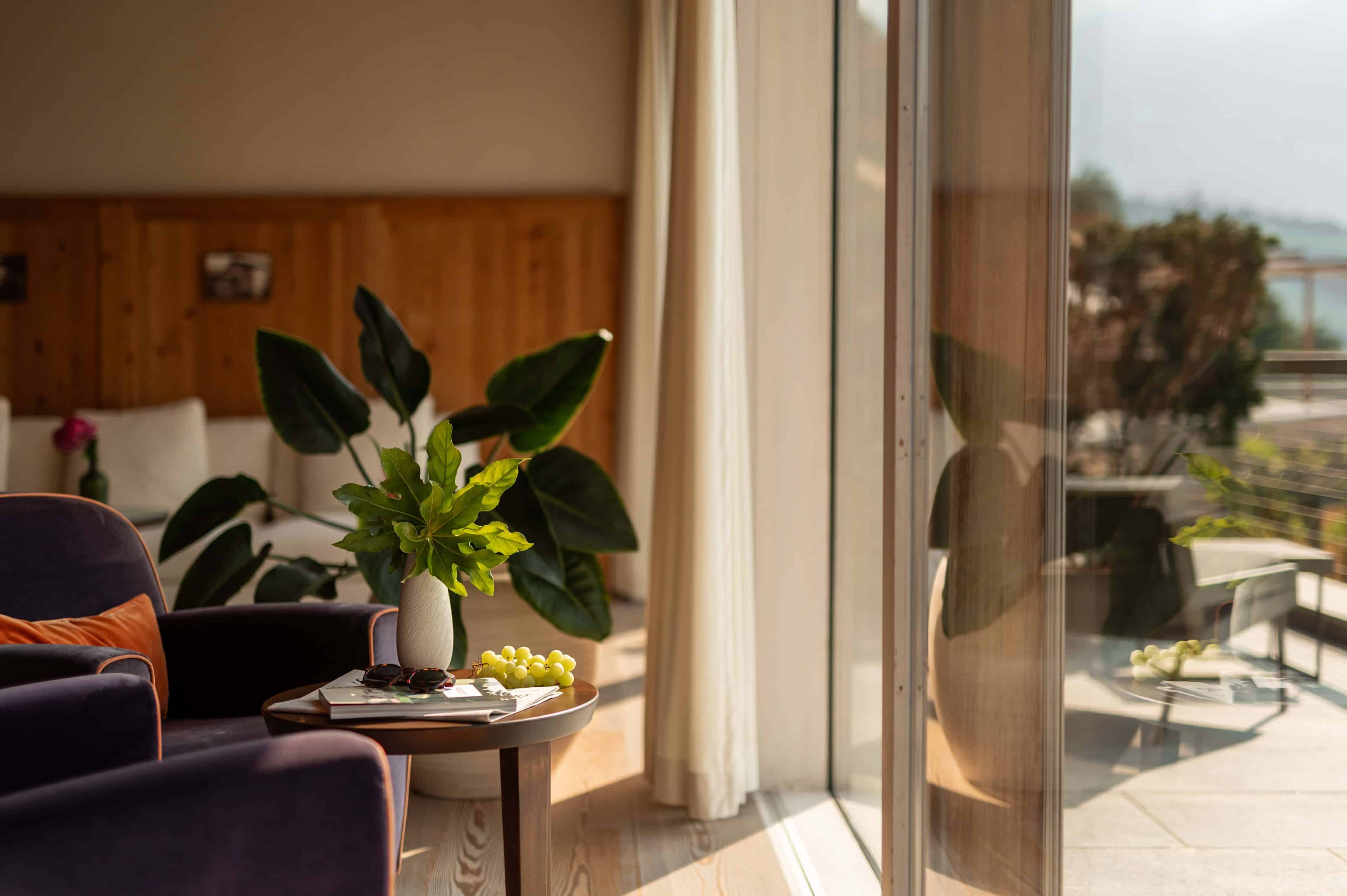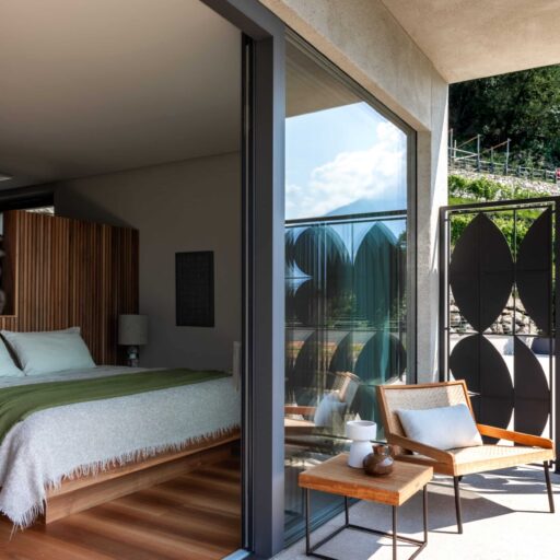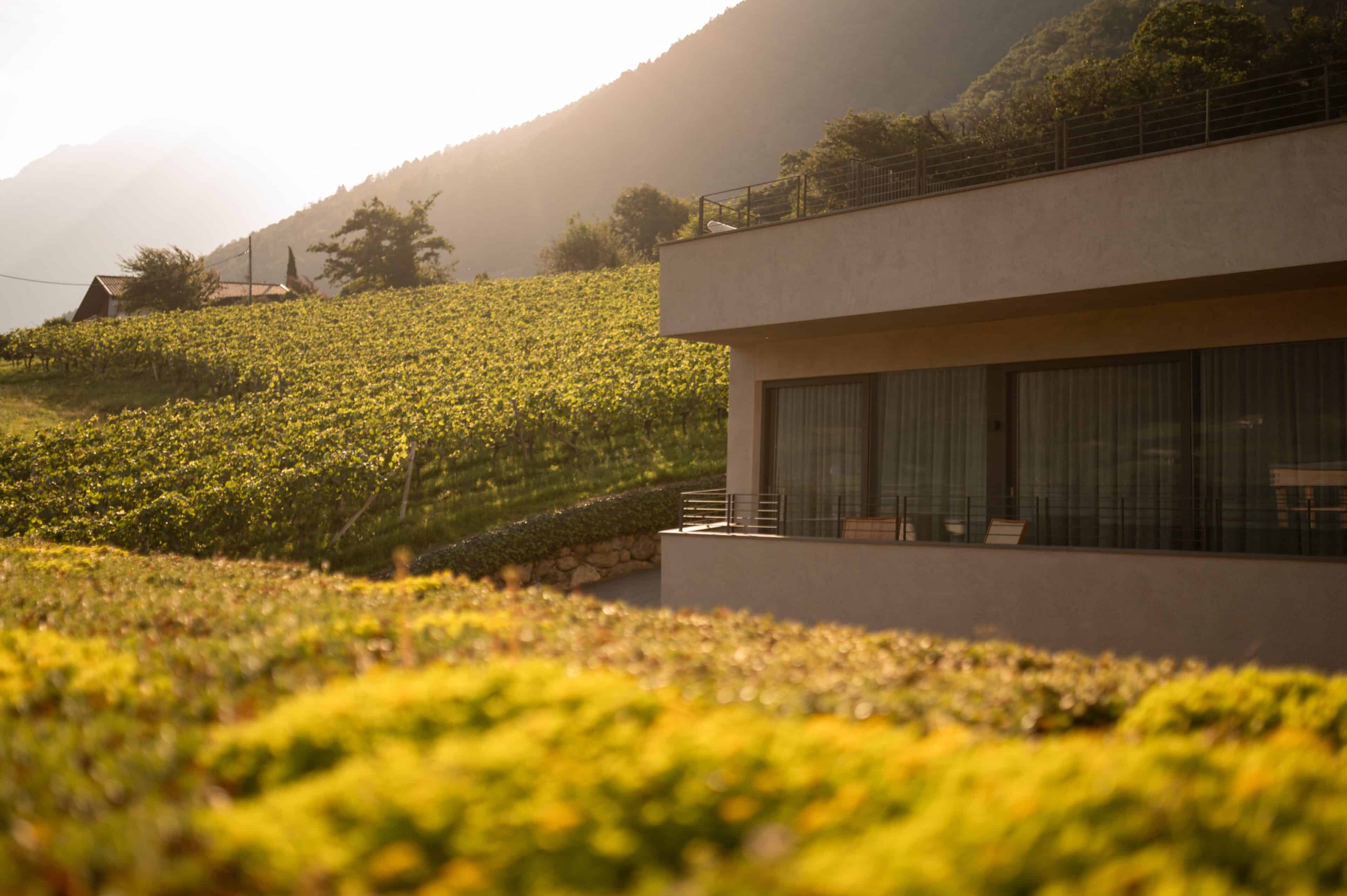 The twelve suites and two penthouses of the Pergola Residence are terraced along the hillside of Algund, as if they were part of the vineyards. Opened in 2004 by Ruth and Josef Innerhofer, this is a place to lie back and breathe easy, especially for guests who would rather follow their own rhythm while on vacation, and rather not have to dress up for breakfast in the morning. The apartments bear the signature of South Tyrol-born architect Matteo Thun. Thanks to his use of local materials and subtle proportions, his buildings seem to blend into the hilly landscape – an approach that the owners have maintained. Twenty years after the Pergola Residence opened, Josef’s daughter Karin Innerhofer began the next chapter of the property’s story: on the hillside above the apartment complex, she created Spazio 46. Its concrete construction has a young and modernist feel, but fits into the landscape just as well as the original structures. The new building has an emphasis on the wellness factor: an infinity pool on the roof, a panoramic sauna, and an open-air gym offer glorious views of the surrounding area. Architect and designer Hannes Peer, who also hails from the region, is the interior designer. In the luxury Loft 46 apartment for two, he combines local craftsmanship with cosmopolitan design standards. By combining elegant surfaces, vintage furniture in the style of the 1960s, like the sofa lounge around the freestanding fireplace, and custom-made elements, such as the intricately crafted wooden room divider, he draws on the craftsmanship of regional artisans and reinterprets it at the same time. As different as the architecture of the two buildings may be, what connects them is their sense of place. They are the ideal address for nature-loving connoisseurs who value their privacy.