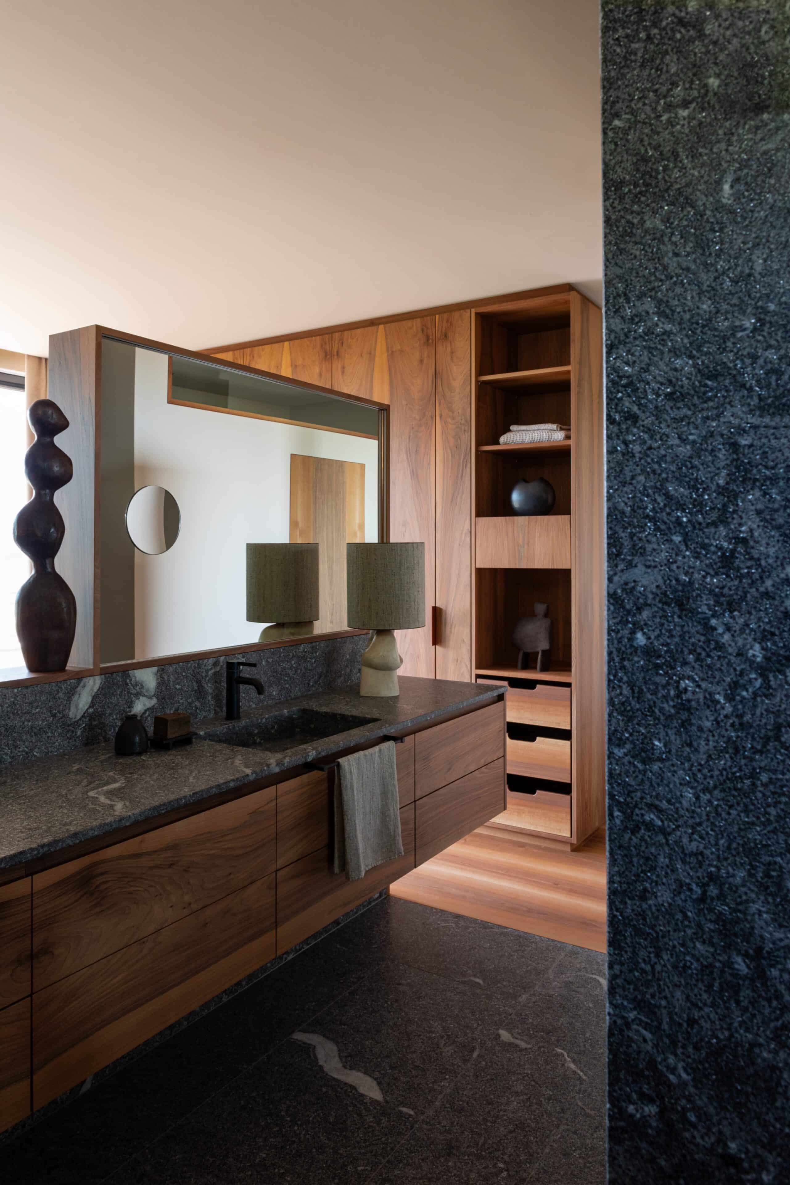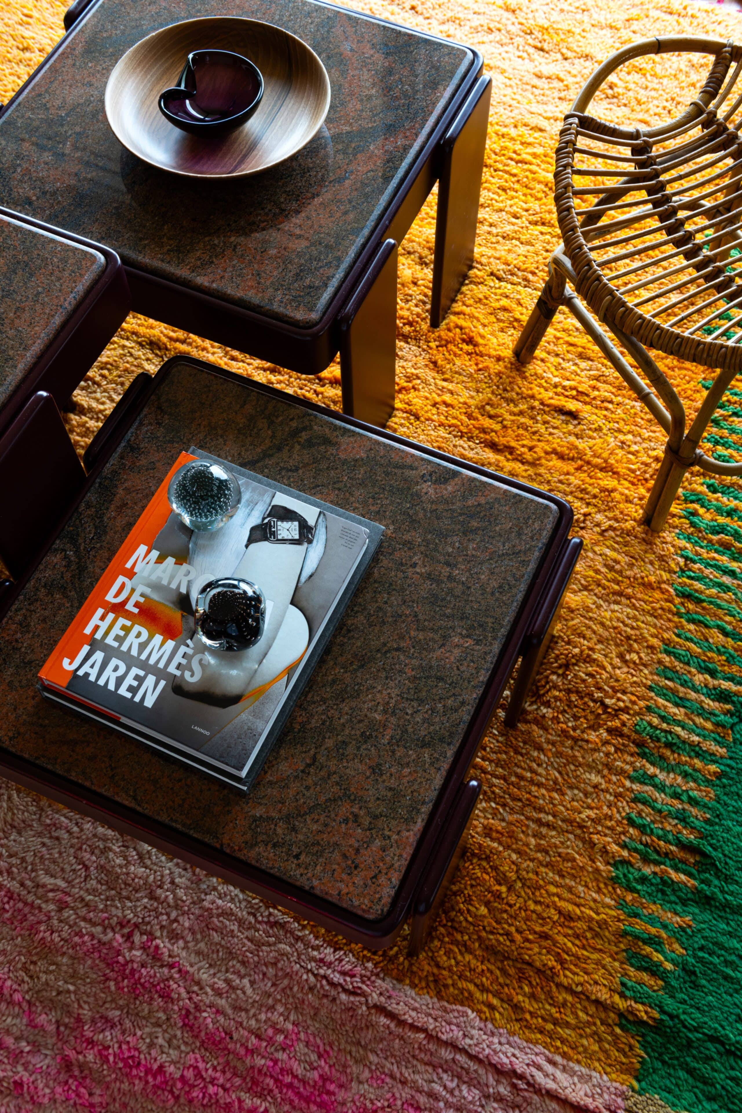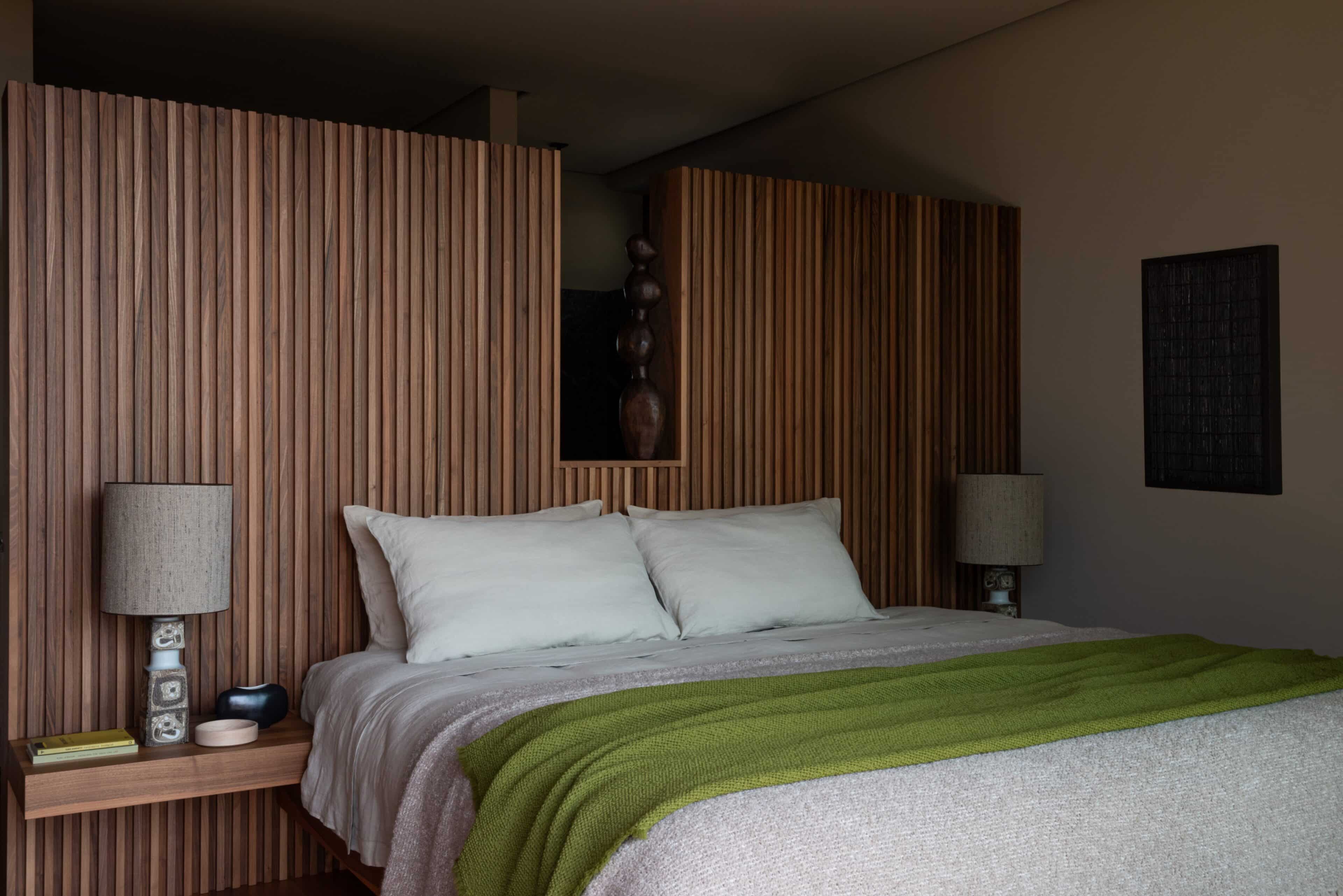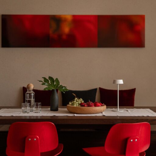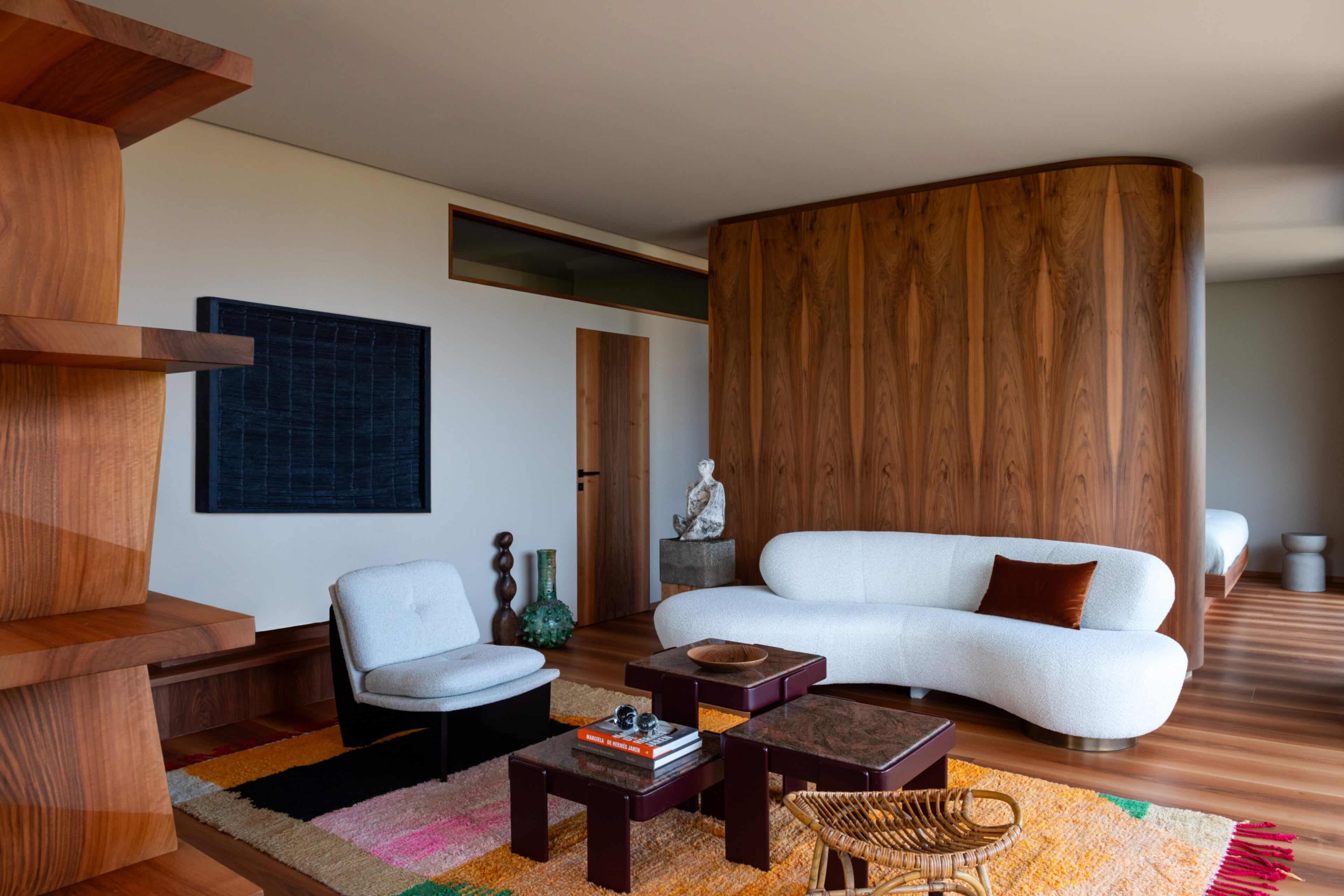 The twelve suites and two penthouses of the Pergola Residence are terraced along the hillside of Algund, as if they were part of the vineyards. Opened in 2004 by Ruth and Josef Innerhofer, this is a place to lie back and breathe easy, especially for guests who would rather follow their own rhythm while on vacation, and rather not have to dress up for breakfast in the morning. The apartments bear the signature of South Tyrol-born architect Matteo Thun. Thanks to his use of local materials and subtle proportions, his buildings seem to blend into the hilly landscape – an approach that the owners have maintained. Twenty years after the Pergola Residence opened, Josef’s daughter Karin Innerhofer began the next chapter of the property’s story: on the hillside above the apartment complex, she created Spazio 46. Its concrete construction has a young and modernist feel, but fits into the landscape just as well as the original structures. The new building has an emphasis on the wellness factor: an infinity pool on the roof, a panoramic sauna, and an open-air gym offer glorious views of the surrounding area. Architect and designer Hannes Peer, who also hails from the region, is the interior designer. In the luxury Loft 46 apartment for two, he combines local craftsmanship with cosmopolitan design standards. By combining elegant surfaces, vintage furniture in the style of the 1960s, like the sofa lounge around the freestanding fireplace, and custom-made elements, such as the intricately crafted wooden room divider, he draws on the craftsmanship of regional artisans and reinterprets it at the same time. As different as the architecture of the two buildings may be, what connects them is their sense of place. They are the ideal address for nature-loving connoisseurs who value their privacy.