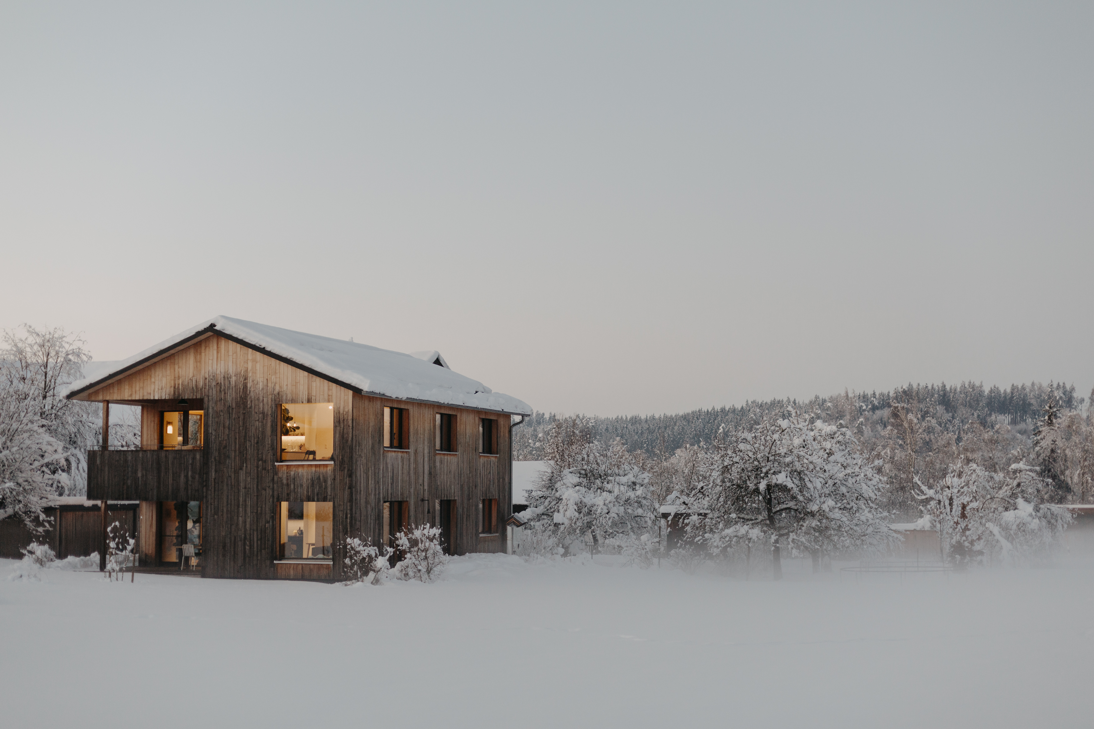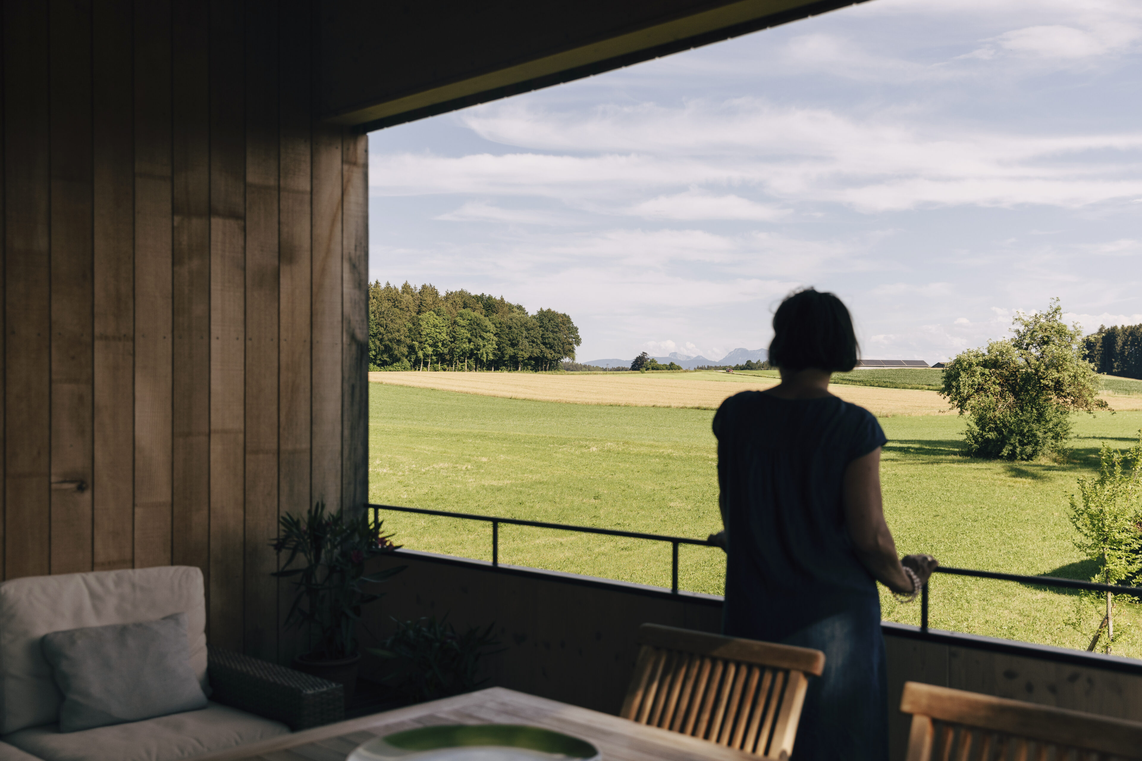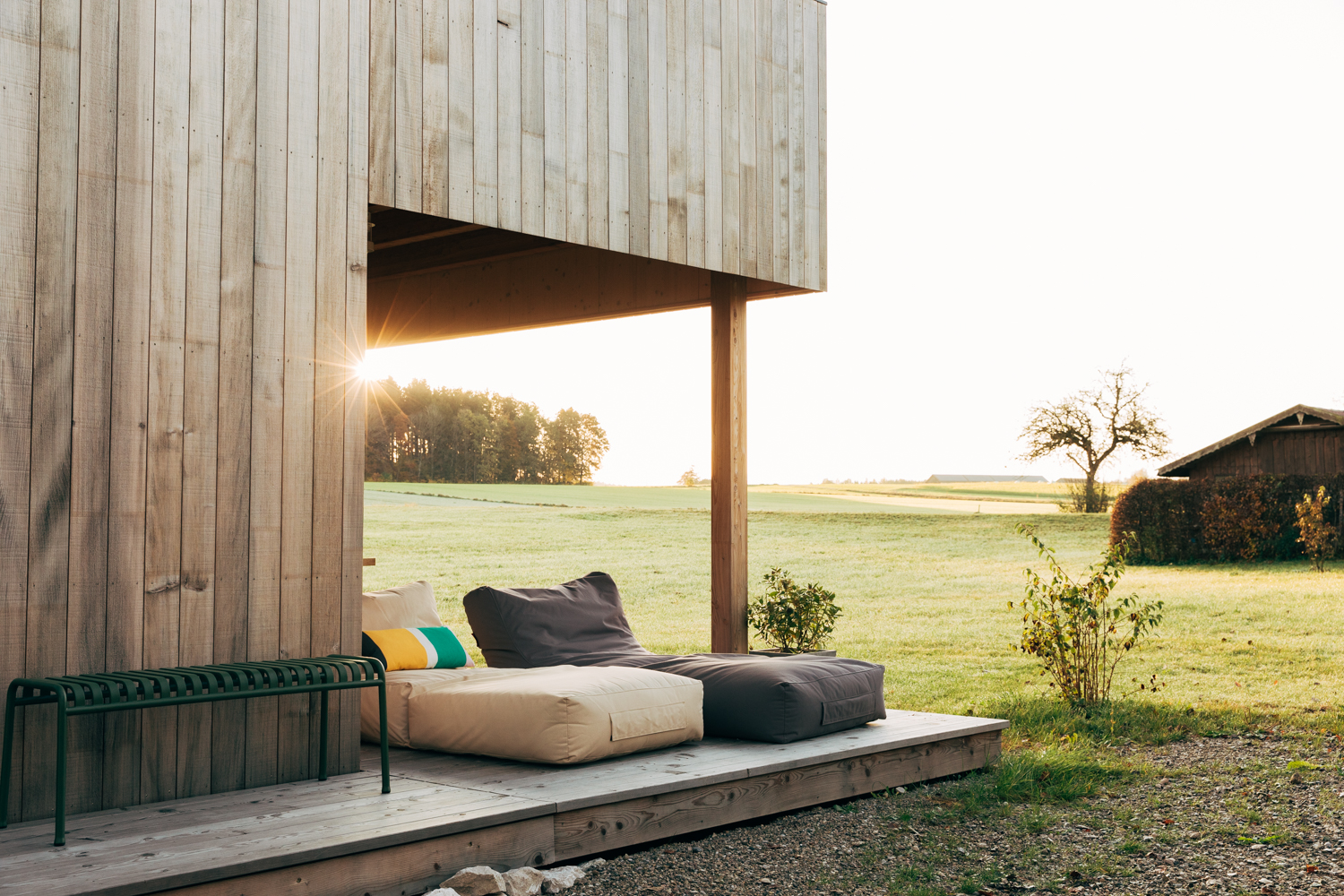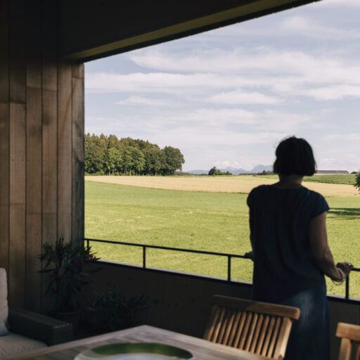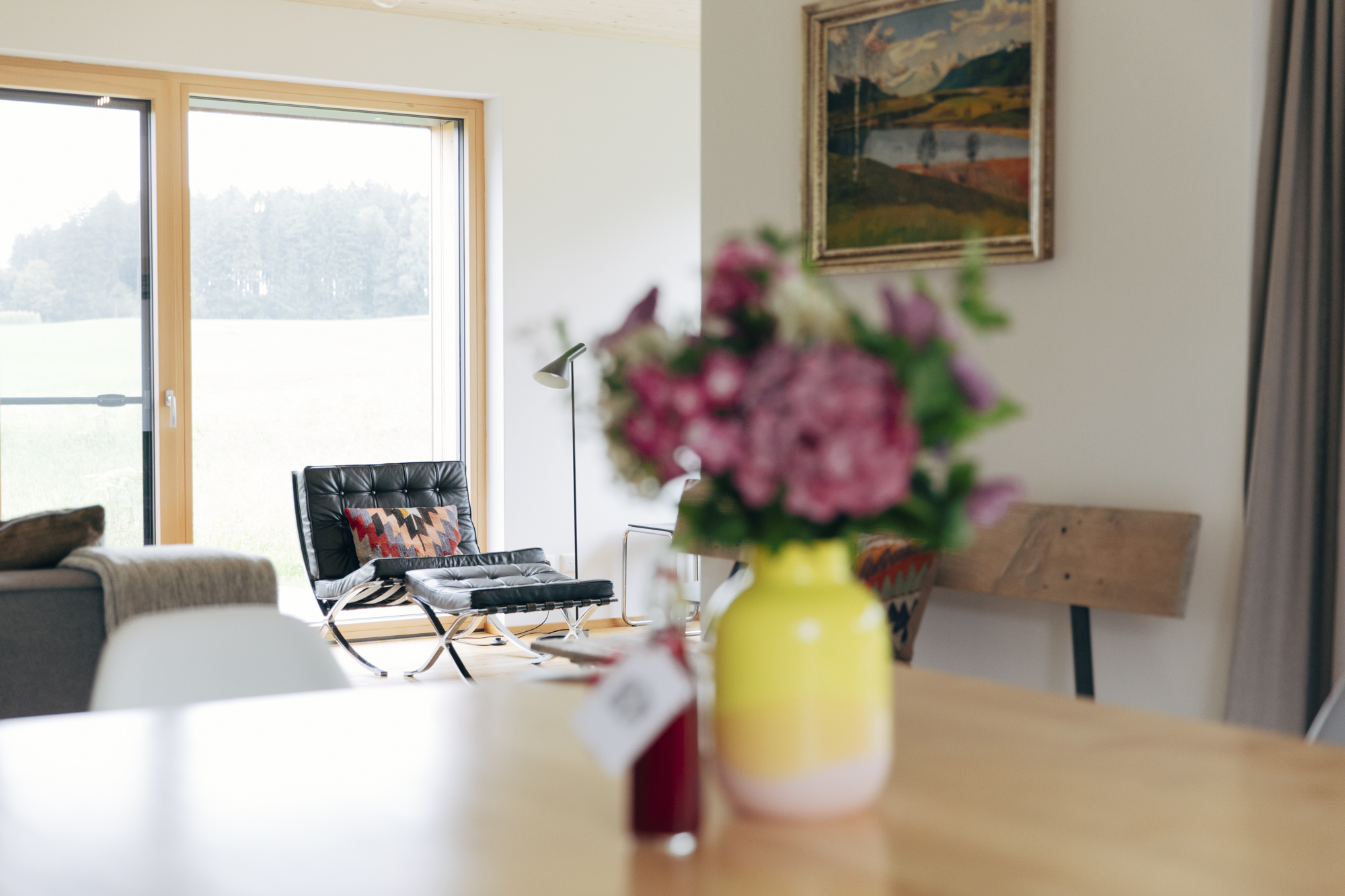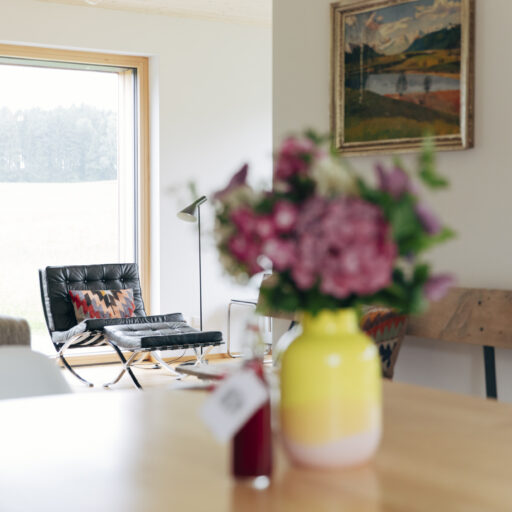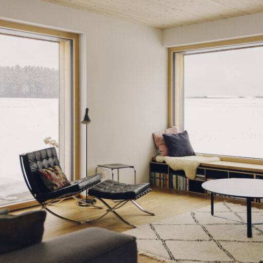 It’s the kind of welcome that immediately makes you feel at home: Depending on the season, homemade apricot strudel, freshly picked peonies, elderflower syrup or blackcurrant jam from the garden await guests. The Schmidhuber vacation home stands in the middle of an orchard full of gnarled apple trees, its simple geometric shape reminiscent of a typical barn from the area. The purist wooden house belongs to a historic farm on the outskirts of Tabing, a small village about three kilometers from the shores of Lake Chiemsee. The architect-designed passive house accommodates two modern vacation apartments, ‘Max’ on the first floor and ‘Kathi’ on the second floor. These are named after the last people to run the farm, the parents of host Daniela Niederbuchner, who also grew up there. As minimalist as the accommodation may appear from the outside, the interior is nothing short of cozy: The casual Barcelona chair sits side by side with the restored farmhouse table, steel meets wood, cozy home textiles compliment contemporary art—some of which was created by Daniela’s husband Christian Bauer (a painter and restorer) himself. They live together on the farm next door. The couple have close ties to the village and the region and are happy to share their enthusiasm with their guests—as well as the unobstructed view of the countryside. To really enjoy it, they have installed panoramic windows with seating in the apartments, offering unhampered views across the meadows to the edge of the forest. Sometimes, an early morning mist covers the landscape, from time to time, it’s carpeted in thick snow. Then there’s the wood anemones to be enjoyed in full bloom, framed by the mountain ridges in the distance bathed in a magical light. This is a place where you can be comfortable in any weather, always close to nature.