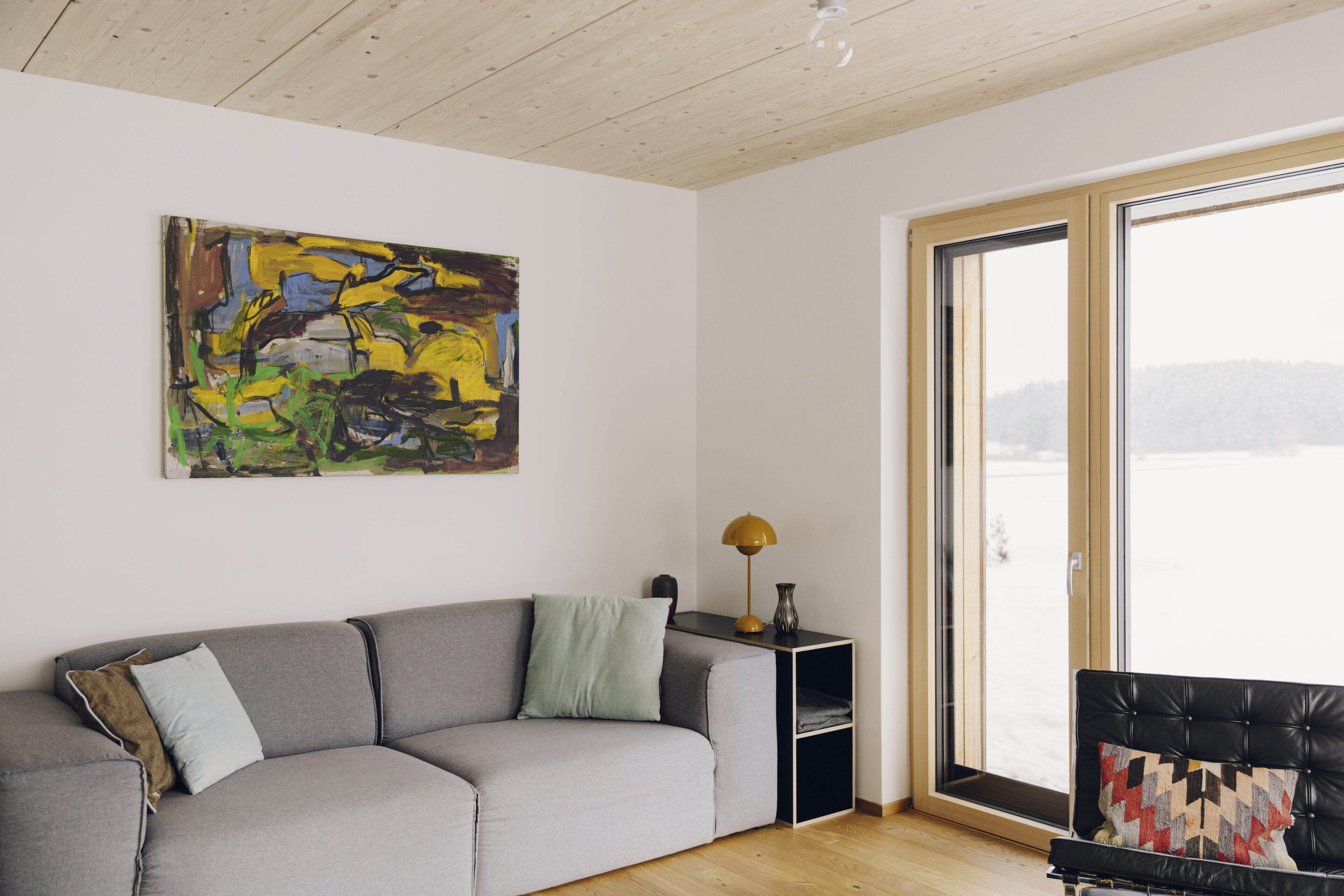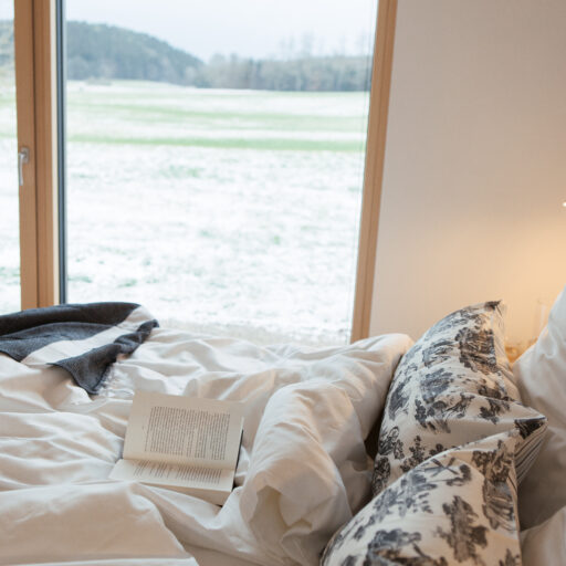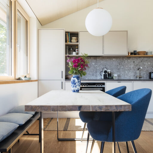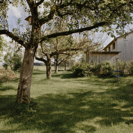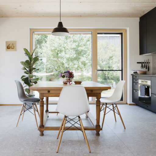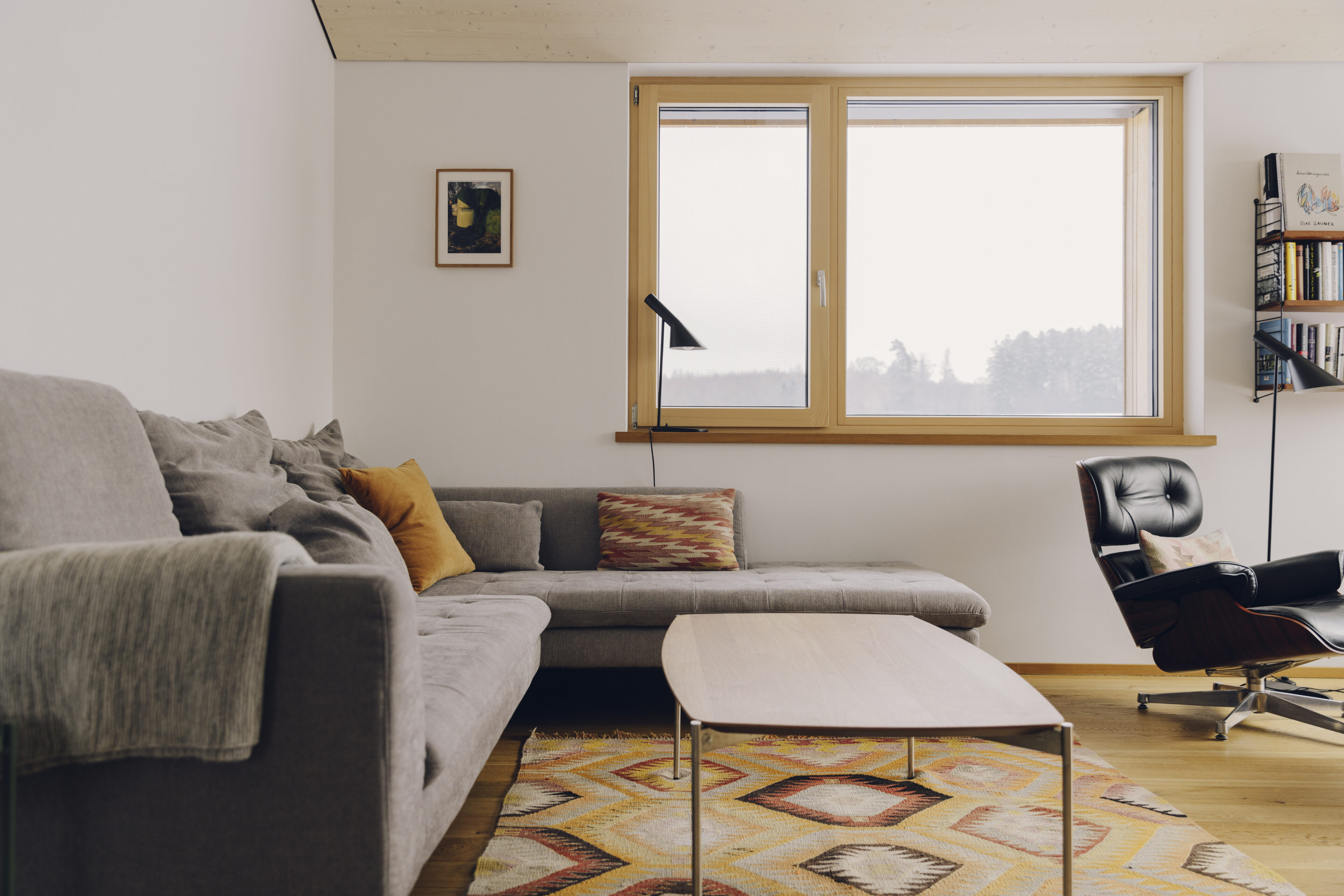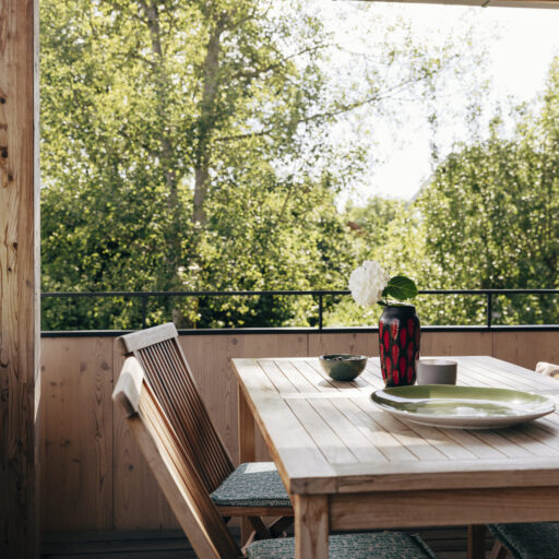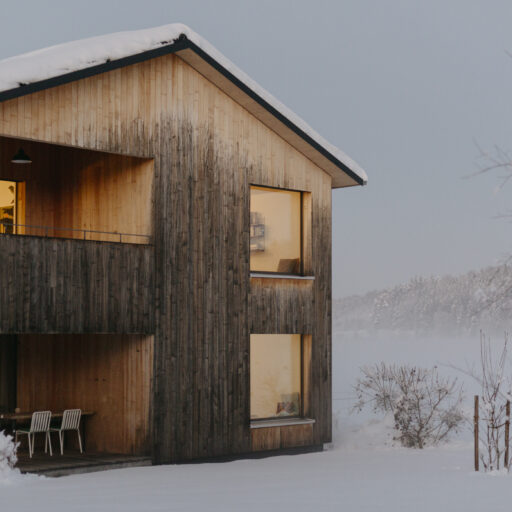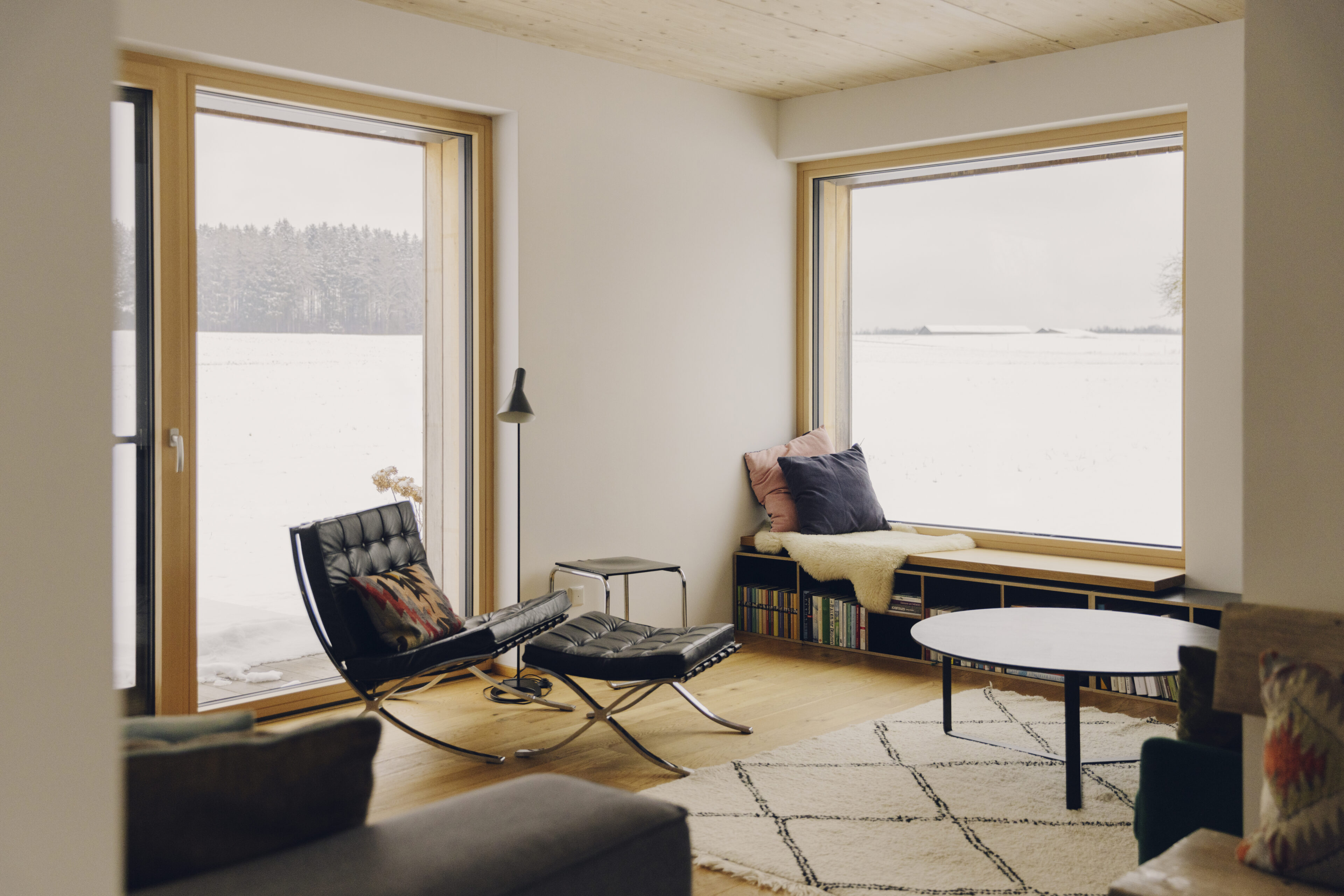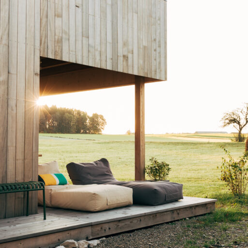 It’s the kind of welcome that immediately makes you feel at home: Depending on the season, homemade apricot strudel, freshly picked peonies, elderflower syrup or blackcurrant jam from the garden await guests. The Schmidhuber vacation home stands in the middle of an orchard full of gnarled apple trees, its simple geometric shape reminiscent of a typical barn from the area. The purist wooden house belongs to a historic farm on the outskirts of Tabing, a small village about three kilometers from the shores of Lake Chiemsee. The architect-designed passive house accommodates two modern vacation apartments, ‘Max’ on the first floor and ‘Kathi’ on the second floor. These are named after the last people to run the farm, the parents of host Daniela Niederbuchner, who also grew up there. As minimalist as the accommodation may appear from the outside, the interior is nothing short of cozy: The casual Barcelona chair sits side by side with the restored farmhouse table, steel meets wood, cozy home textiles compliment contemporary art—some of which was created by Daniela’s husband Christian Bauer (a painter and restorer) himself. They live together on the farm next door. The couple have close ties to the village and the region and are happy to share their enthusiasm with their guests—as well as the unobstructed view of the countryside. To really enjoy it, they have installed panoramic windows with seating in the apartments, offering unhampered views across the meadows to the edge of the forest. Sometimes, an early morning mist covers the landscape, from time to time, it’s carpeted in thick snow. Then there’s the wood anemones to be enjoyed in full bloom, framed by the mountain ridges in the distance bathed in a magical light. This is a place where you can be comfortable in any weather, always close to nature.