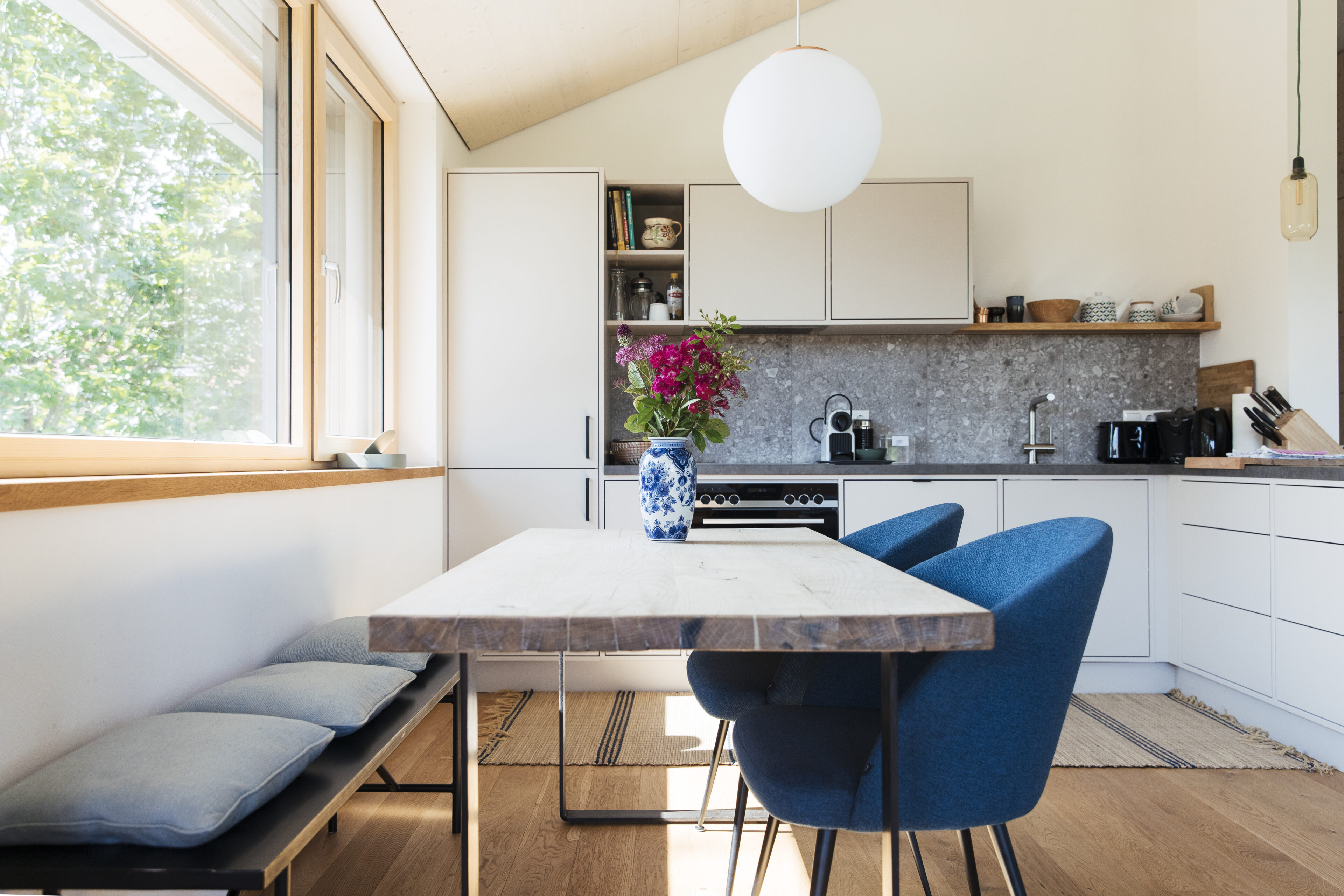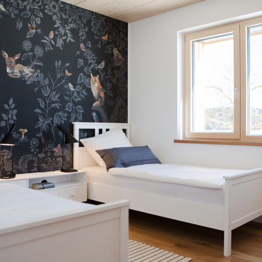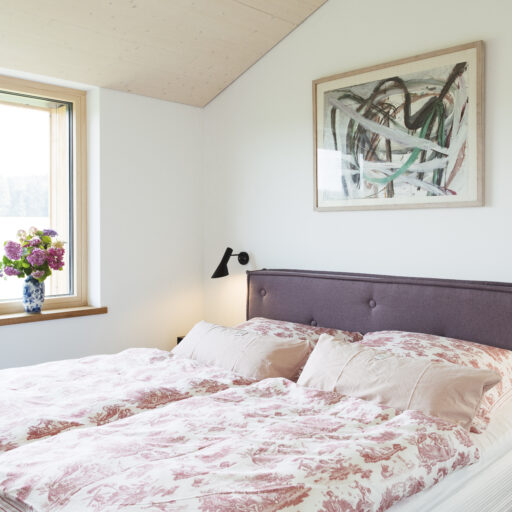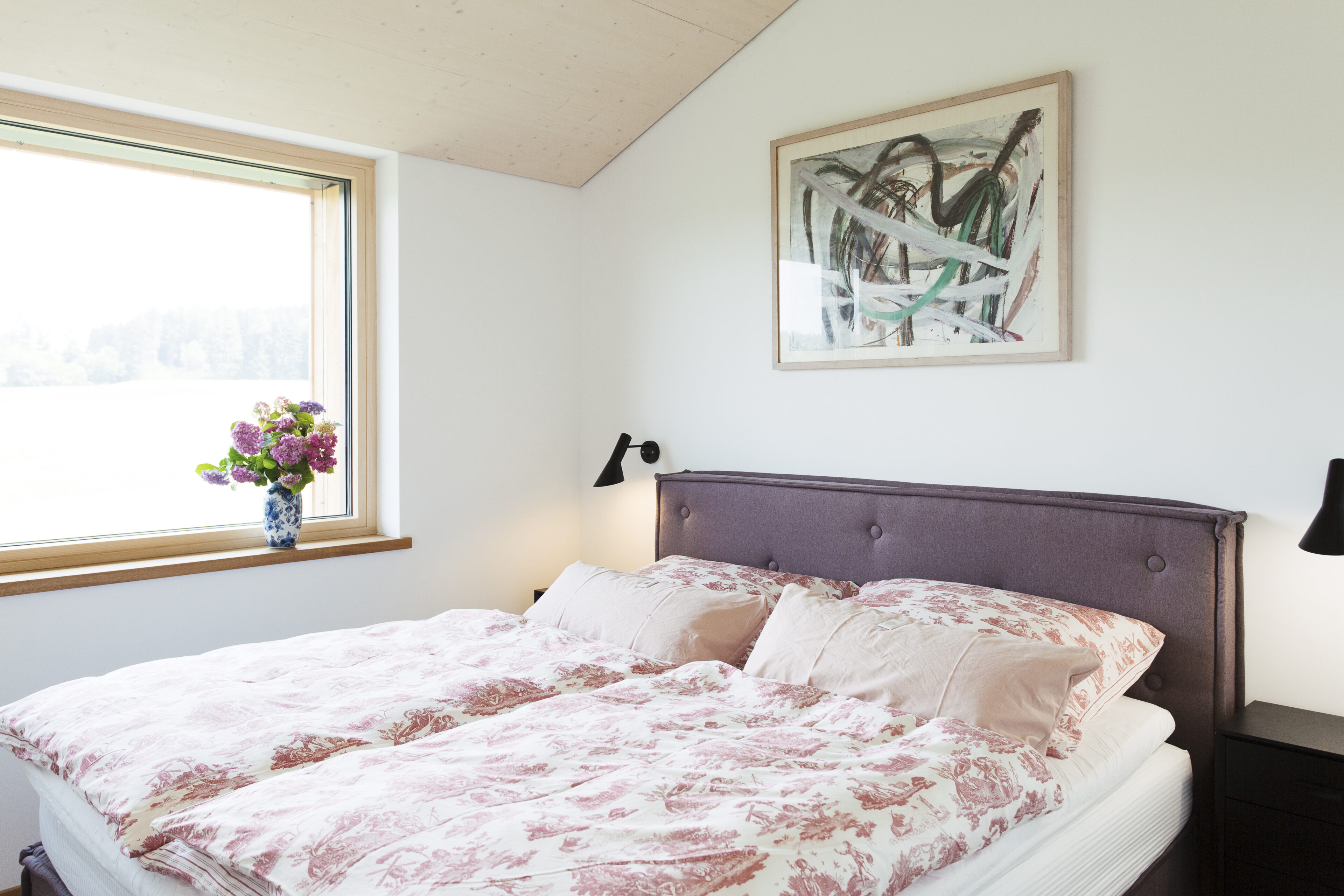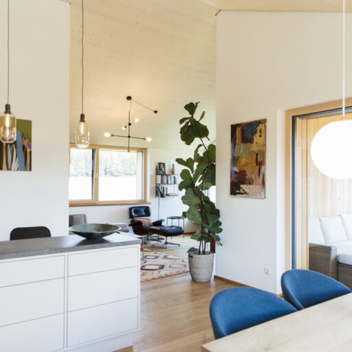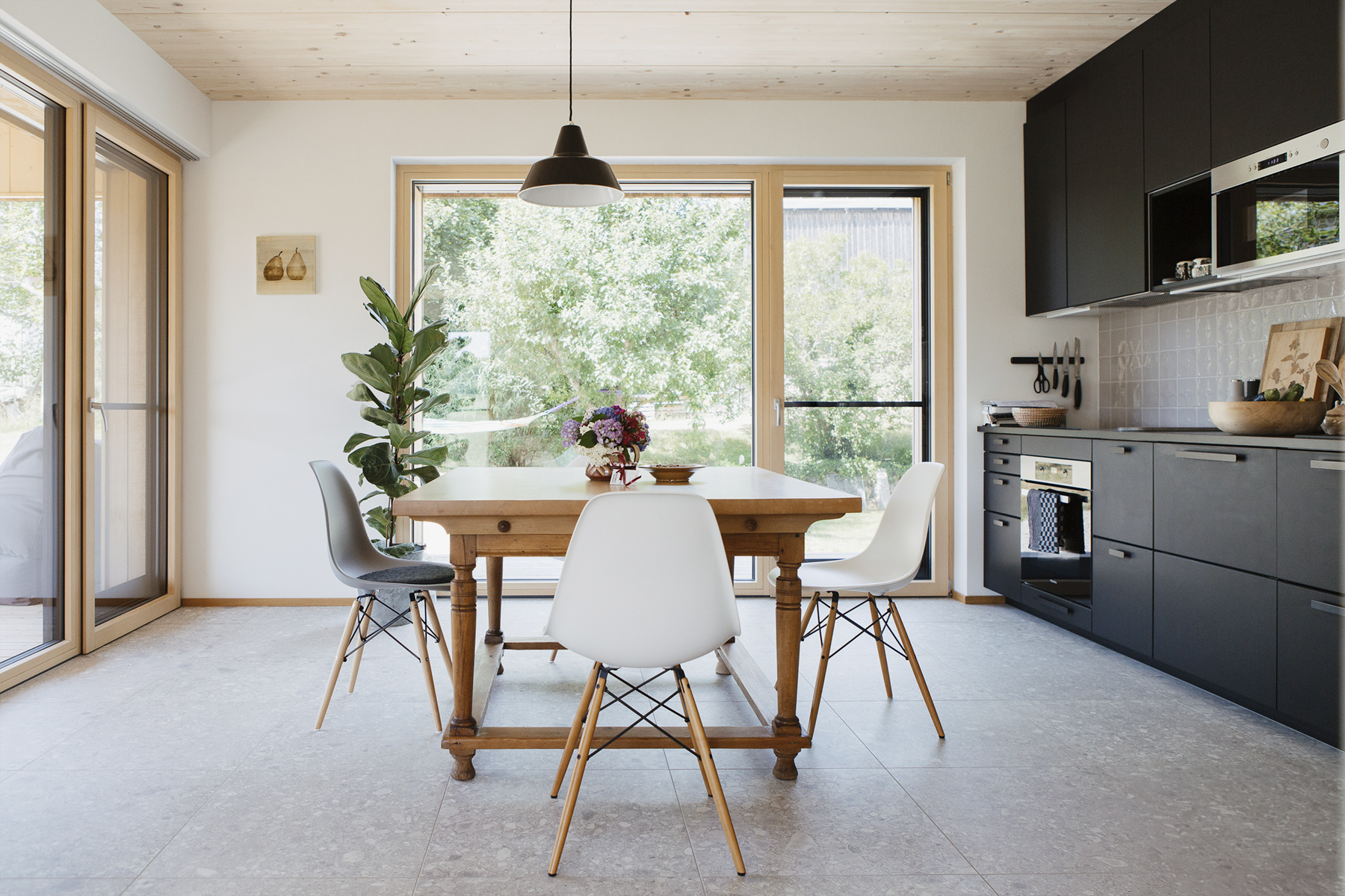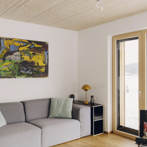 It’s the kind of welcome that immediately makes you feel at home: Depending on the season, homemade apricot strudel, freshly picked peonies, elderflower syrup or blackcurrant jam from the garden await guests. The Schmidhuber vacation home stands in the middle of an orchard full of gnarled apple trees, its simple geometric shape reminiscent of a typical barn from the area. The purist wooden house belongs to a historic farm on the outskirts of Tabing, a small village about three kilometers from the shores of Lake Chiemsee. The architect-designed passive house accommodates two modern vacation apartments, ‘Max’ on the first floor and ‘Kathi’ on the second floor. These are named after the last people to run the farm, the parents of host Daniela Niederbuchner, who also grew up there. As minimalist as the accommodation may appear from the outside, the interior is nothing short of cozy: The casual Barcelona chair sits side by side with the restored farmhouse table, steel meets wood, cozy home textiles compliment contemporary art—some of which was created by Daniela’s husband Christian Bauer (a painter and restorer) himself. They live together on the farm next door. The couple have close ties to the village and the region and are happy to share their enthusiasm with their guests—as well as the unobstructed view of the countryside. To really enjoy it, they have installed panoramic windows with seating in the apartments, offering unhampered views across the meadows to the edge of the forest. Sometimes, an early morning mist covers the landscape, from time to time, it’s carpeted in thick snow. Then there’s the wood anemones to be enjoyed in full bloom, framed by the mountain ridges in the distance bathed in a magical light. This is a place where you can be comfortable in any weather, always close to nature.