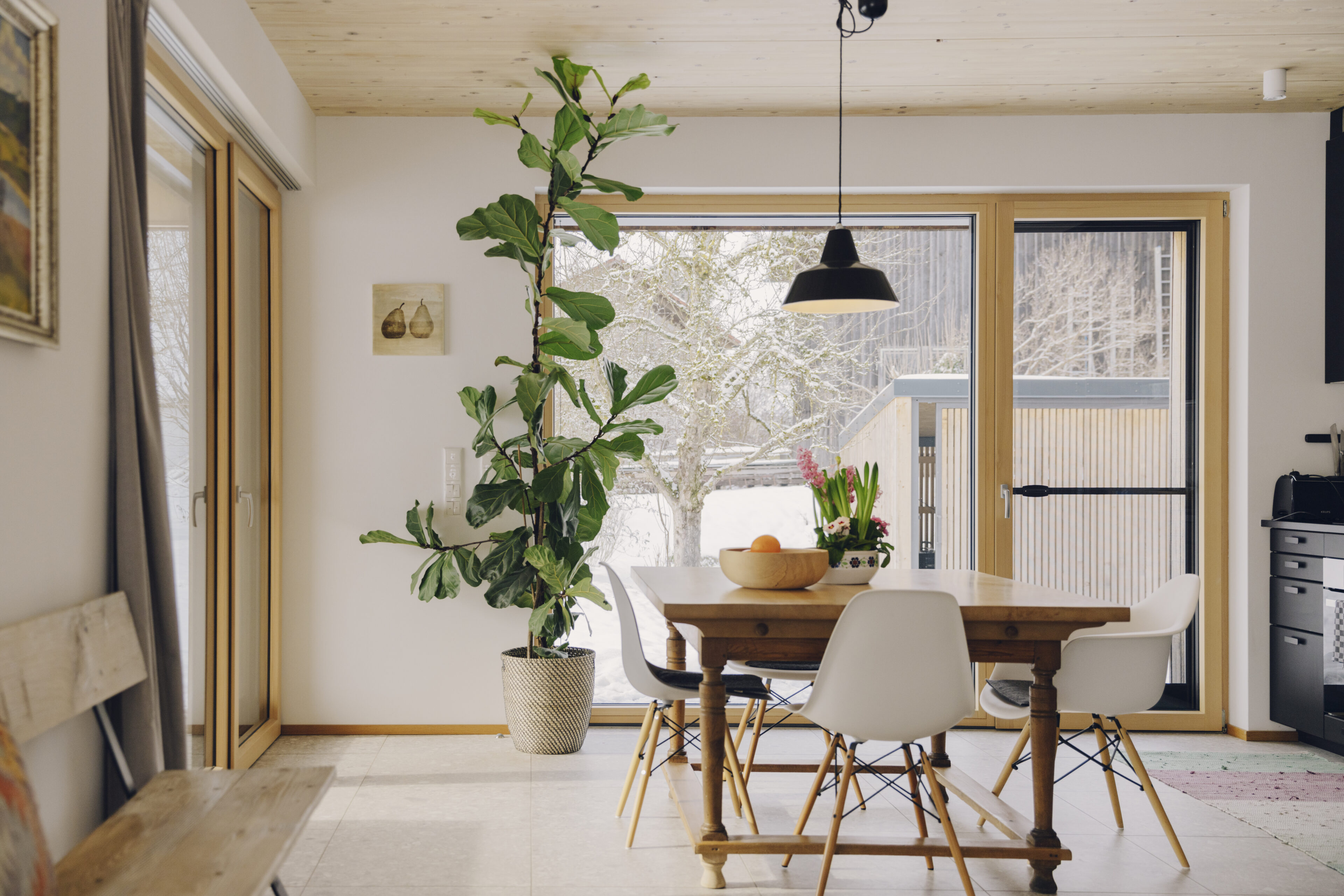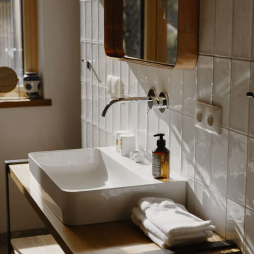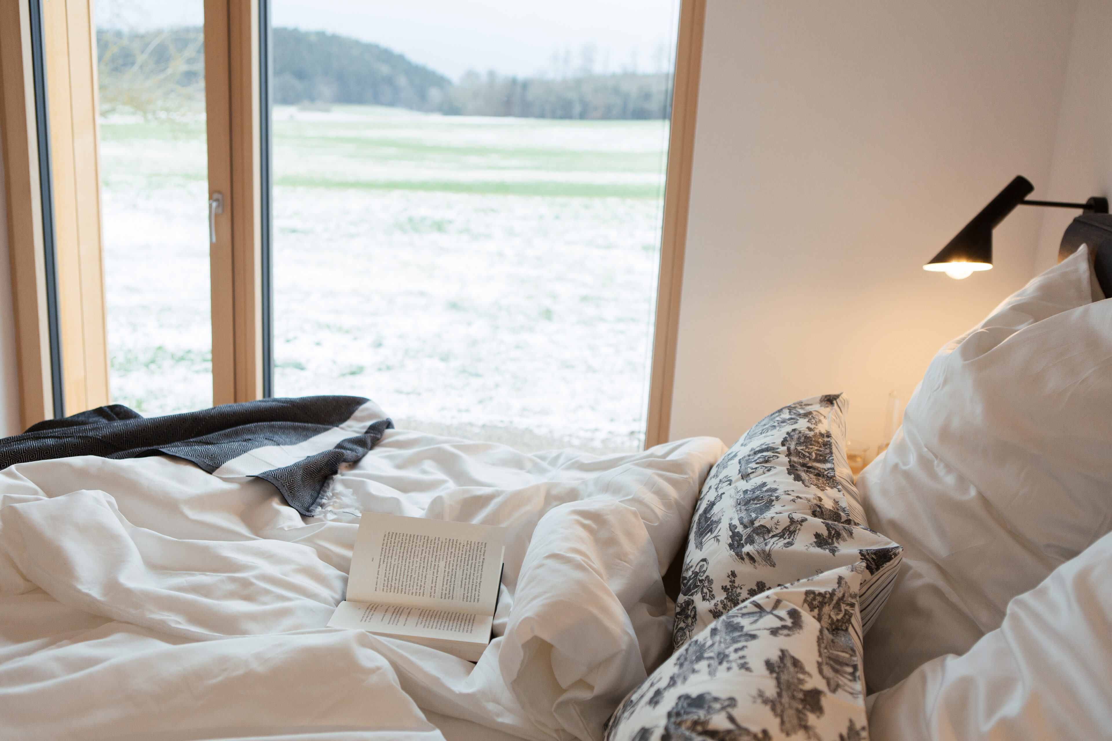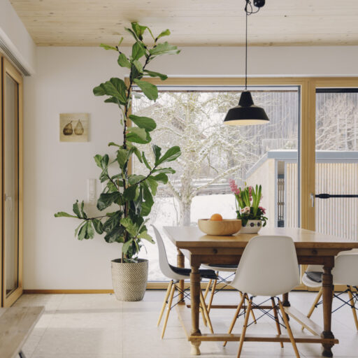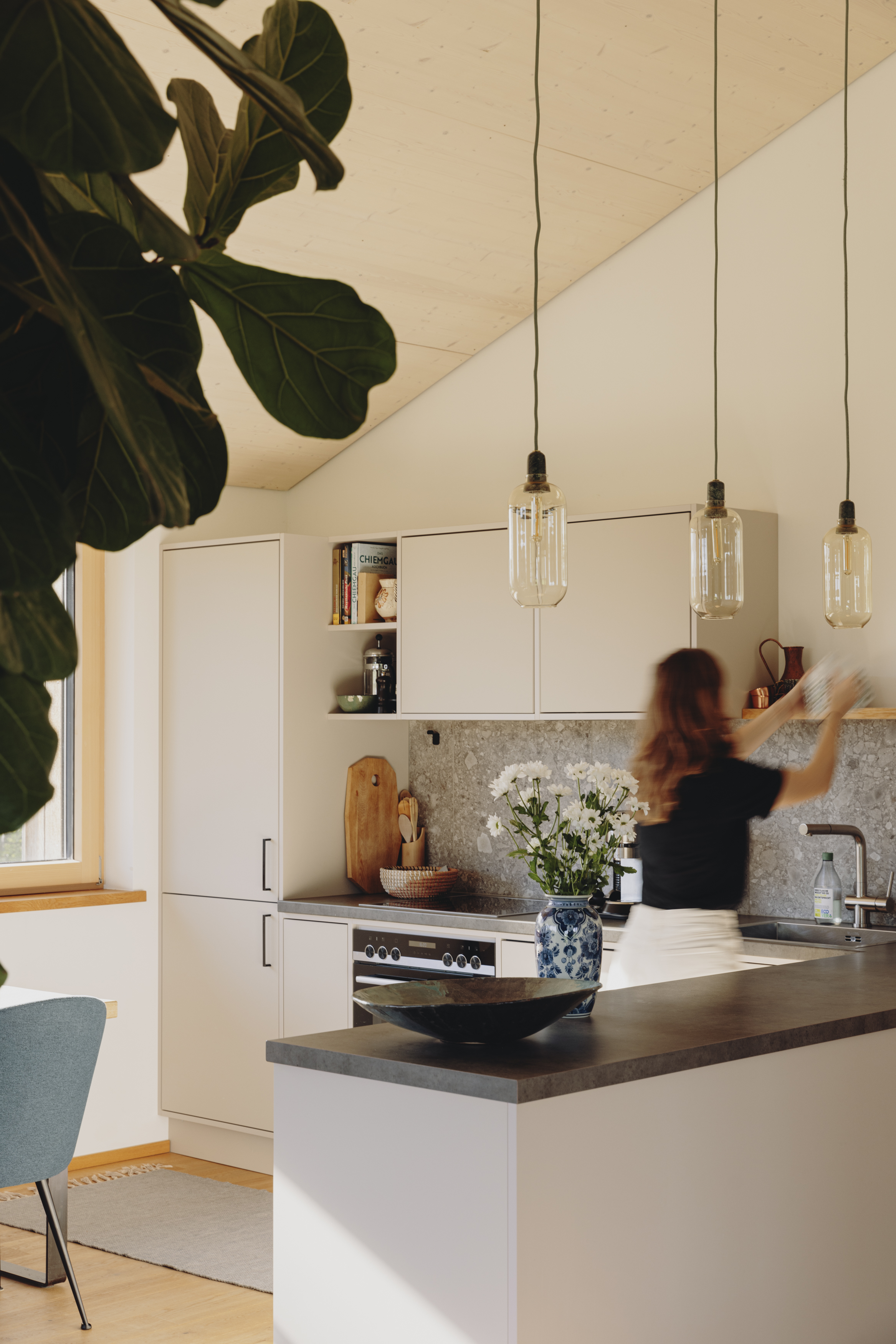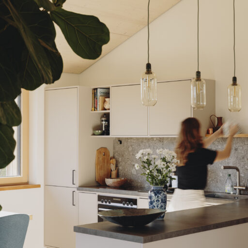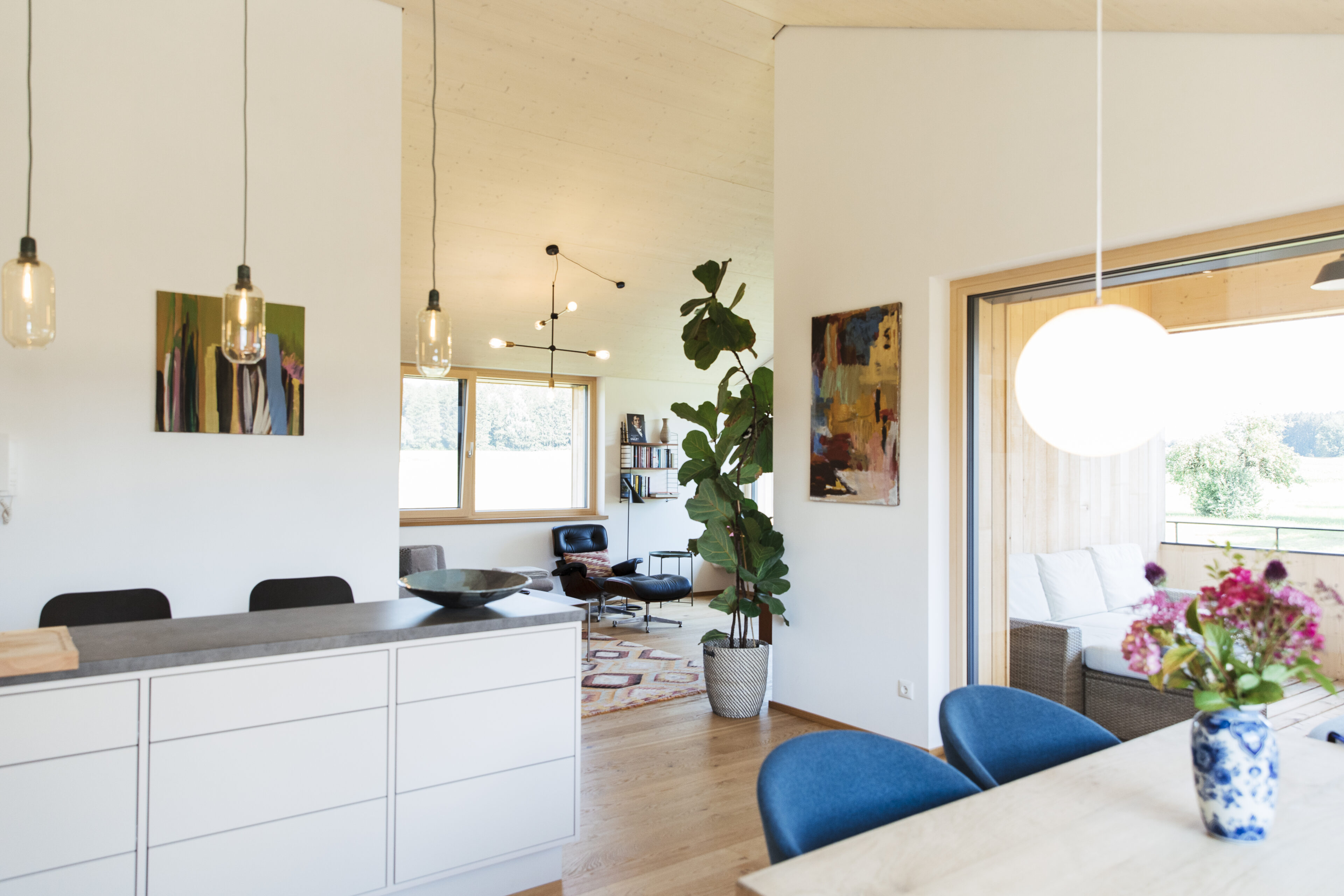 It’s the kind of welcome that immediately makes you feel at home: Depending on the season, homemade apricot strudel, freshly picked peonies, elderflower syrup or blackcurrant jam from the garden await guests. The Schmidhuber vacation home stands in the middle of an orchard full of gnarled apple trees, its simple geometric shape reminiscent of a typical barn from the area. The purist wooden house belongs to a historic farm on the outskirts of Tabing, a small village about three kilometers from the shores of Lake Chiemsee. The architect-designed passive house accommodates two modern vacation apartments, ‘Max’ on the first floor and ‘Kathi’ on the second floor. These are named after the last people to run the farm, the parents of host Daniela Niederbuchner, who also grew up there. As minimalist as the accommodation may appear from the outside, the interior is nothing short of cozy: The casual Barcelona chair sits side by side with the restored farmhouse table, steel meets wood, cozy home textiles compliment contemporary art—some of which was created by Daniela’s husband Christian Bauer (a painter and restorer) himself. They live together on the farm next door. The couple have close ties to the village and the region and are happy to share their enthusiasm with their guests—as well as the unobstructed view of the countryside. To really enjoy it, they have installed panoramic windows with seating in the apartments, offering unhampered views across the meadows to the edge of the forest. Sometimes, an early morning mist covers the landscape, from time to time, it’s carpeted in thick snow. Then there’s the wood anemones to be enjoyed in full bloom, framed by the mountain ridges in the distance bathed in a magical light. This is a place where you can be comfortable in any weather, always close to nature.
