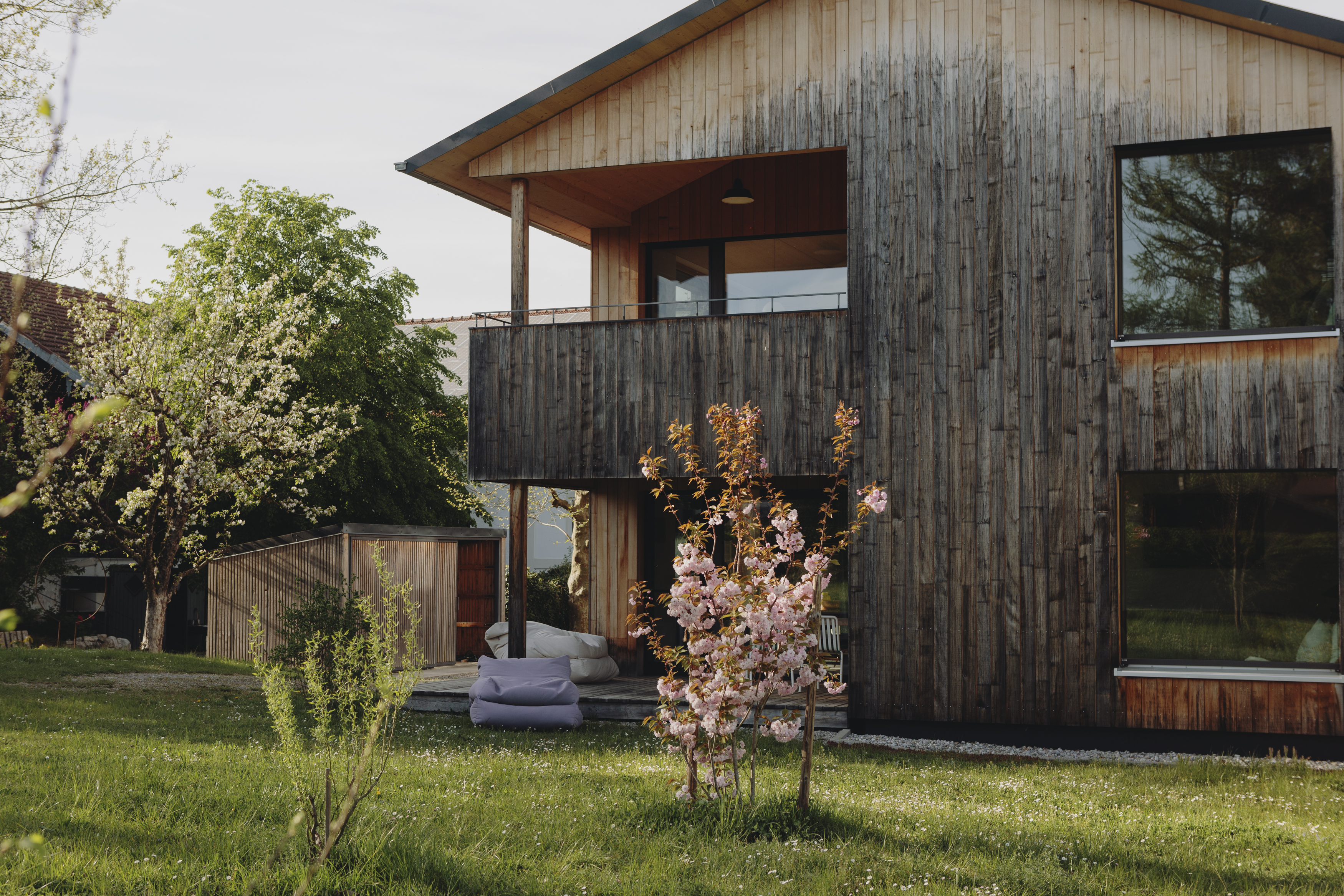 - The white fir wood façade from the region is a deliberate choice designed to set the house apart from the old farmhouse. The old outbuilding of the historic farm has been replaced by modern wooden architecture.